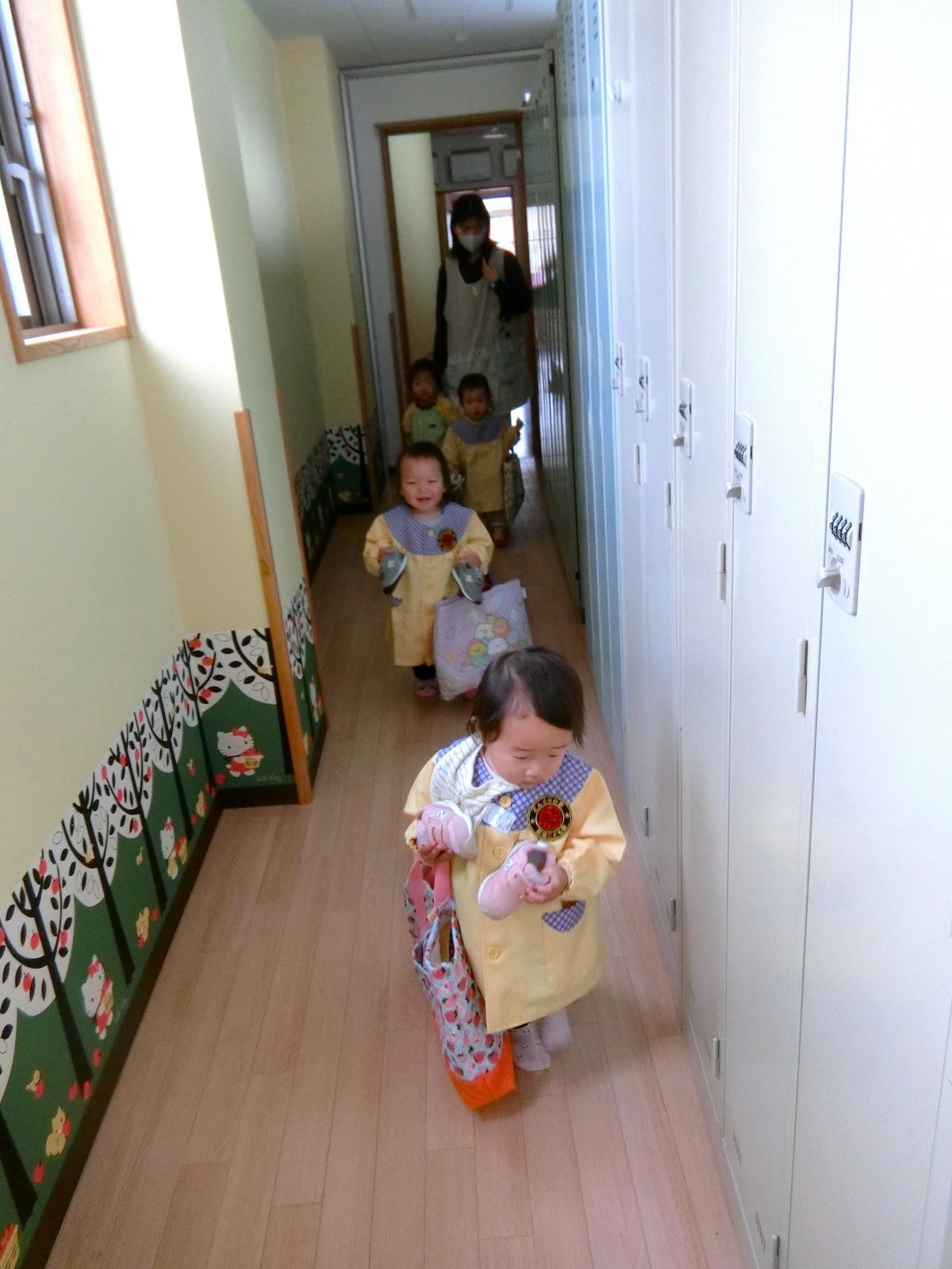 なが~い廊下を自分で鞄と靴を持って一生懸命移動します!