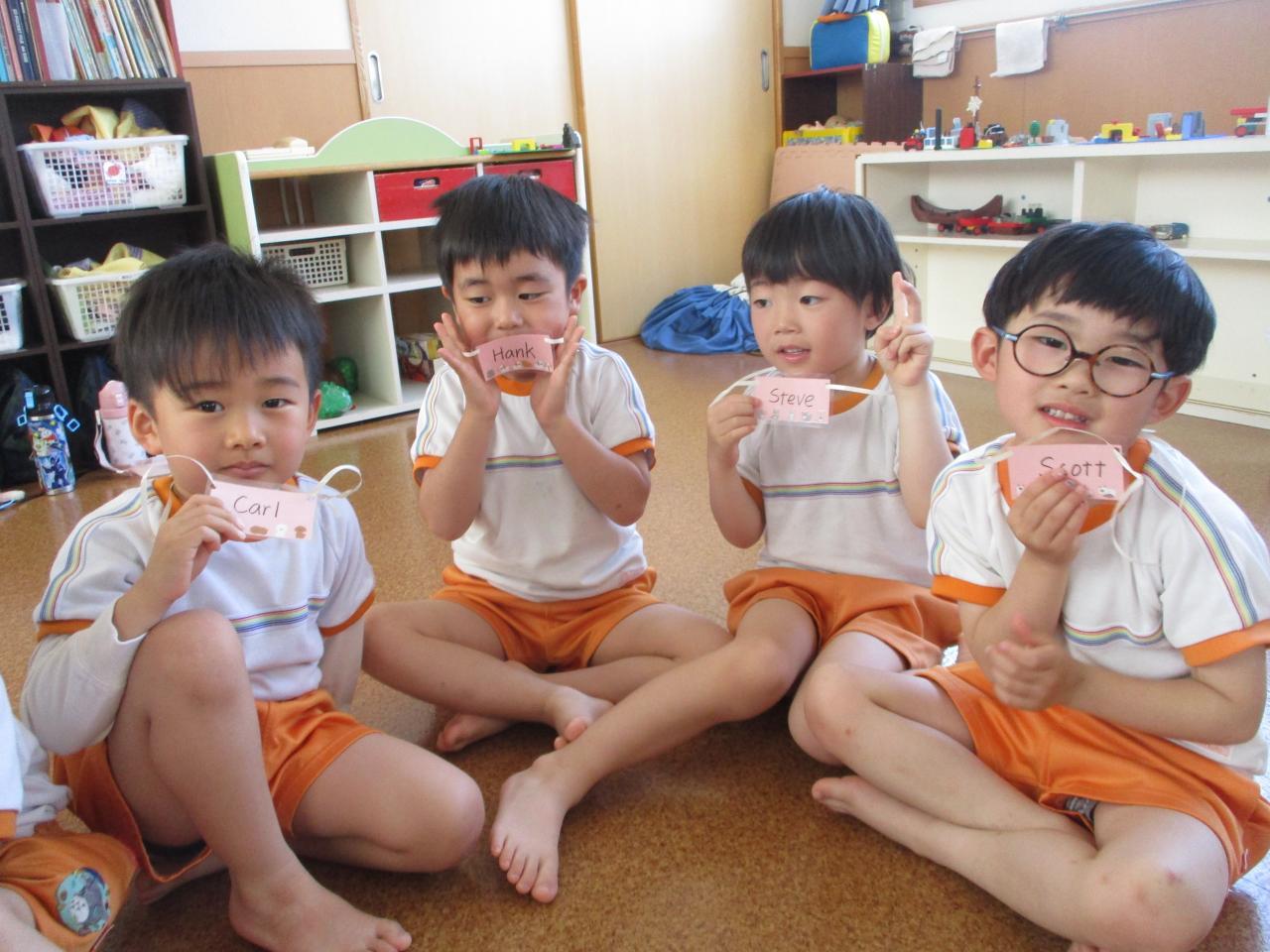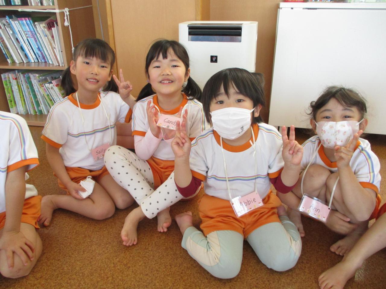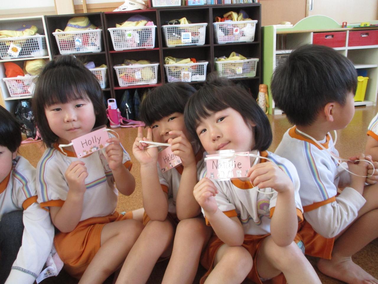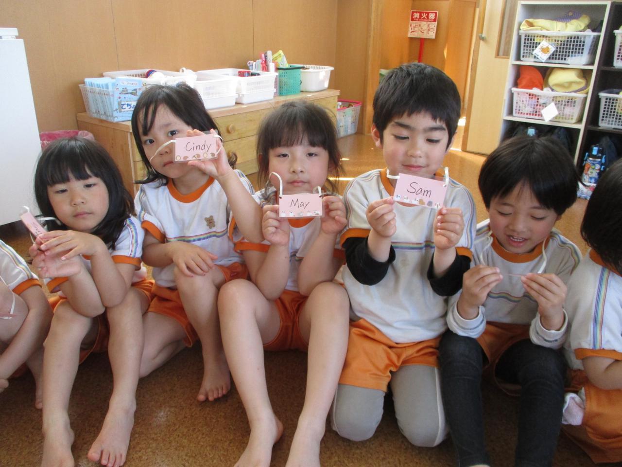挨拶のあとに先生から、英語のニックネームが書かれた名札をもらいました。一人ひとり名前とニックネームを呼ばれ、先生の"Here you are"(どうぞ)に対し、"Thank you"と英語で返していきました。🌟