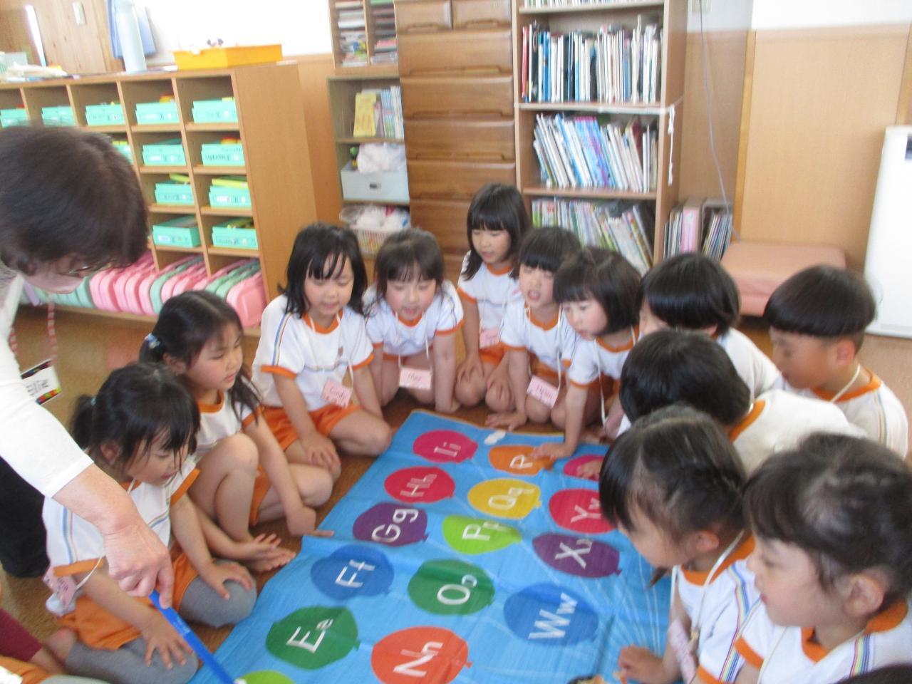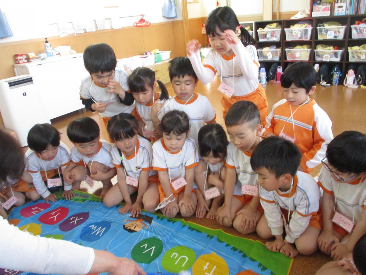 なので、その後の英語での「船長さんの命令」や「じゃんけん列車」などの遊びも楽しみ、英語を話していました。アルファベット表にも興味津々でみんな食い入るように見ていました。
