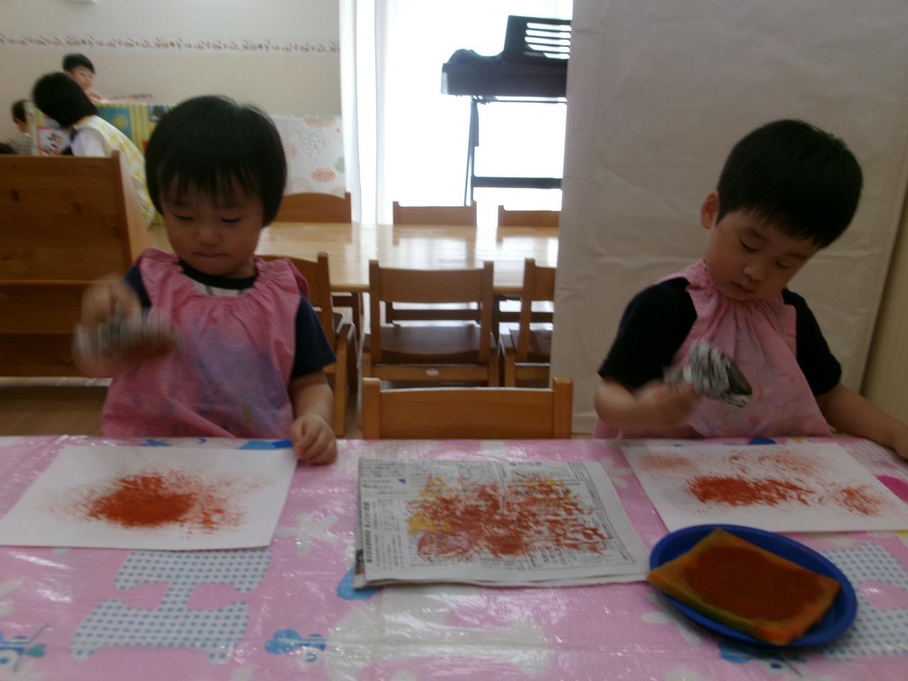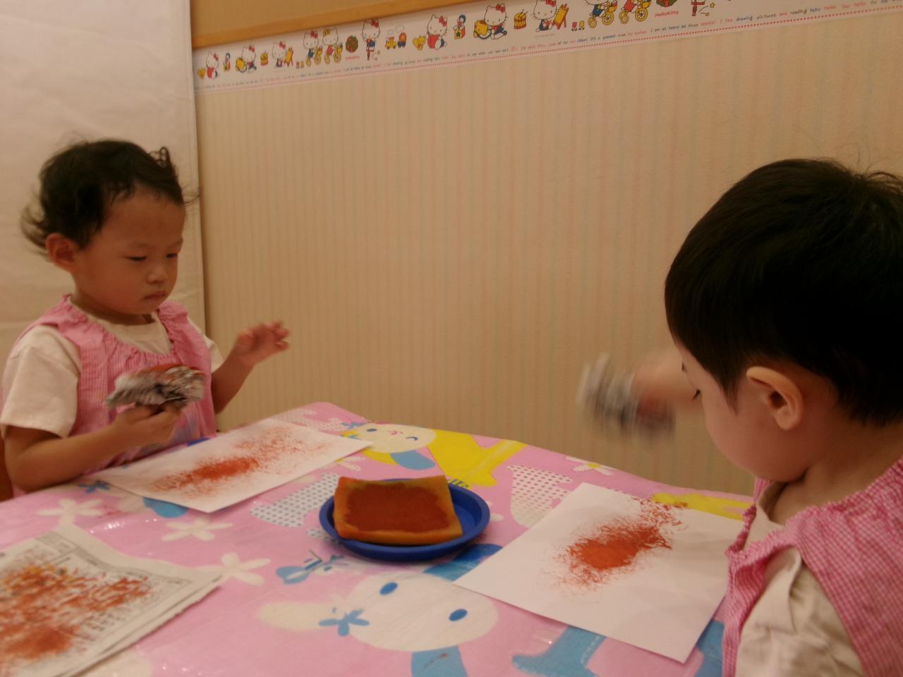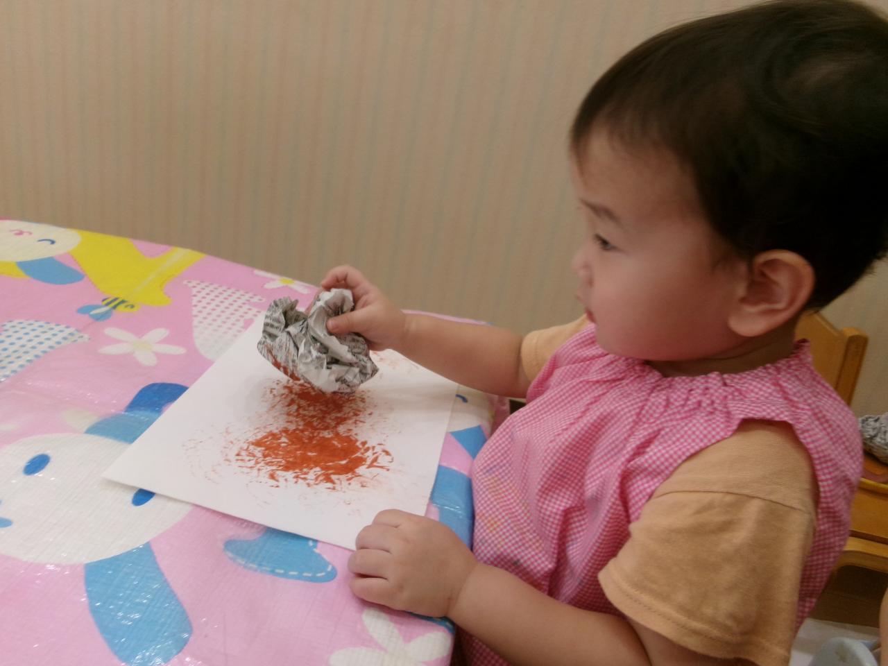 まずは、栗作りで新聞紙を使ってスタンプをしていきました(*^o^*)