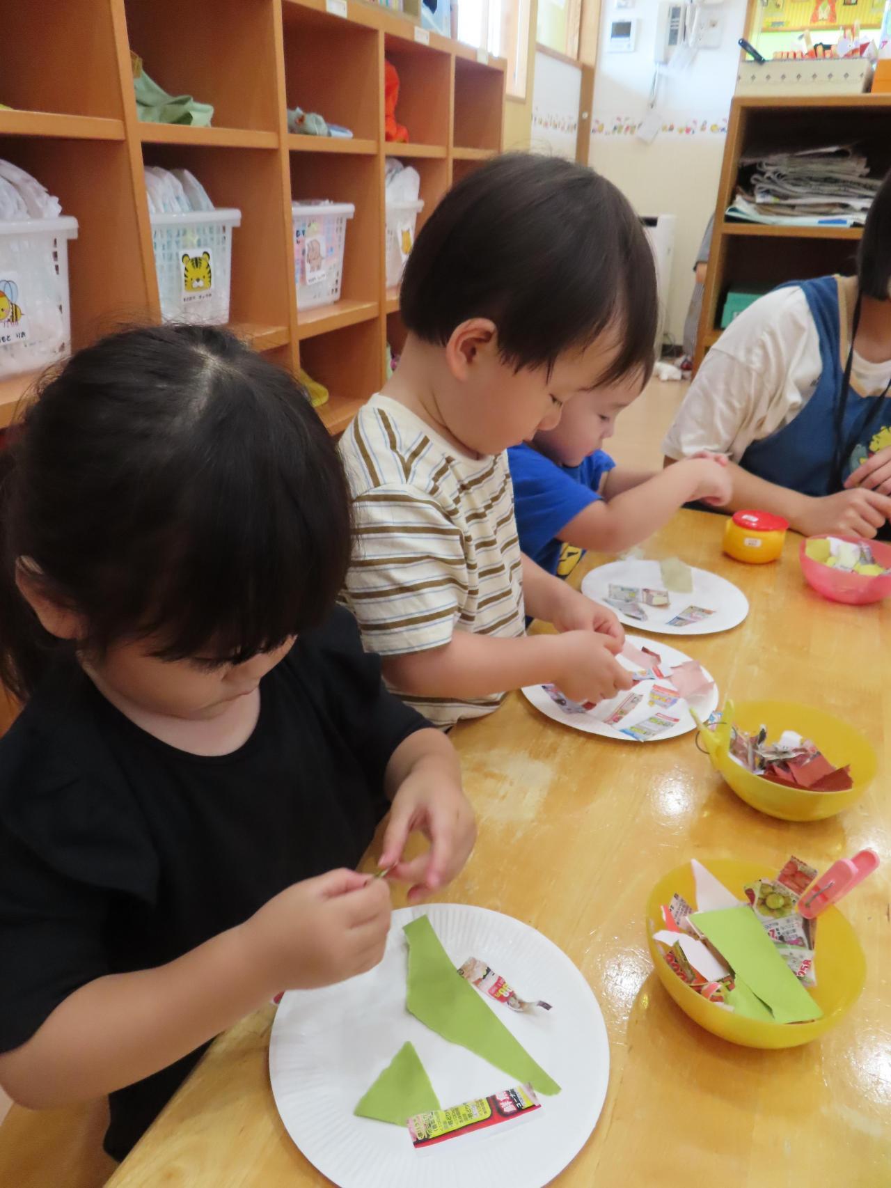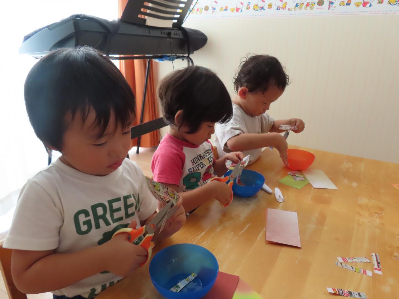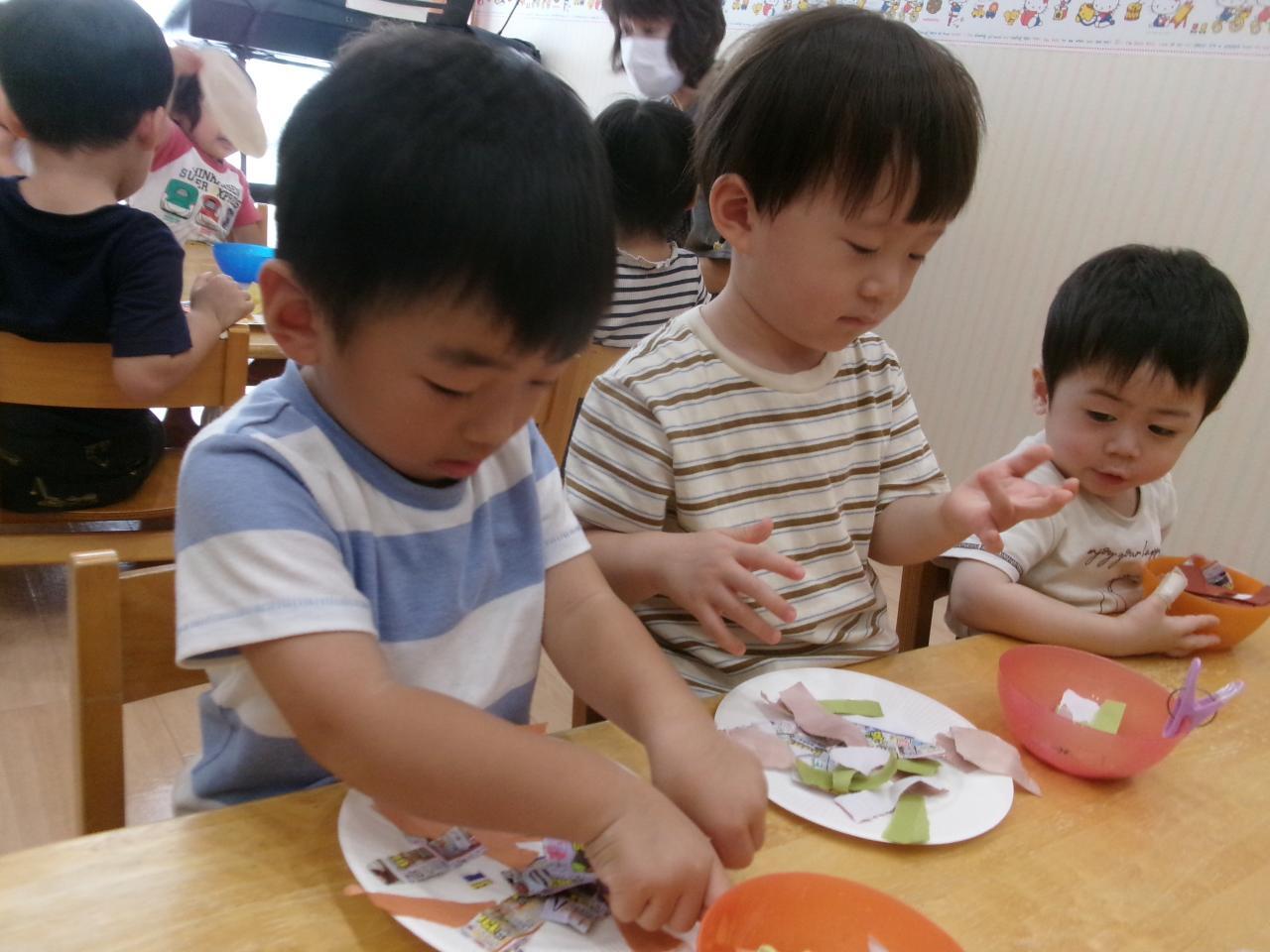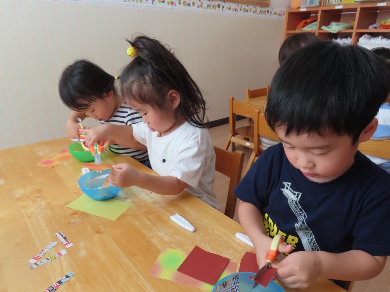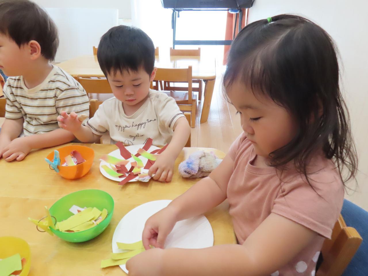 高月齢児は連続切りができるようになったのでハサミで行ない、低月齢児はまだ難しいので紙破りをして作っていきました!