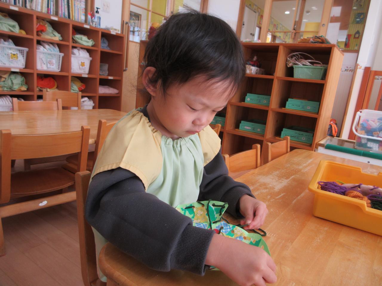 1つ通した後は、横の穴に通すということが難しく、皆苦戦している様子でしたが、諦めずに最後まで頑張り、一人一人個性豊かな手袋が完成しました👏👏