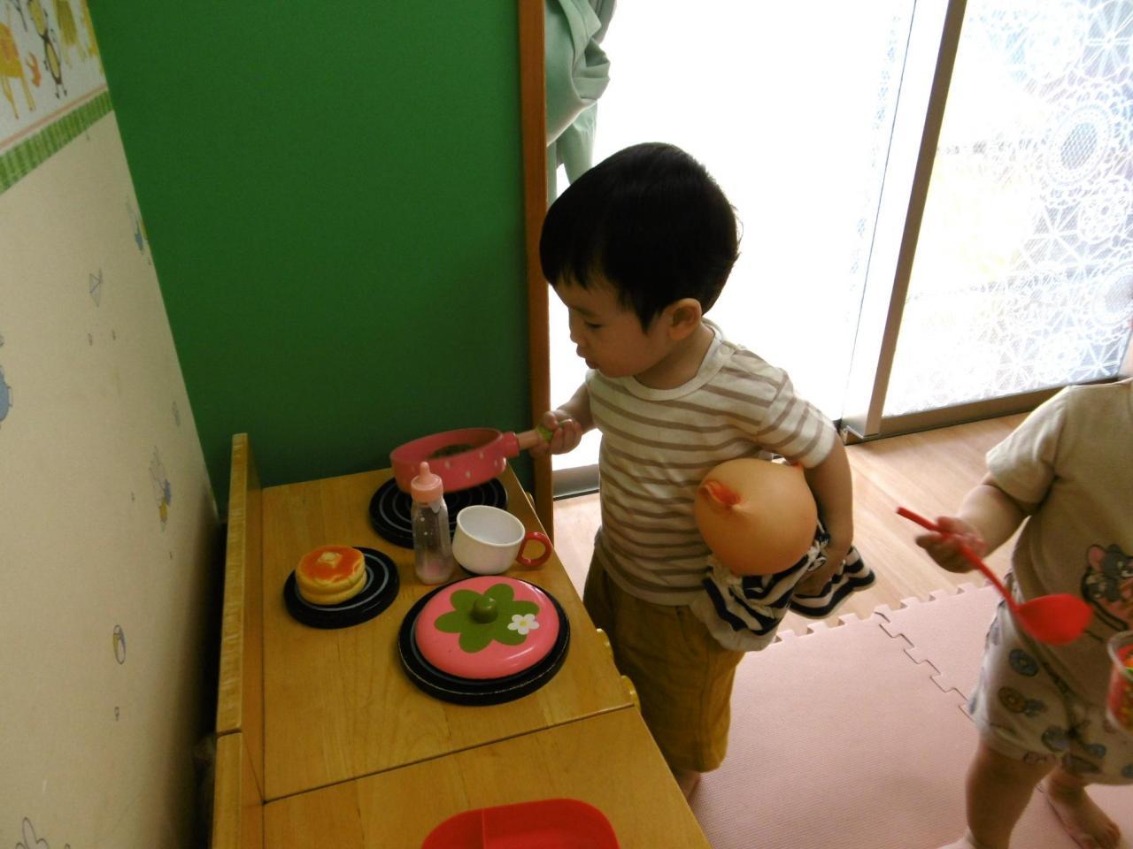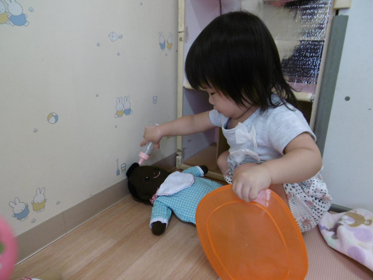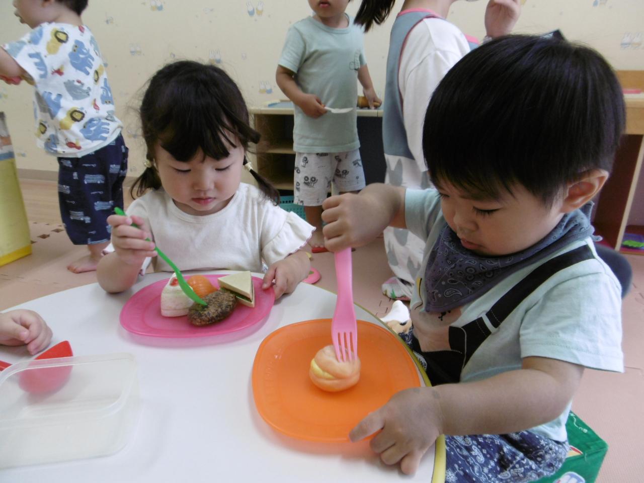 赤ちゃんのお世話では、赤ちゃんにミルクをあげたり、抱っこしてあげたり、お皿にご飯を入れて、スプーンやフォークで食べたり、まな板の上で包丁を使って、野菜を切ったりとそれぞれに見立てながら、ごっこ遊びをとても上手にしている姿がみられます✨