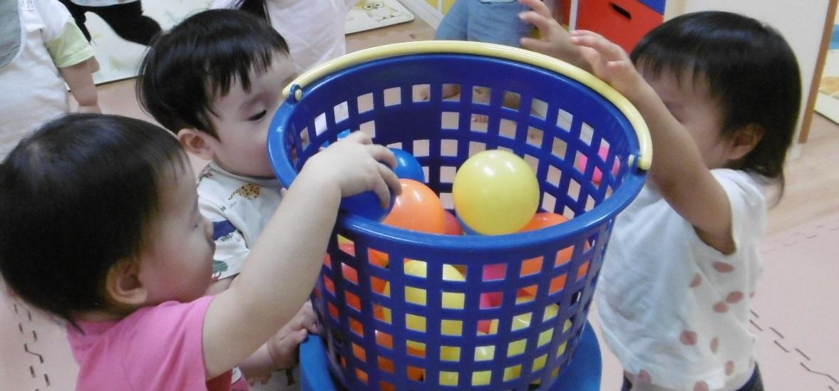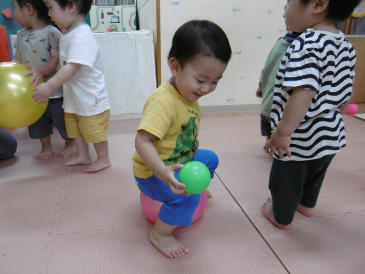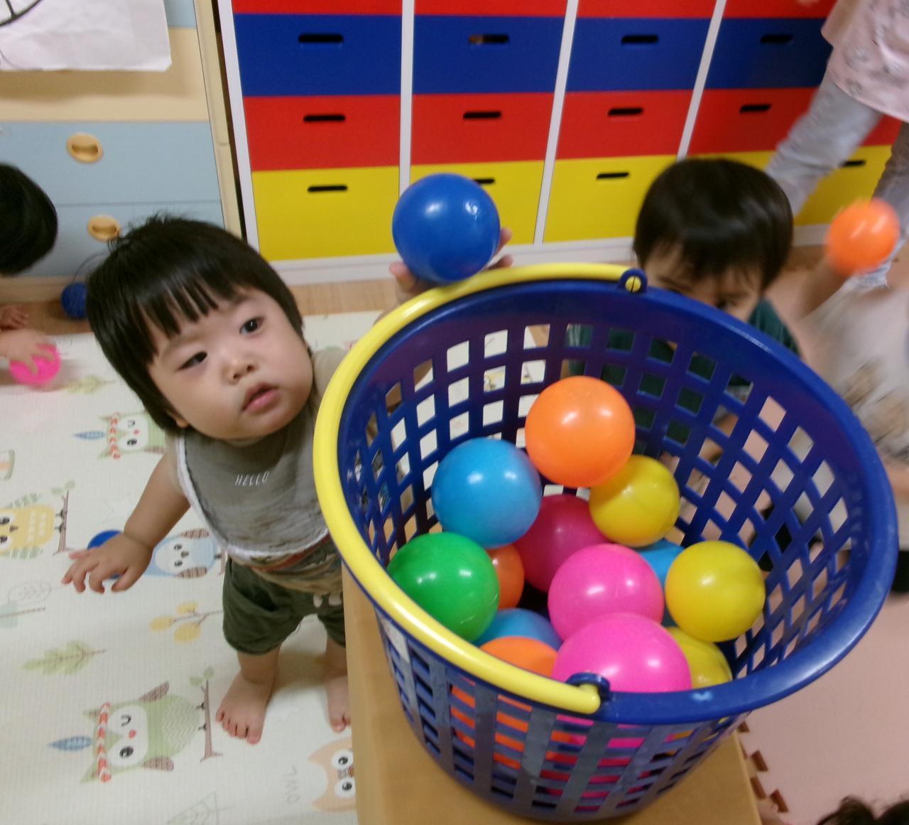 ボール遊びでは、投げる、集める、拾う、転がすなどさまざまな動きの中で思う存分に楽しみます😝