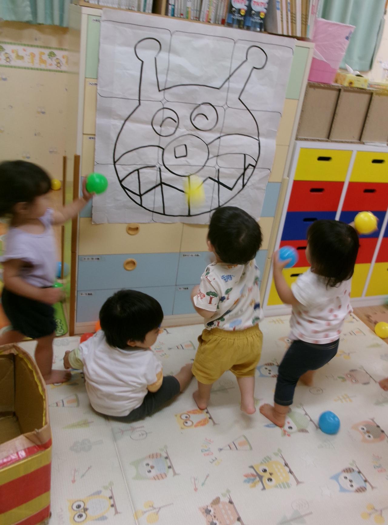 カゴを少し高い所に設置し、玉入れのようにしてみたり、的当てに向かって投げます💪カゴのボールがいっぱいになったら、上から雨のようにしてボールが降ってくるのが大好きなたんぽぽ組さん🤩🙌