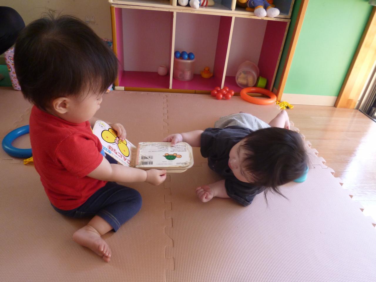 最近のさくら組さんはお友達の存在に気づき、一緒に遊んだり時に取り合いするようになってきました❗