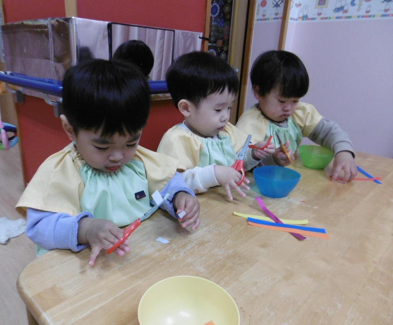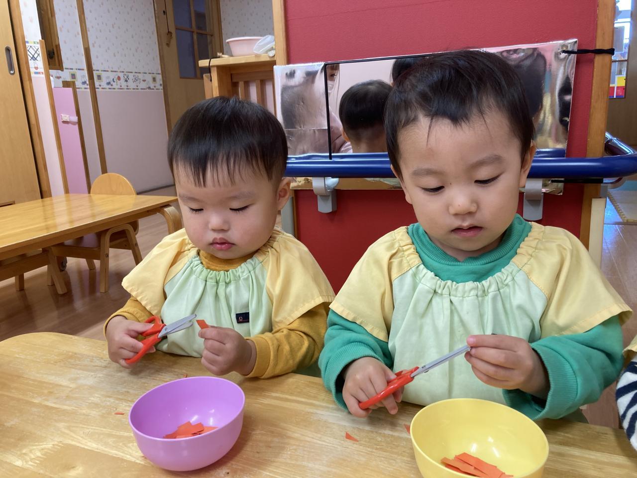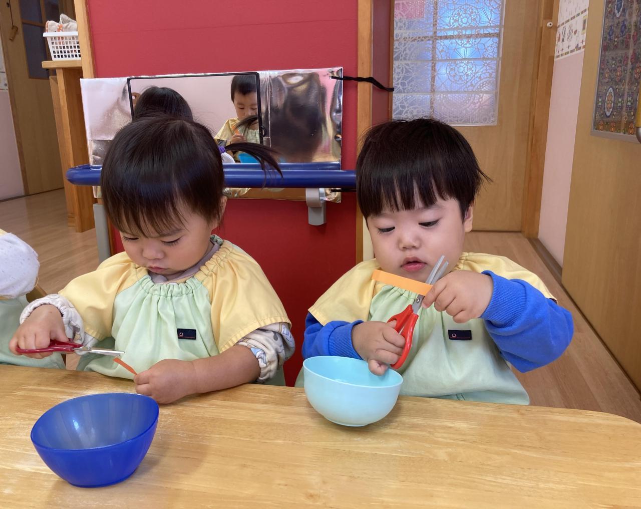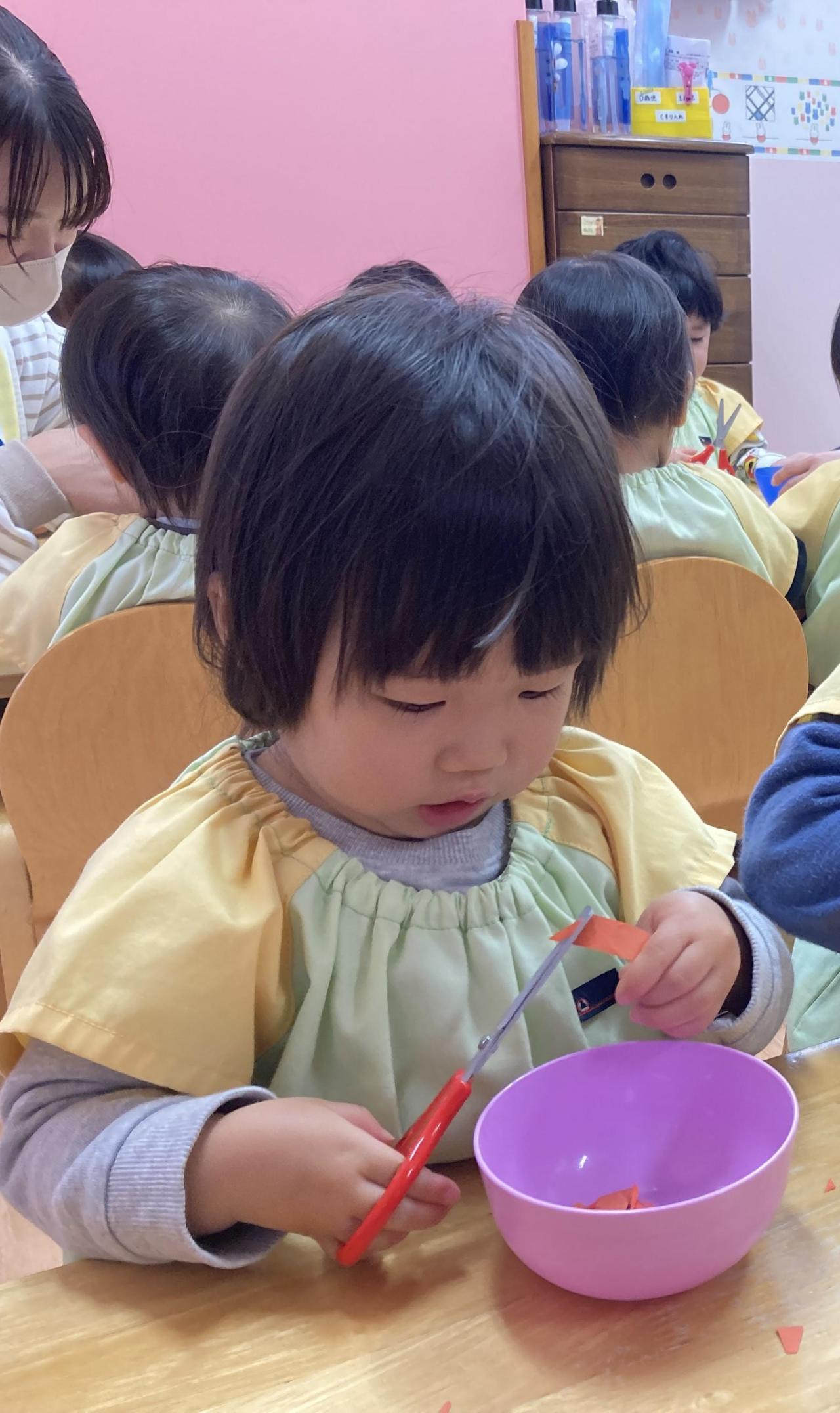 また今月はハサミを使った1回切りにも挑戦してみました!初めてのハサミに困惑する子どももいましたが、安全に練習ができるよう、順番に保育士が側に付き、持ち方から一緒に練習しました✂️