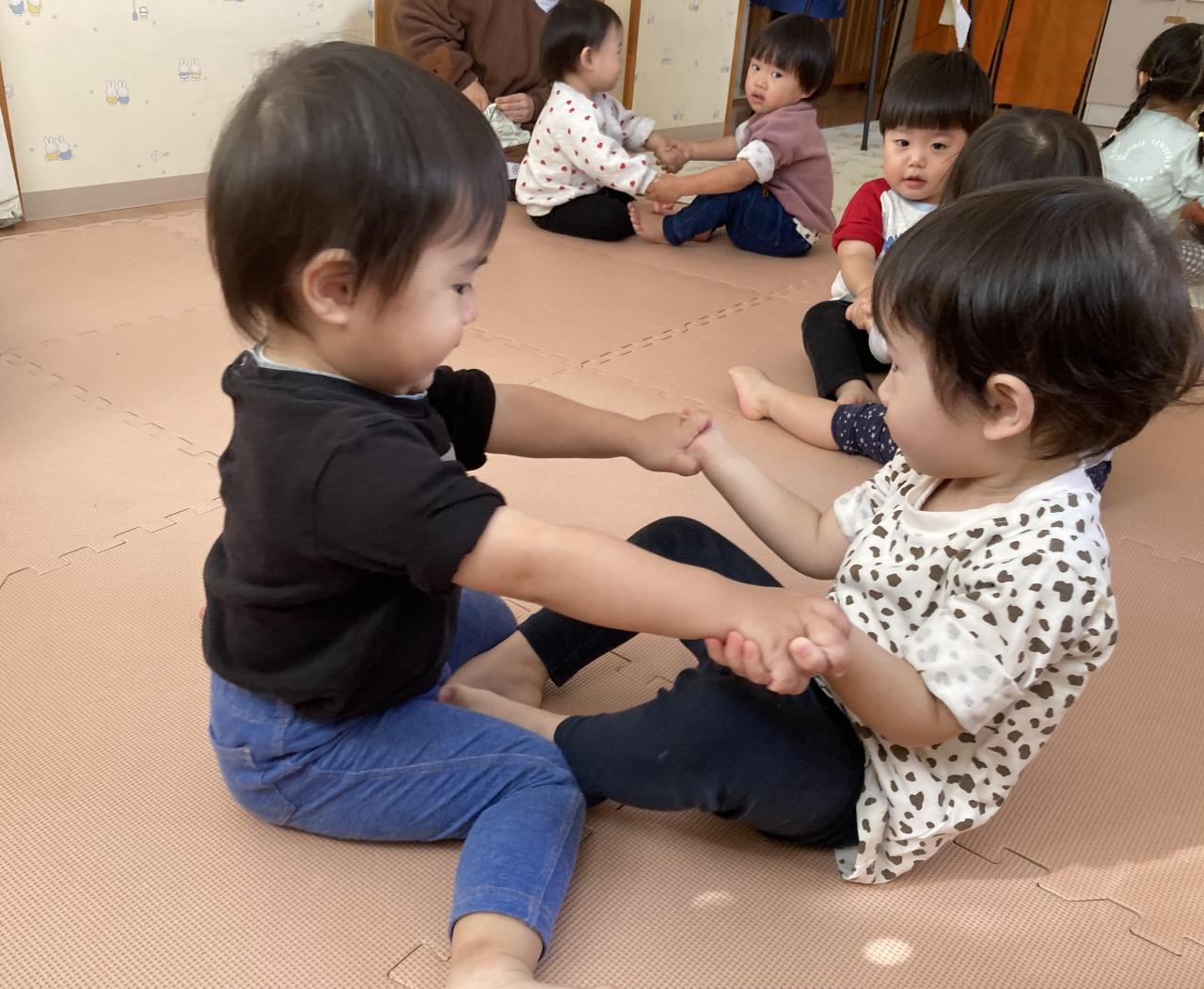 最近ではお友達に興味を持って関わる姿がたくさん見られるようになってきました☀️お部屋でピアノの音が鳴ると、自分から積極的にお友達の手をとって繋いで座り、「ぎっちらこ〜」と触れ合い遊びを楽しんだり、肩を持って列車ごっこをするなど、お友達との関わりを楽しんでいます😊