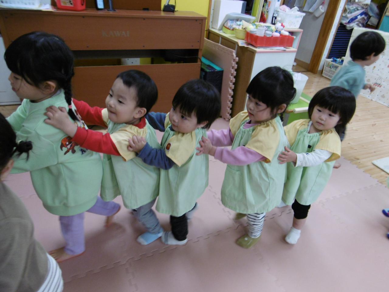 中には、「◯◯ちゃんまてまてしょ!」「うん!よーいどん!」と簡単な言葉を交わして遊びを、共有しようとする子どももおり、言葉の発達や、遊び方にも変化が見られるようになってきており成長を感じています(*^^*)