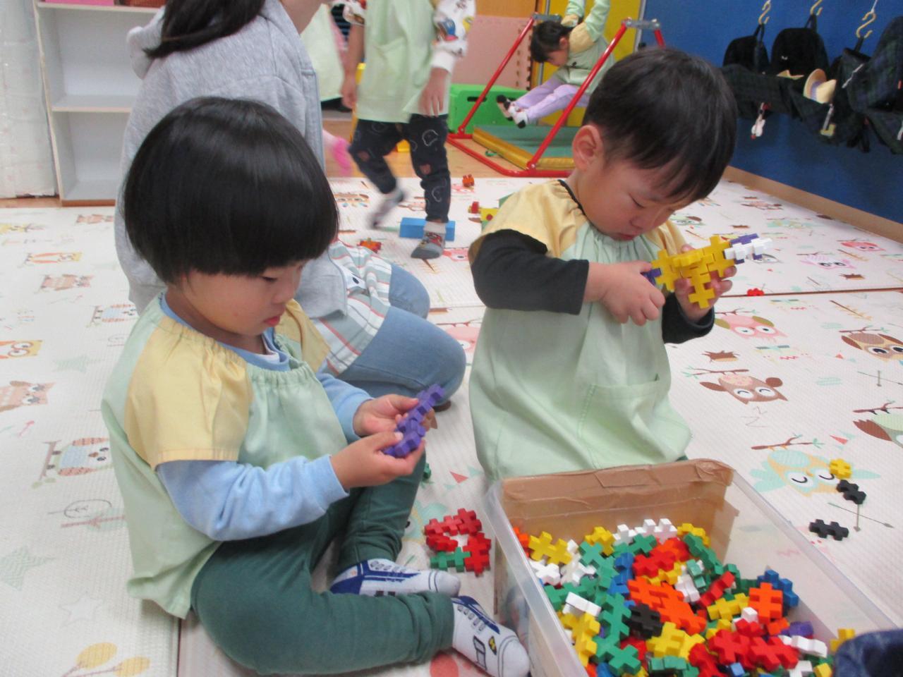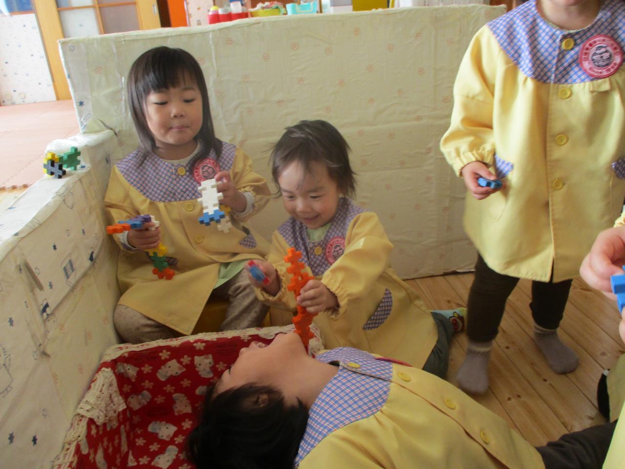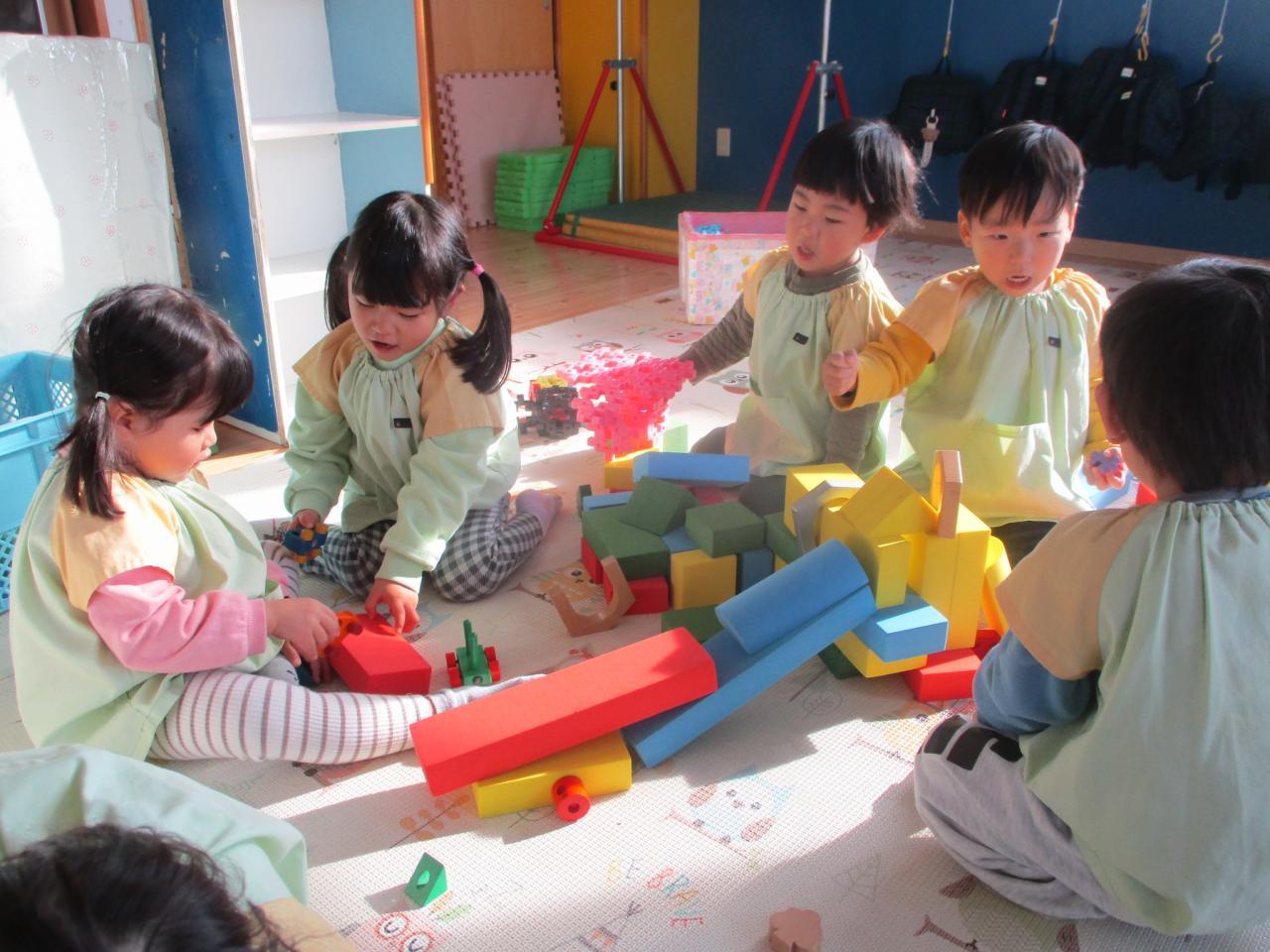 お部屋でも、ブロックや積み木を自分達で考えて組み立てたり、様々なごっこ遊びをしたり絵本を読んだりと、お友達と一緒に遊んでいます!