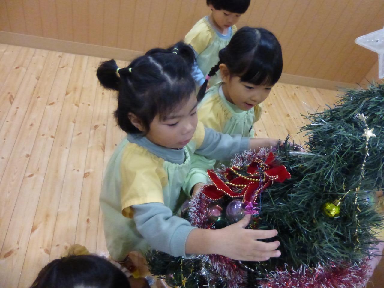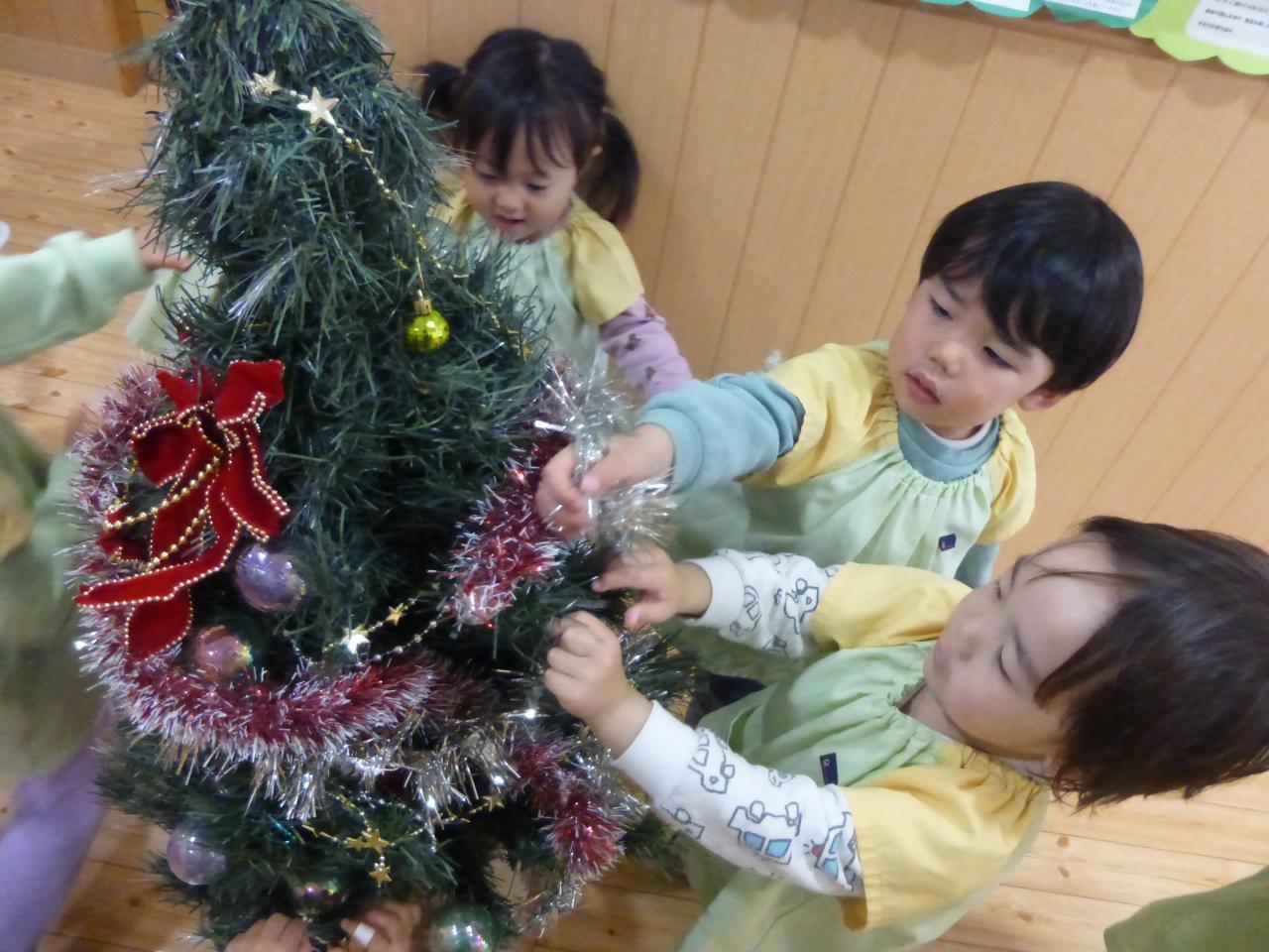 飾りをつける部分が小さく、引っかけることに苦戦していましたが、保育者と一緒にしたり、自分なりに考えて飾って、綺麗なツリーが完成しました✨