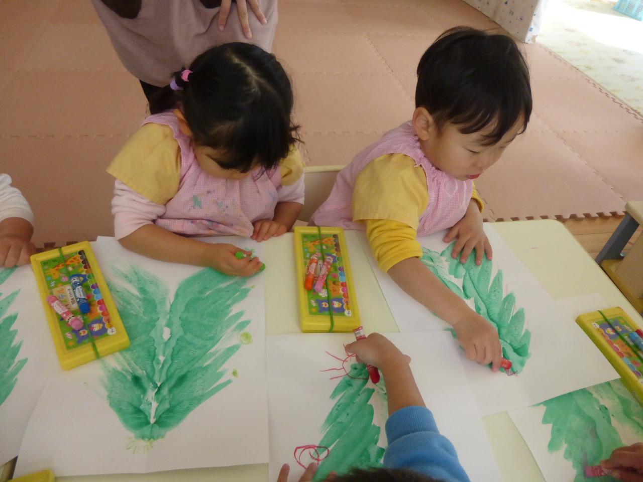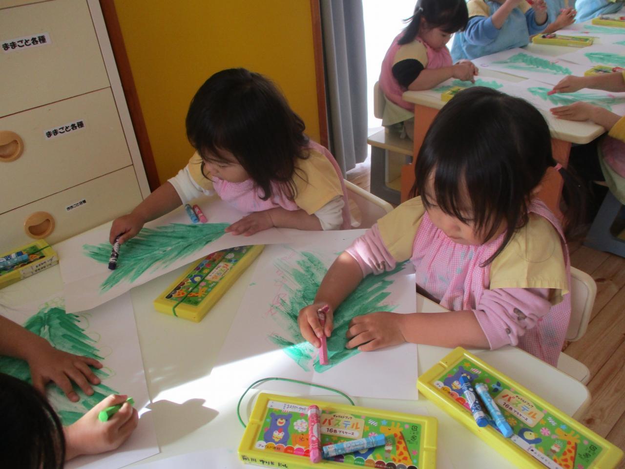 ツリーの先端にお星さまを描いたり、自分なりにイメージしたものを描いてツリー作りを楽しみました💕