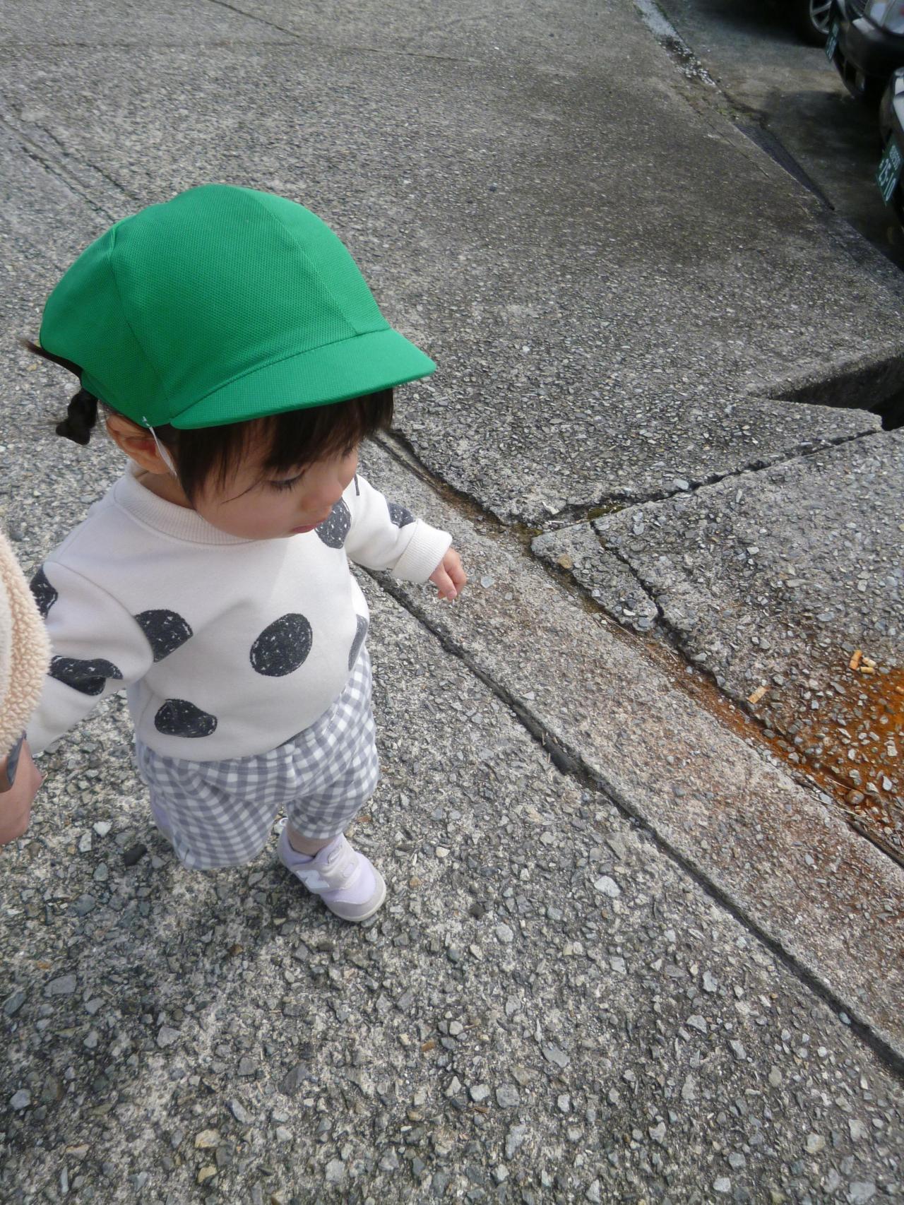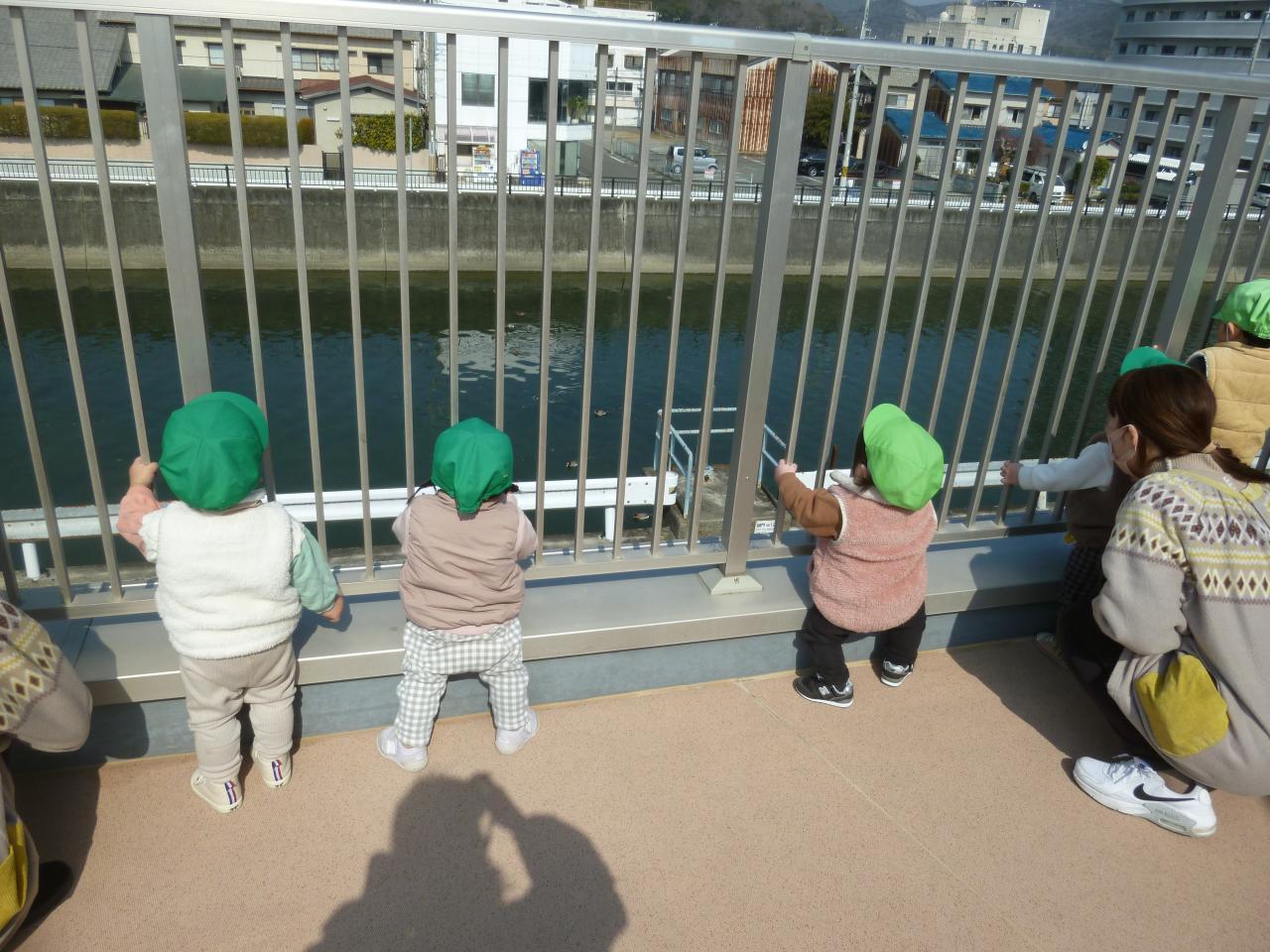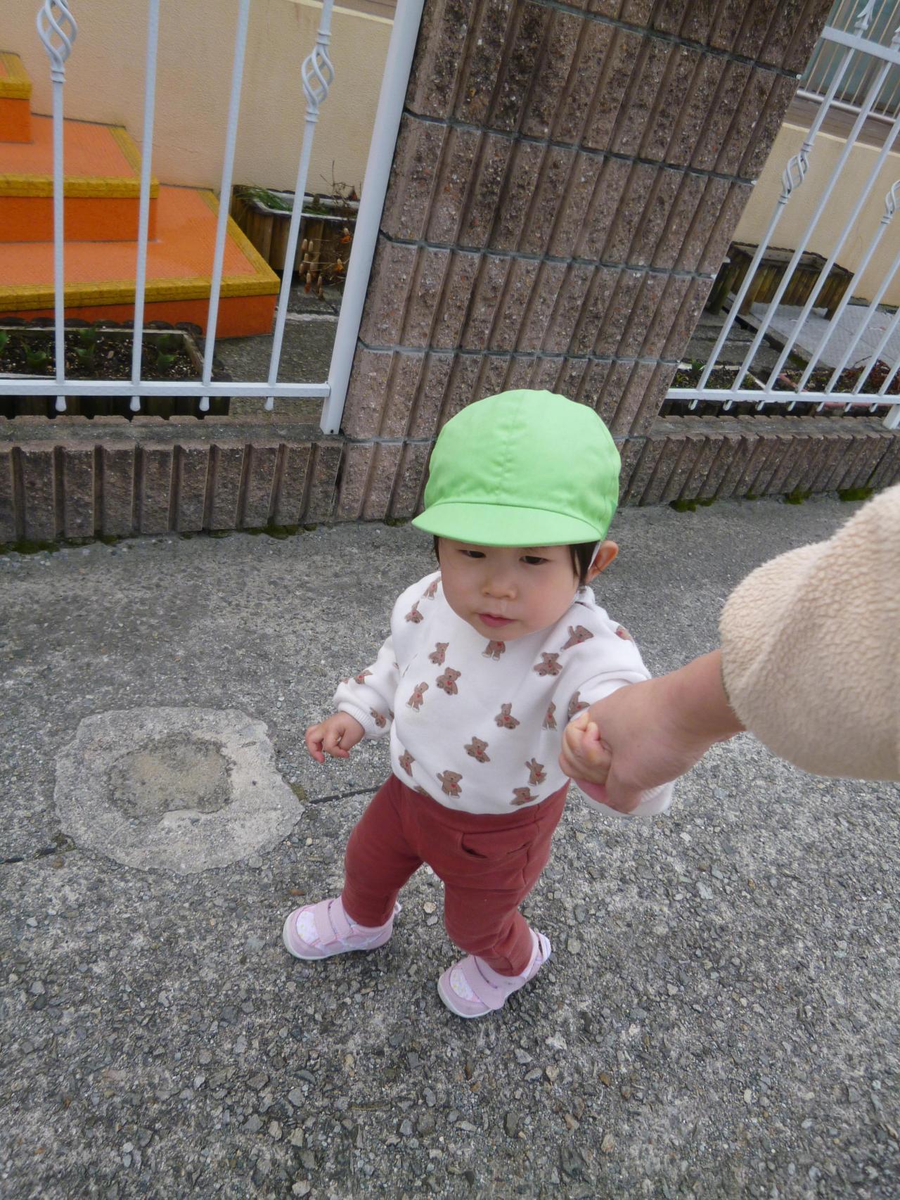 保育士と順番に手を繋いで園前を靴を履いて歩いてみました🙌どの子もお外で歩けてとっても嬉しそうでした!園前の川にカモを見つけると「あ!」と声を上げてにこっとする子もいました✨お天気も良く楽しい散歩になりました😄