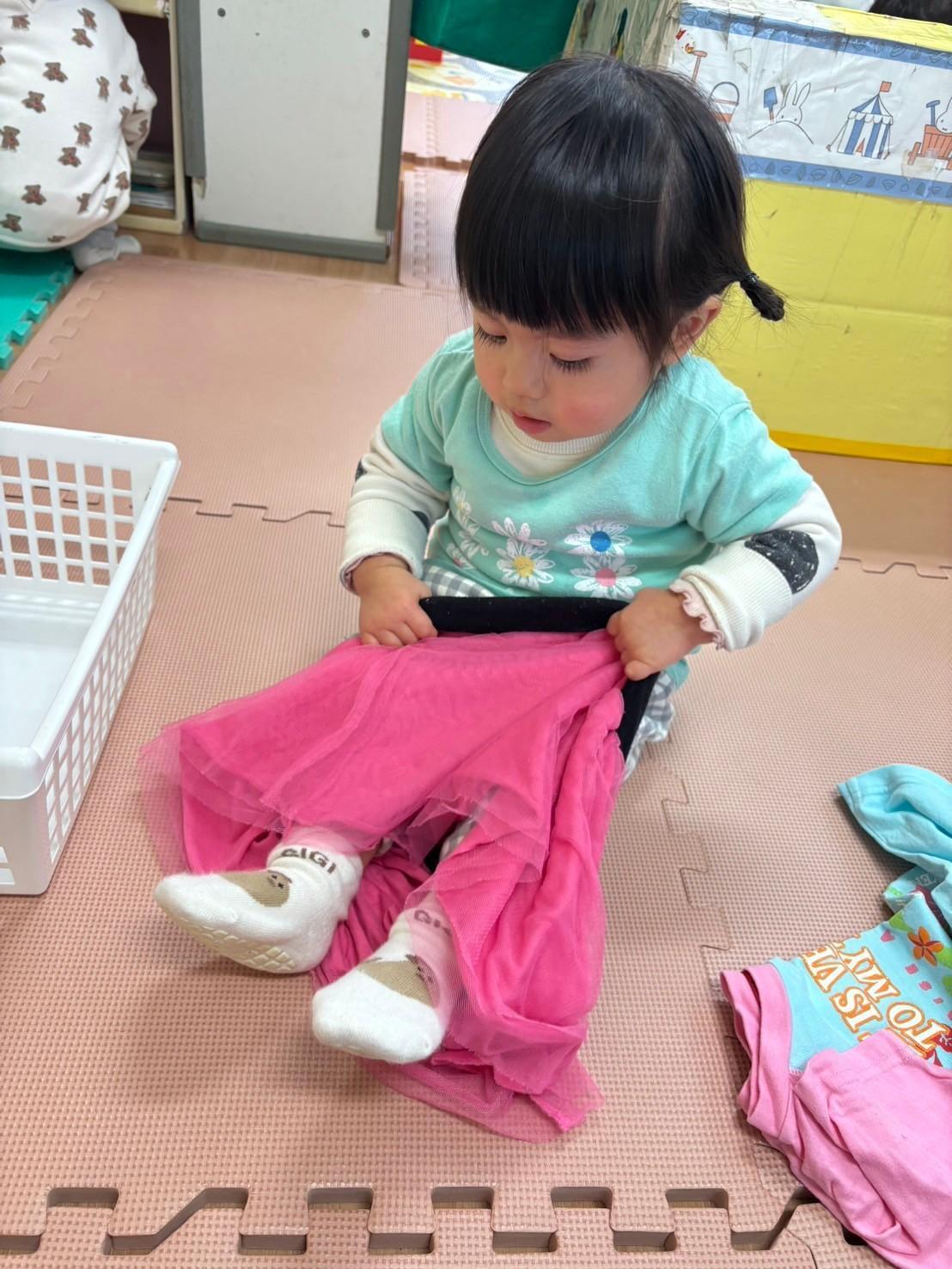 進級に向け最近ではズボンを上げる練習や手洗いを一緒に取り組んでいるところです。お部屋に着替えをおくと畳んだりする子や自分で履こうとする子もいました😆今さくら組さんでは身の回りのことに興味をもち自分でやってみようとする姿がたくさんみられます。お部屋でも自分で一生懸命ズボンやスカートを履いていました✨