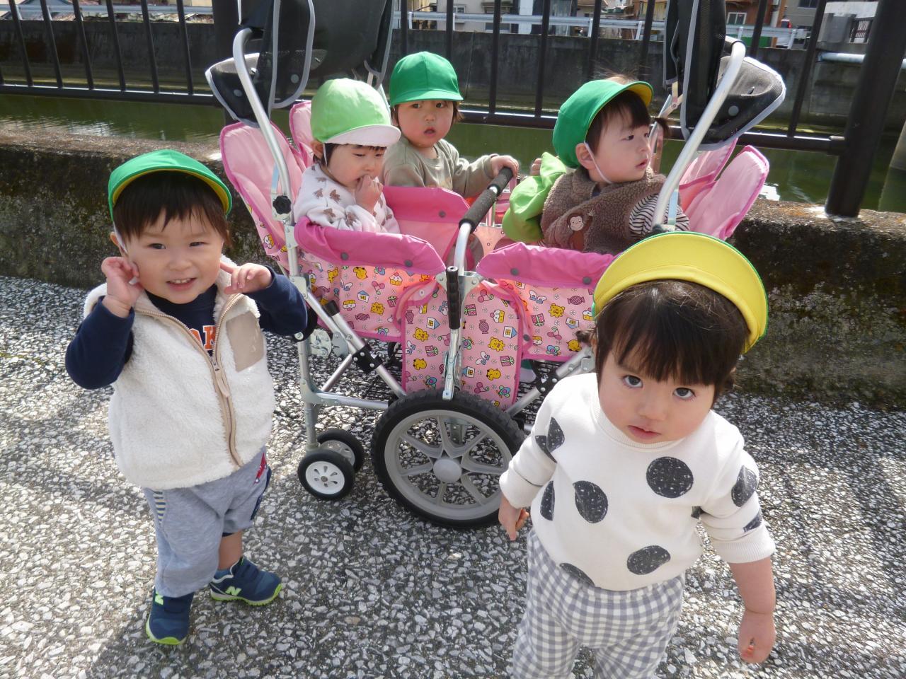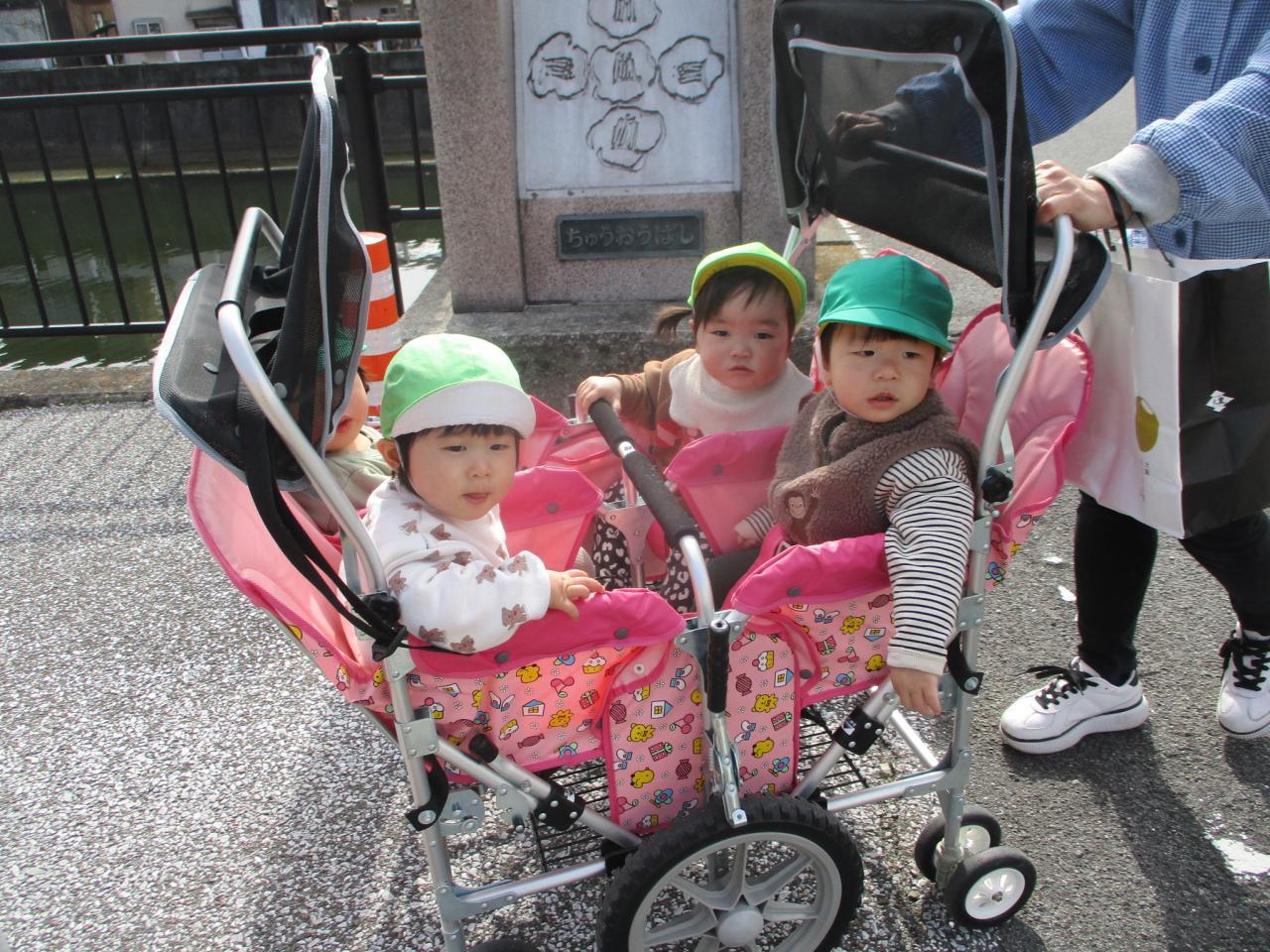 先日のお散歩の様子です😀初めてみんなでいく園外に緊張していたのか最初はじーっと前に座っているお友達を見て不思議そうにしていましたが少し散歩の距離が長くなると周りを見ようとしたりお友達と目を合わせて笑ったりしていました😄
