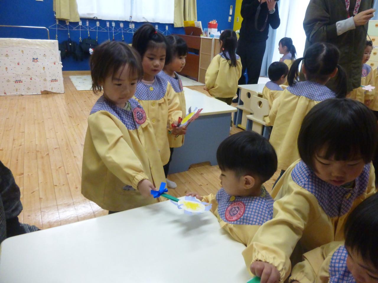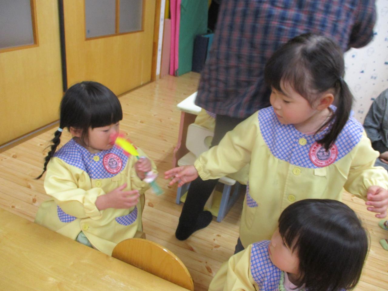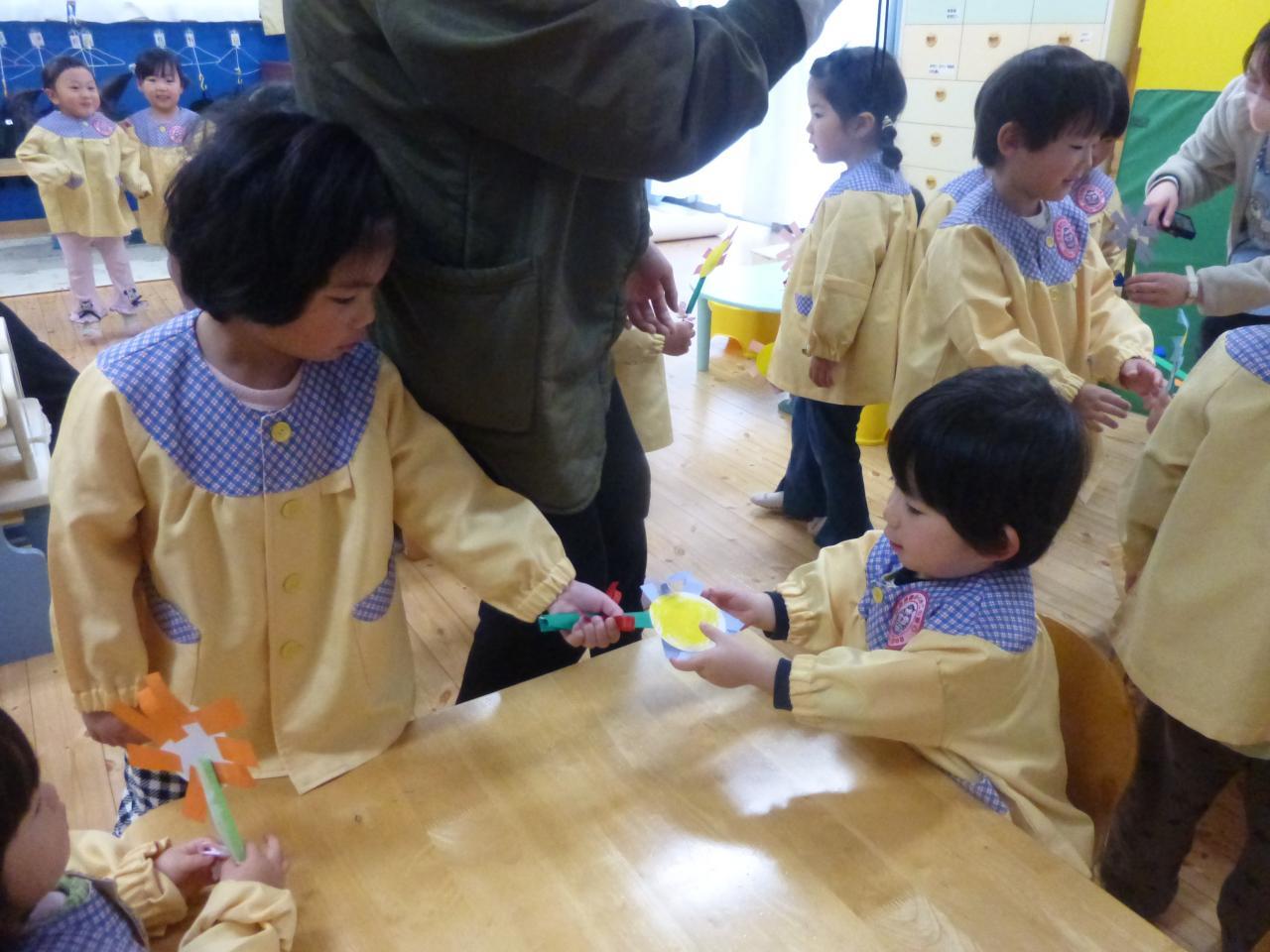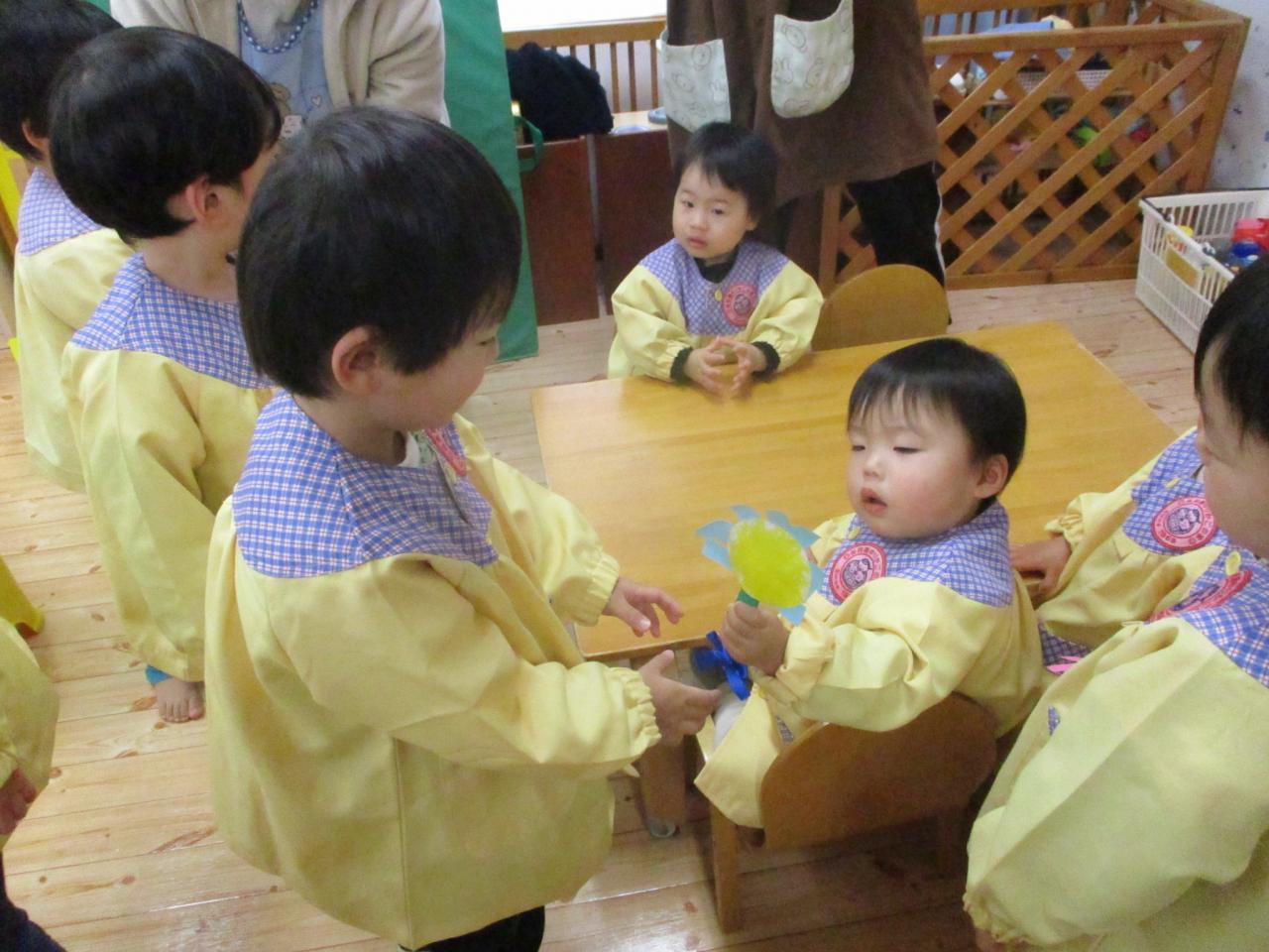 そしてそのあとは、ゆり組さんからたんぽぽ組さんへ、手作りのお花をプレゼント!🌷