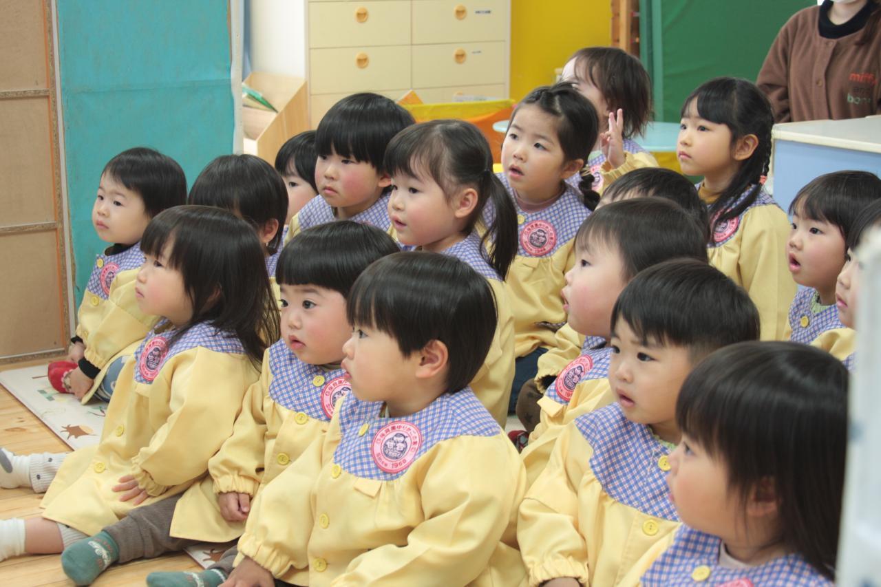 いつも見ている絵本よりも大きい絵本に興味津々で、みんなとっても集中して見ていて、見終わった後も、「大きい絵本面白かった~!」と嬉しそうに言っていました💕