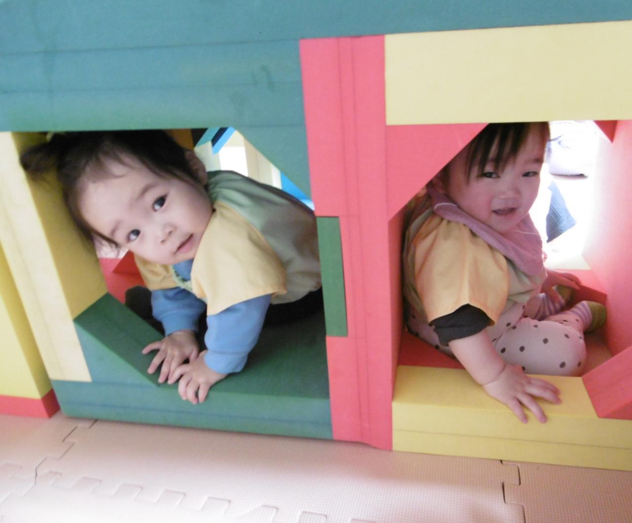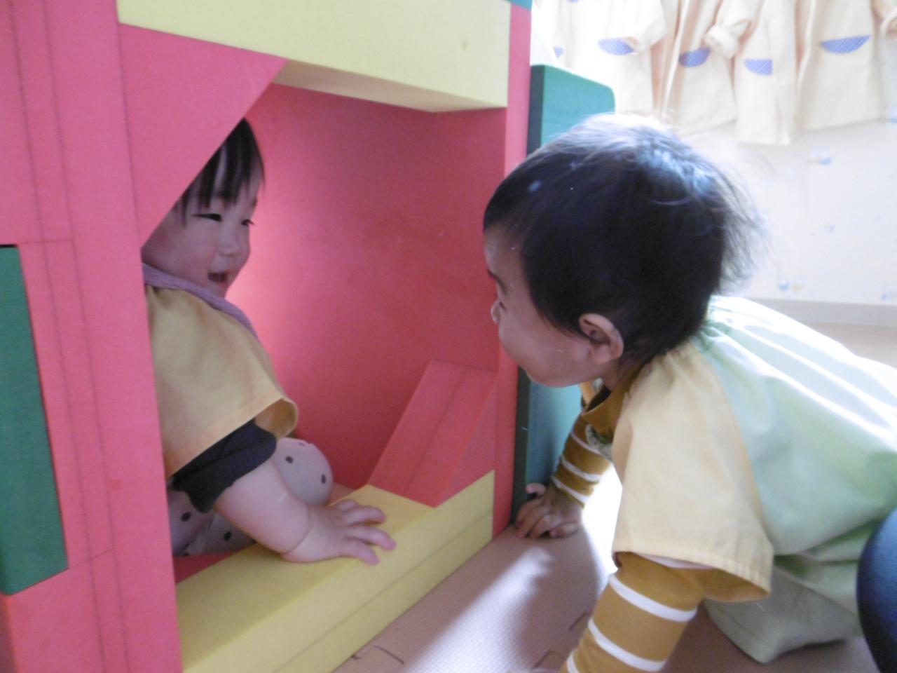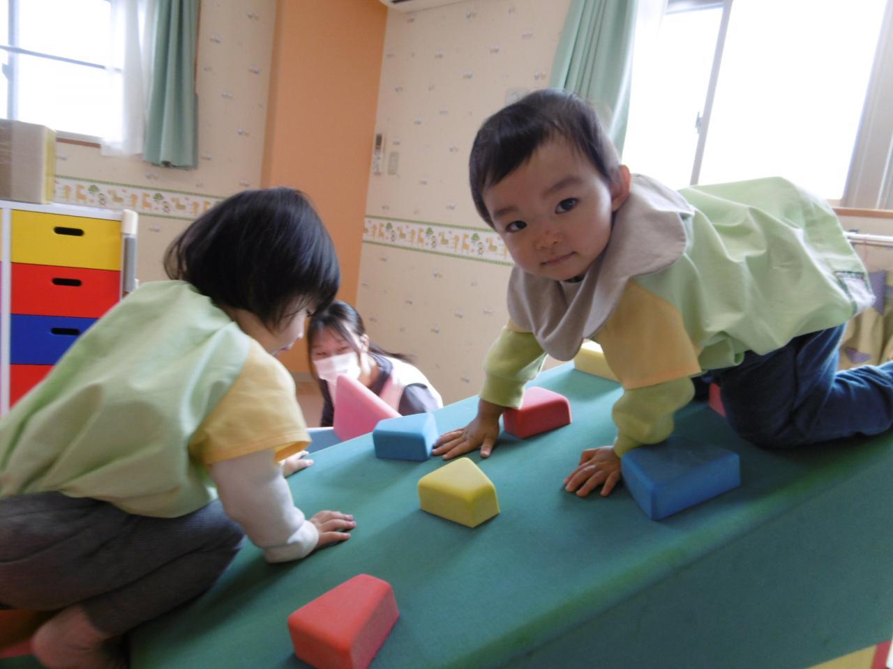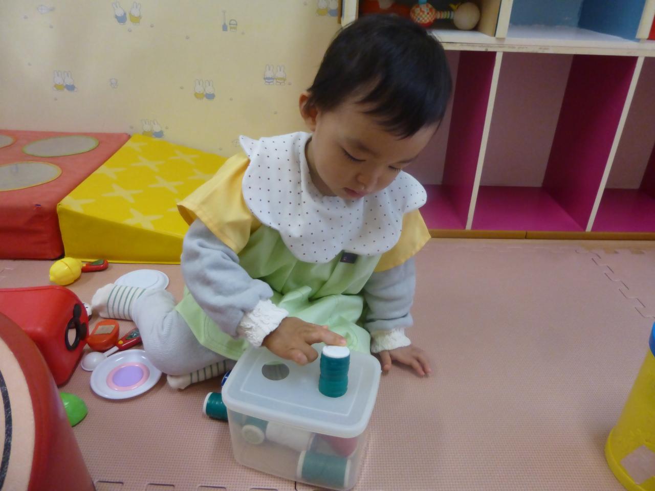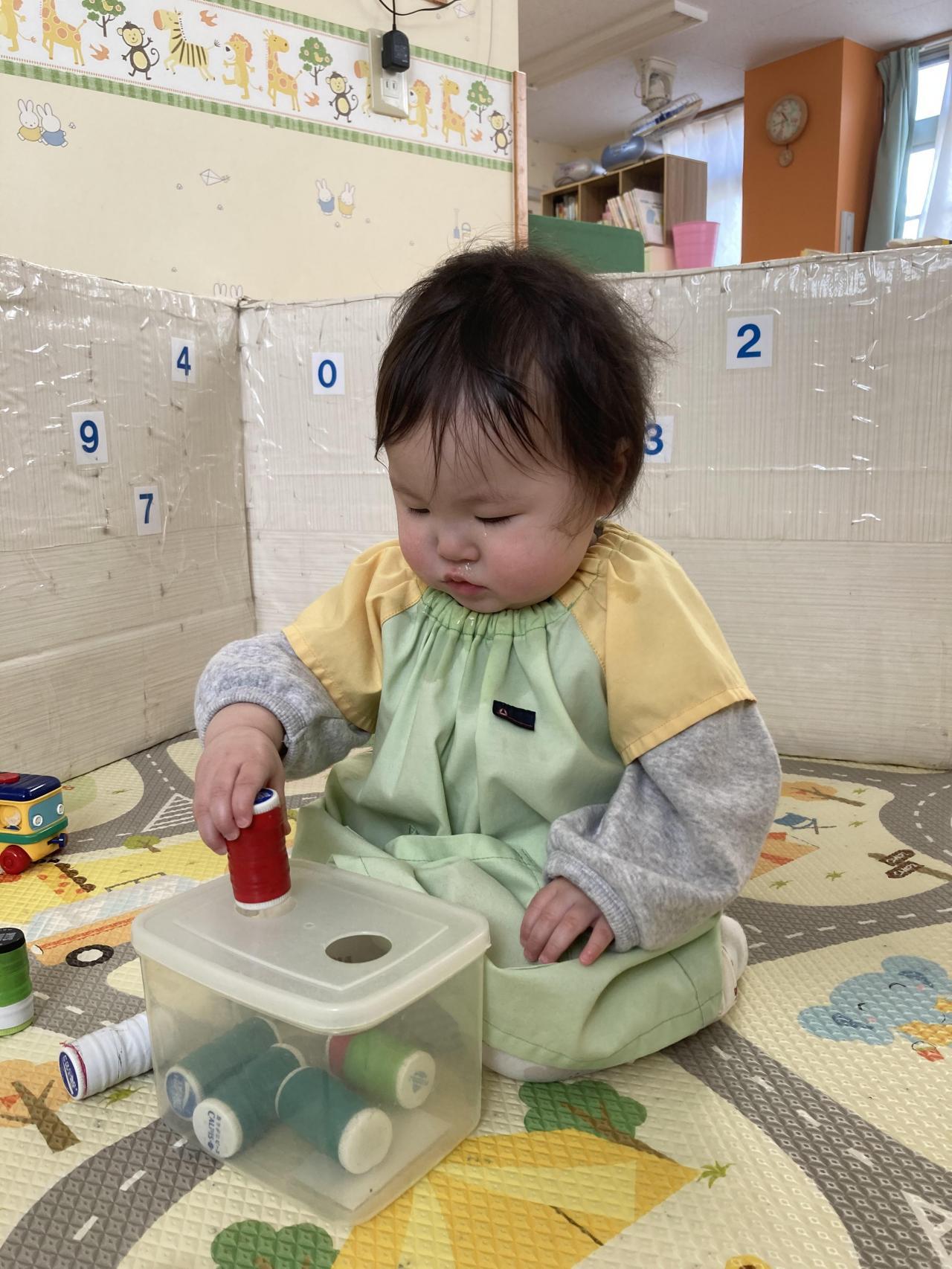 室内ではブロックや絵本、穴落としなどをして、好きな遊びを見つけ落ち着いて遊べるようにしています😌穴落としができると、自分で手を叩いて喜ぶ姿もみられとても可愛いらしいです😄