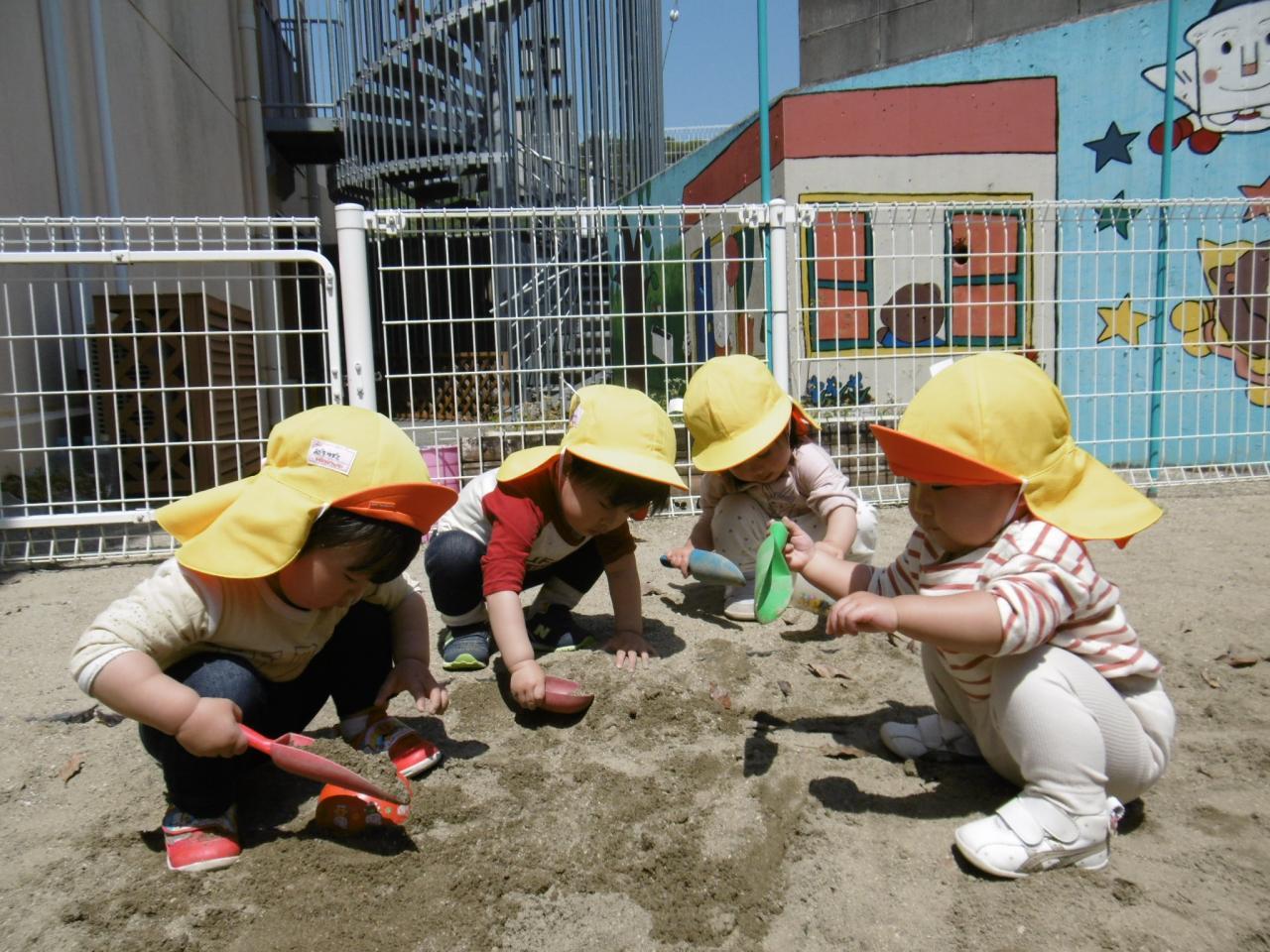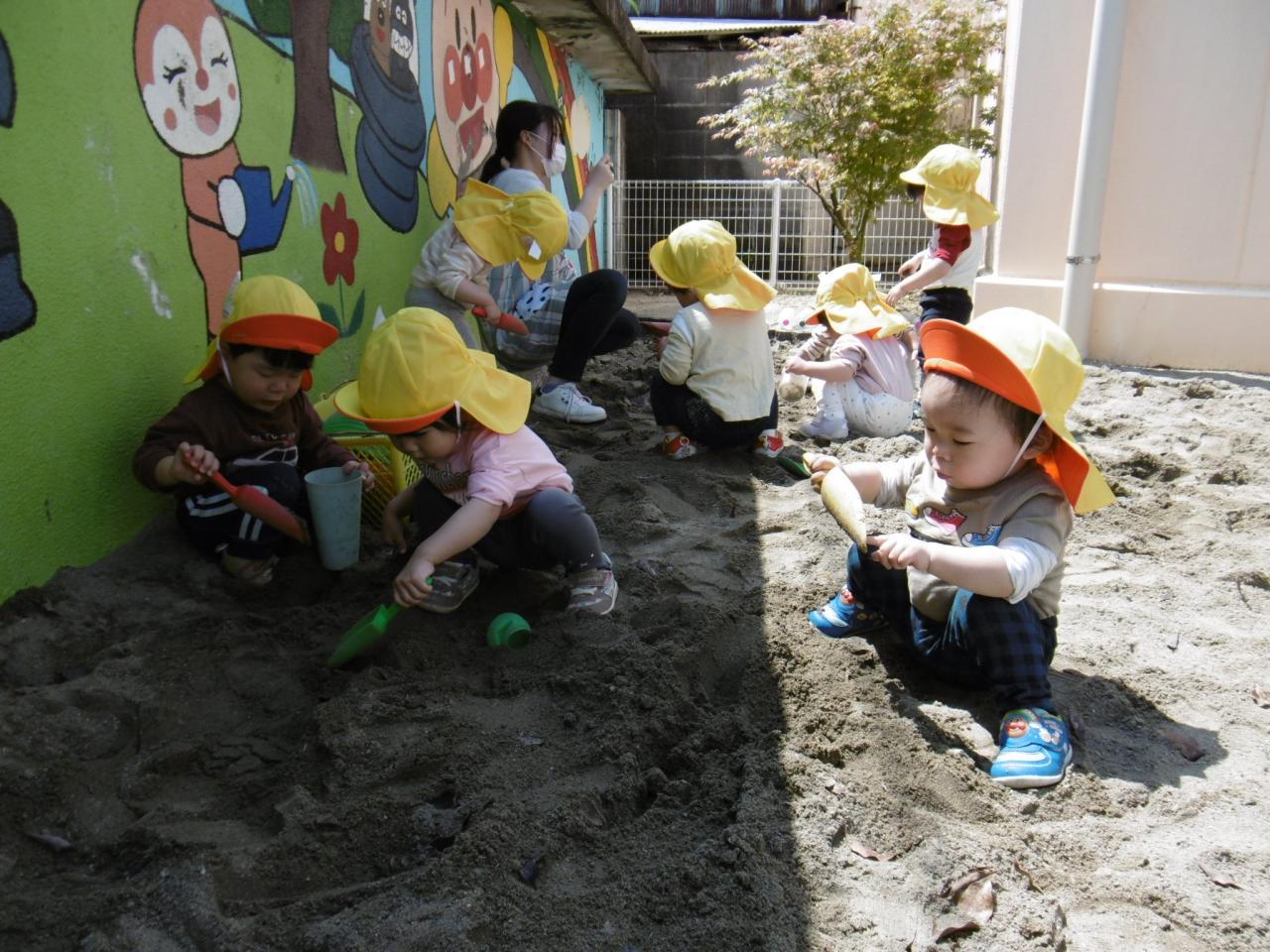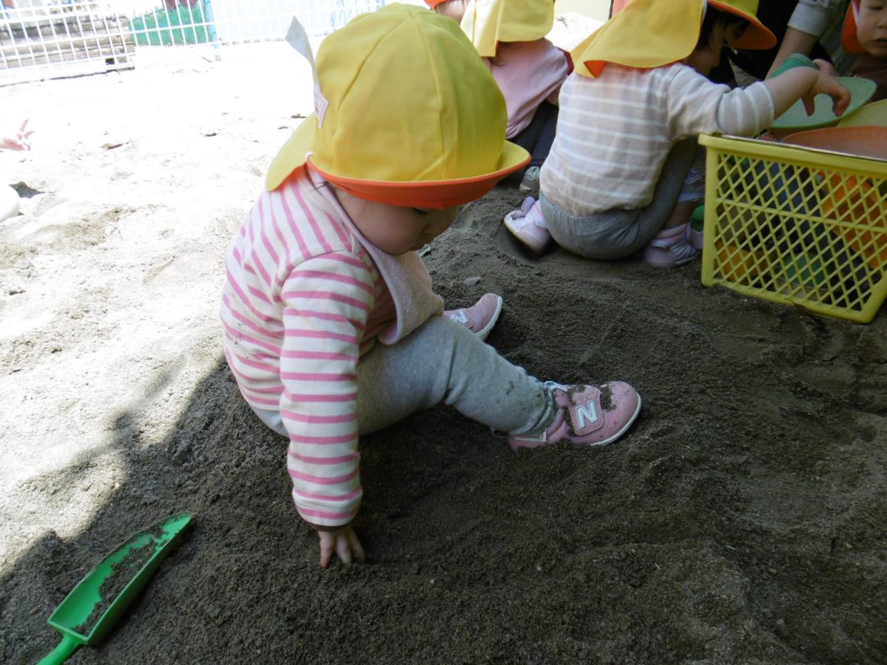 初めての砂の感触に大喜びの子どももいれば、少し戸惑い様子を伺う子どももおり、様々な表情を見ることができました😊