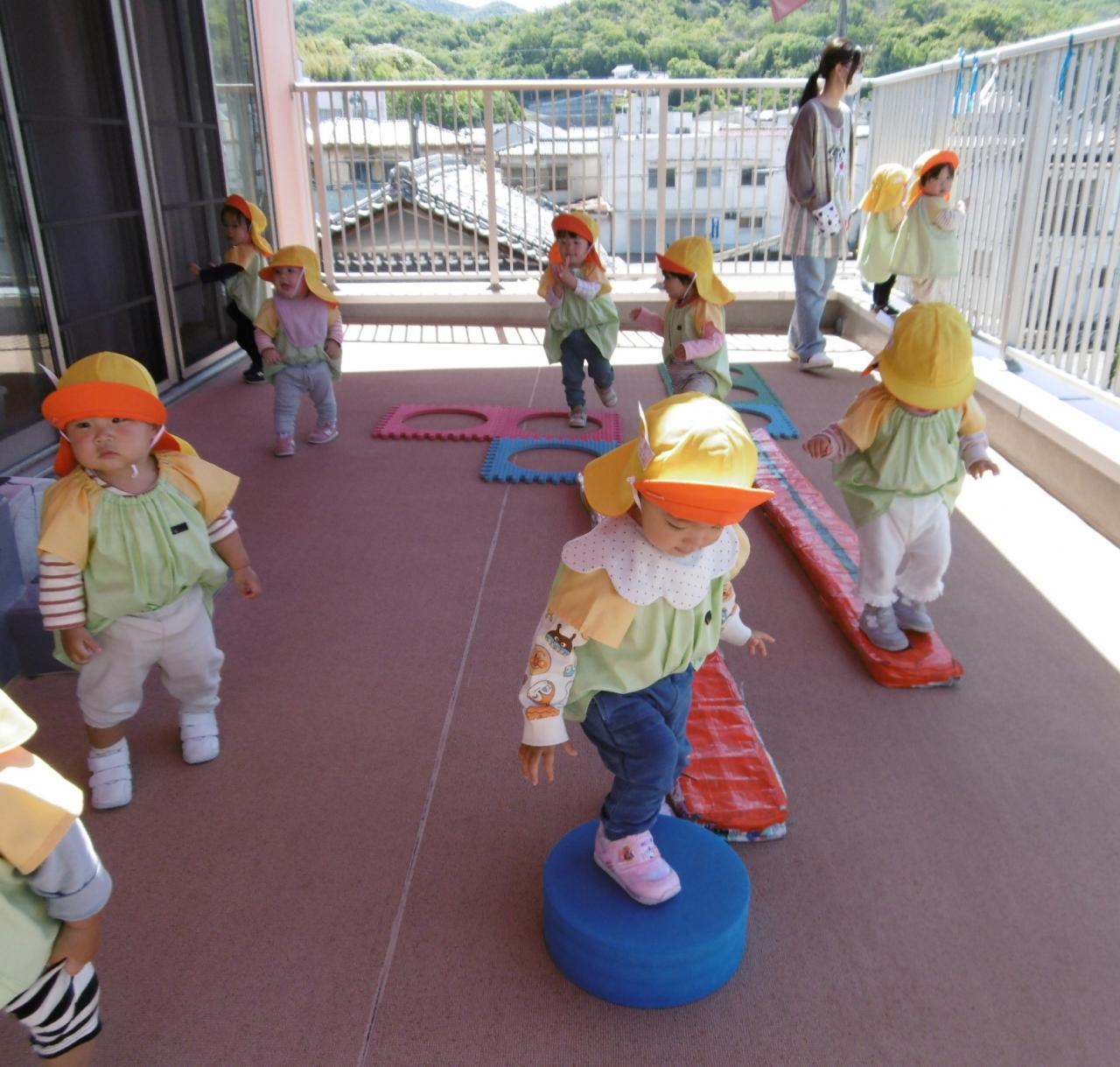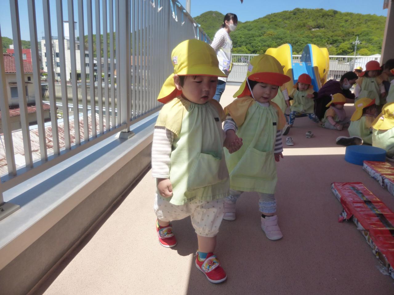 戸外では、テラスに出て保育士やお友達と一緒に追いかけっこをして身体を動かしたり、探索活動、自然観察などを楽しんでいます。