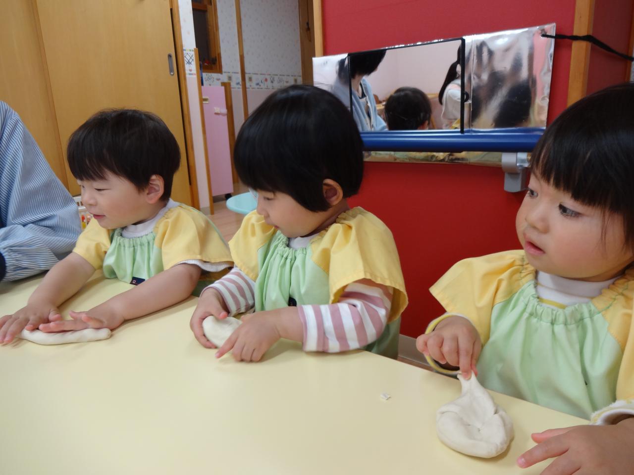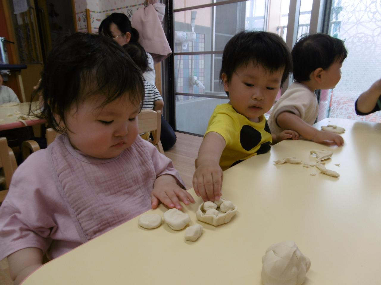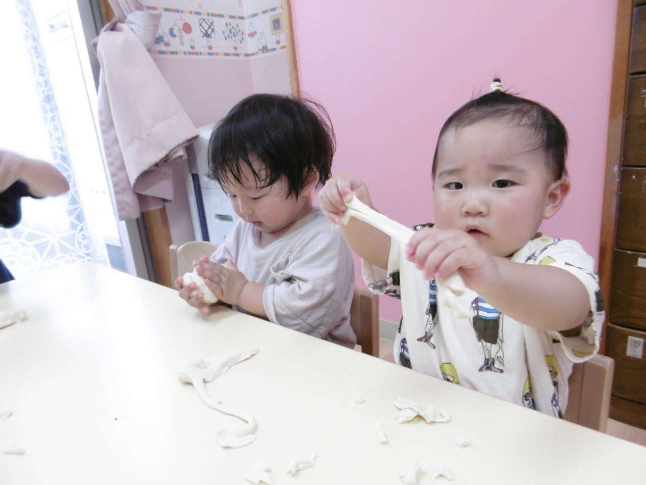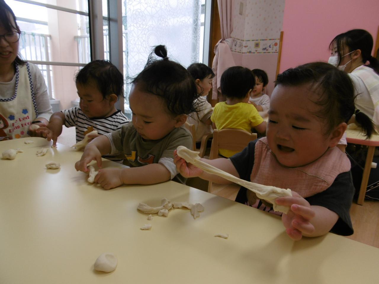 初めて小麦粉粘土をしました!興味津々の子や少し様子を見て触る子もいましたが、ちぎったり伸ばしたりして遊ぶ姿が見られ感触遊びを存分に楽しみました😆