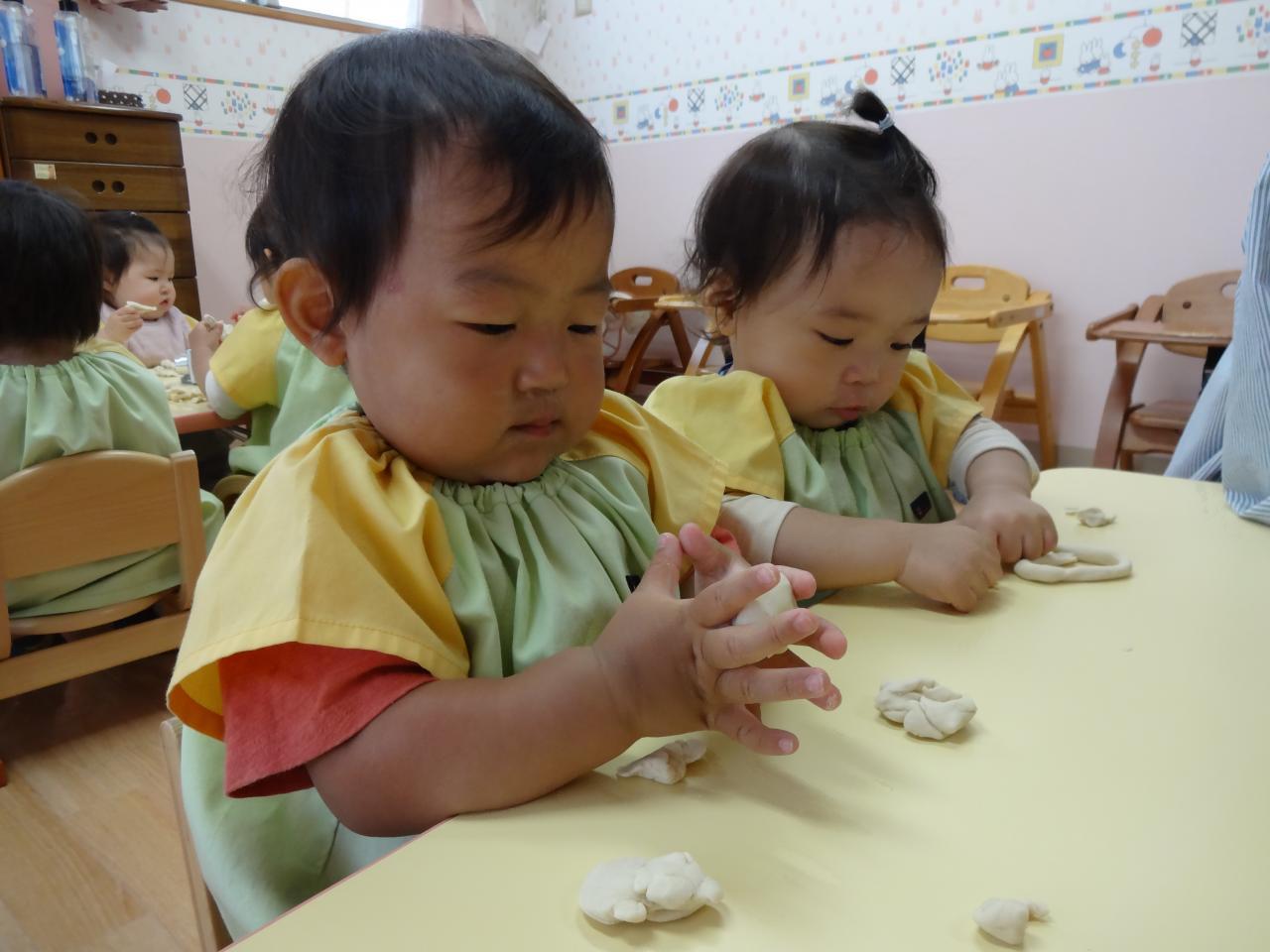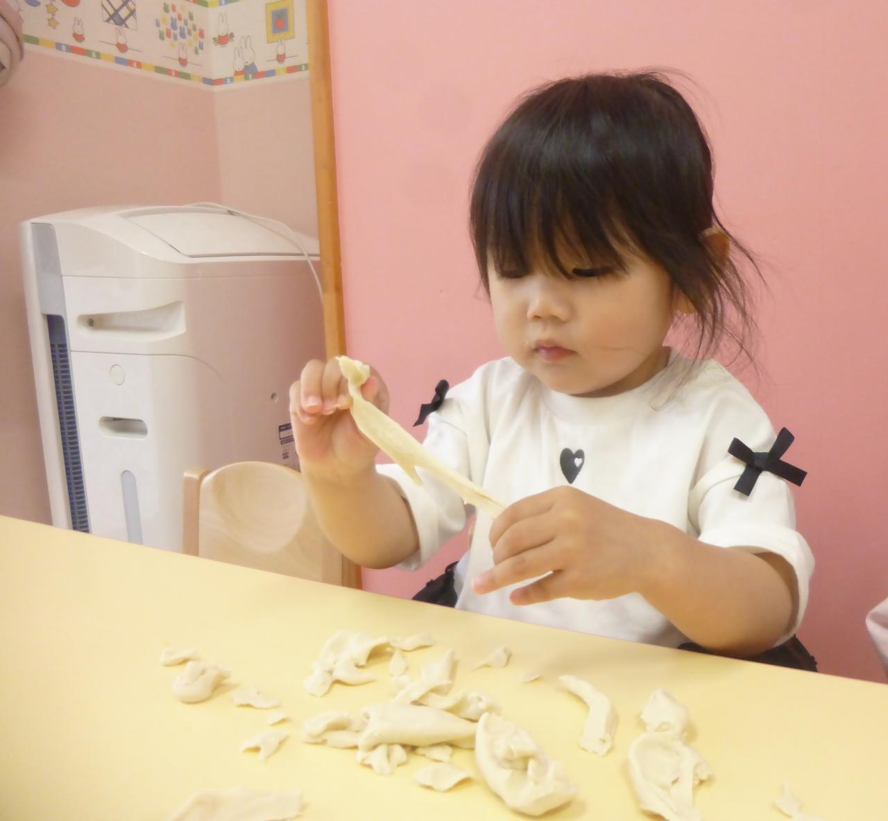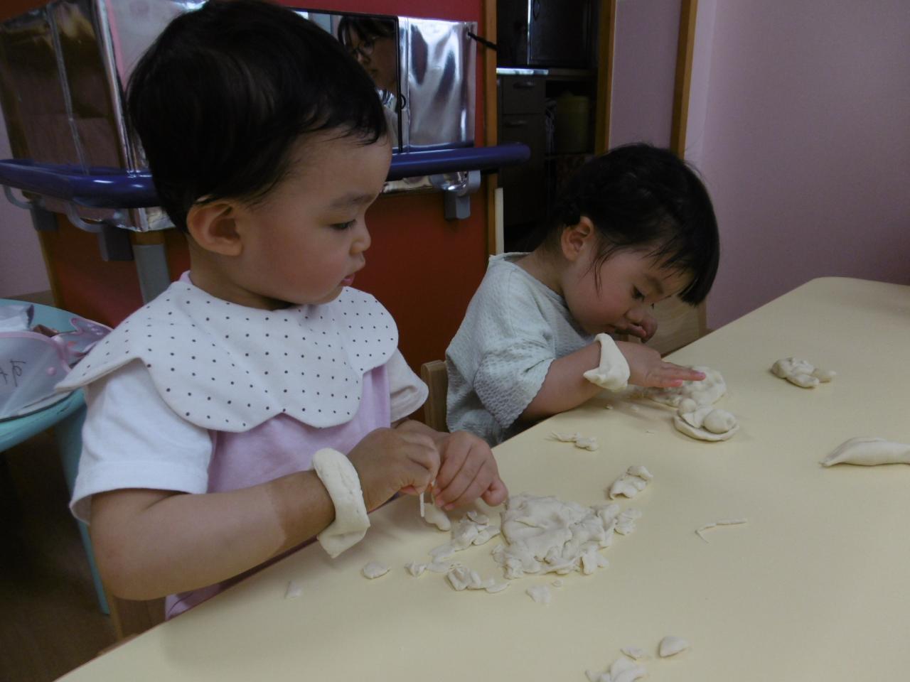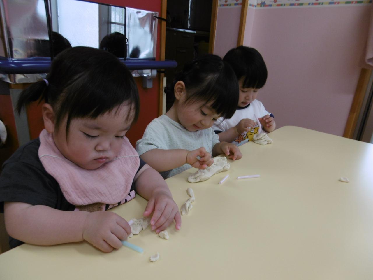 初めて小麦粉粘土をしました!興味津々の子や少し様子を見て触る子もいましたが、ちぎったり伸ばしたりして遊ぶ姿が見られ感触遊びを存分に楽しみました😆