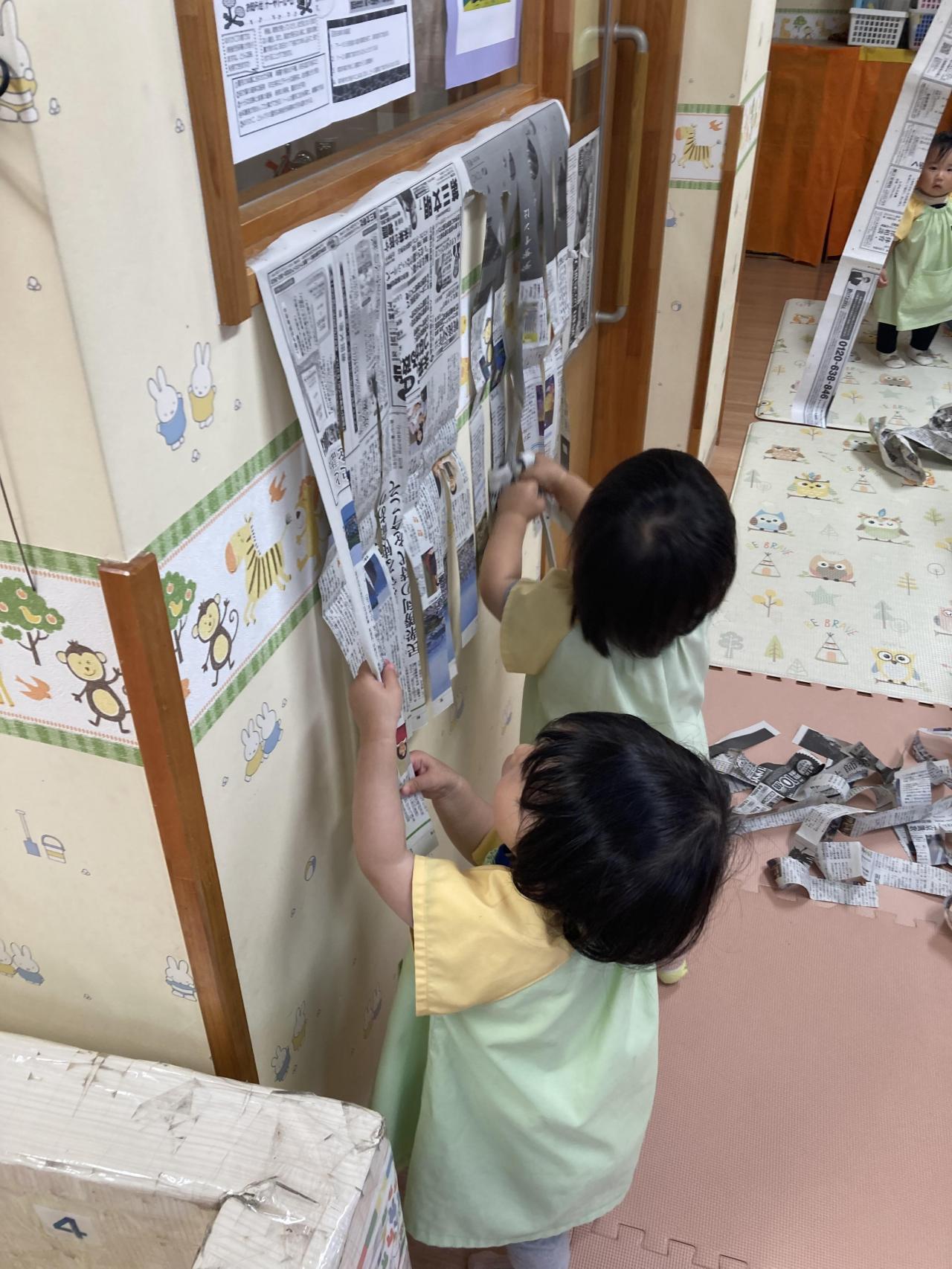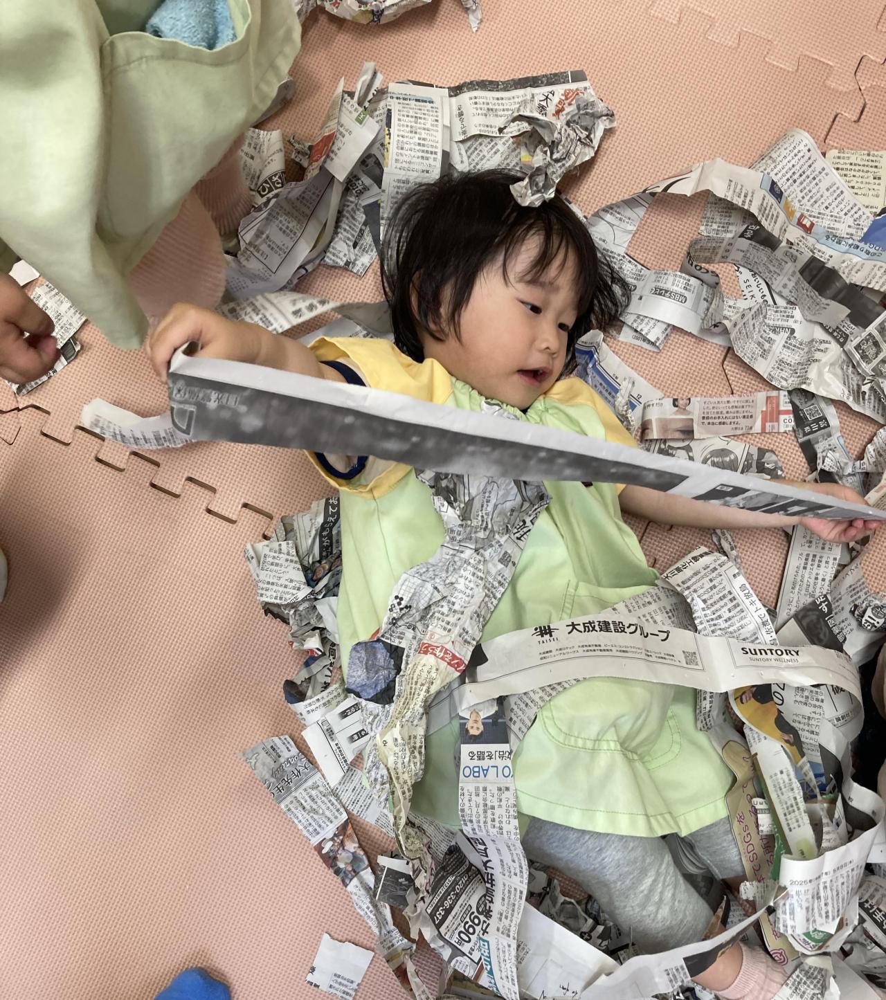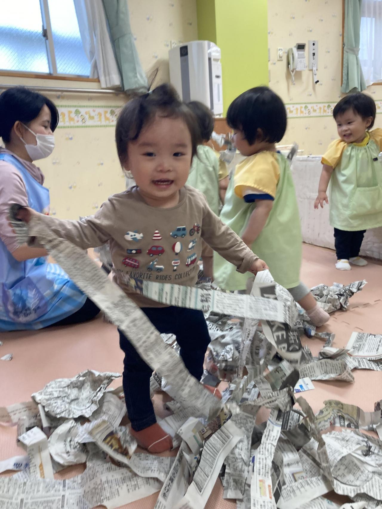 「ばあ!!」と吊してある新聞紙から顔を出したり、新聞紙を布団のようにして寝転んでいる子、新聞紙の中に丸めた新聞紙を入れておくと1枚ずつめくって遊んでいる子などとっても楽しんでいる姿が見られました😆