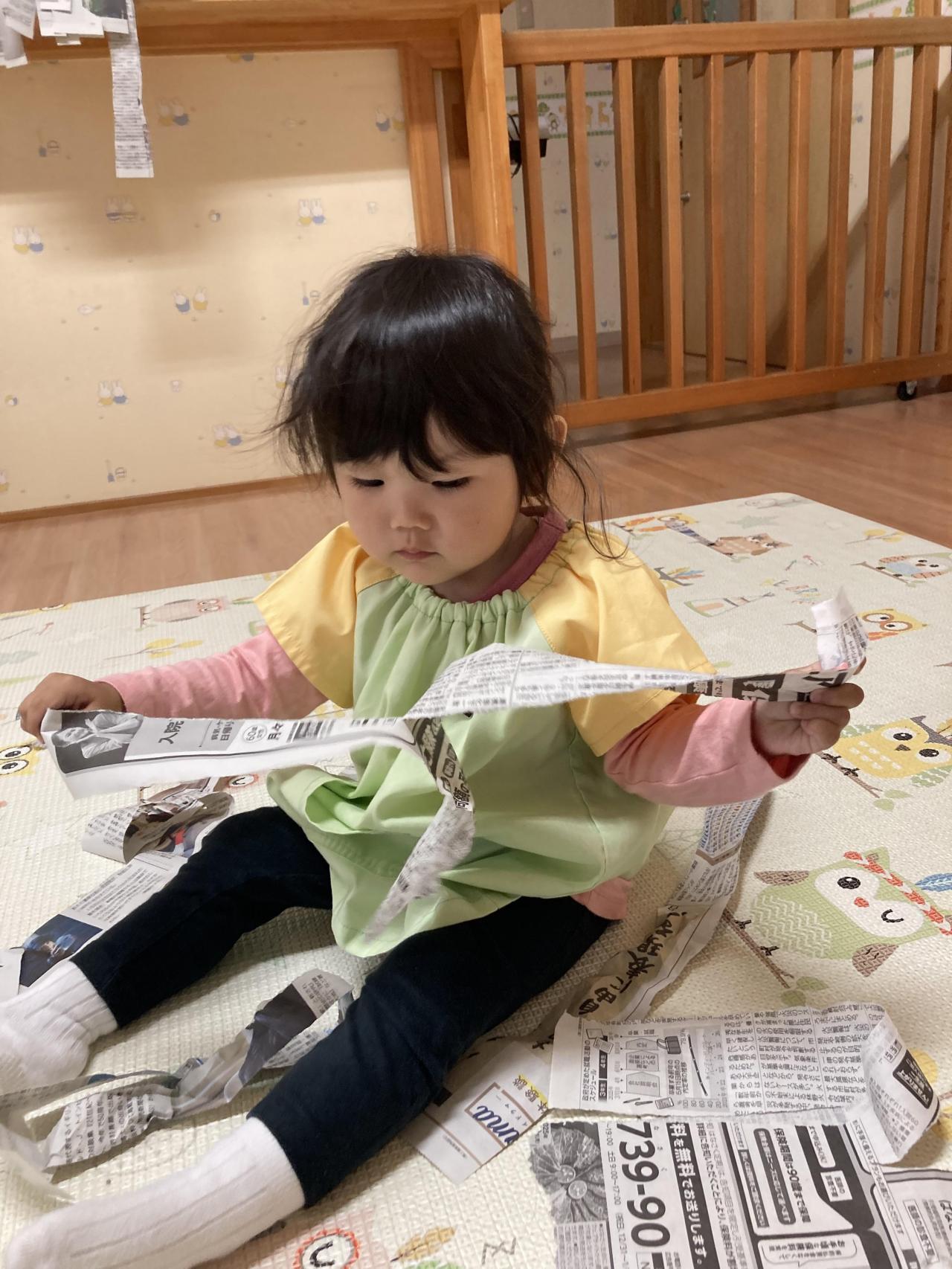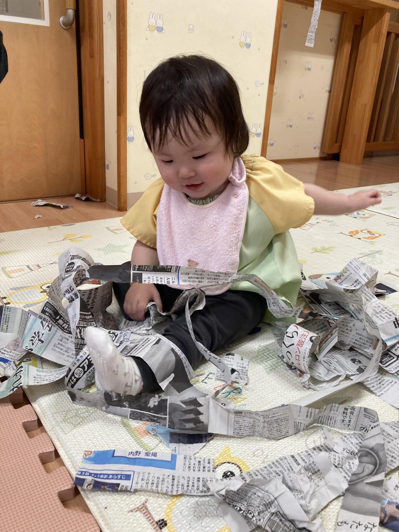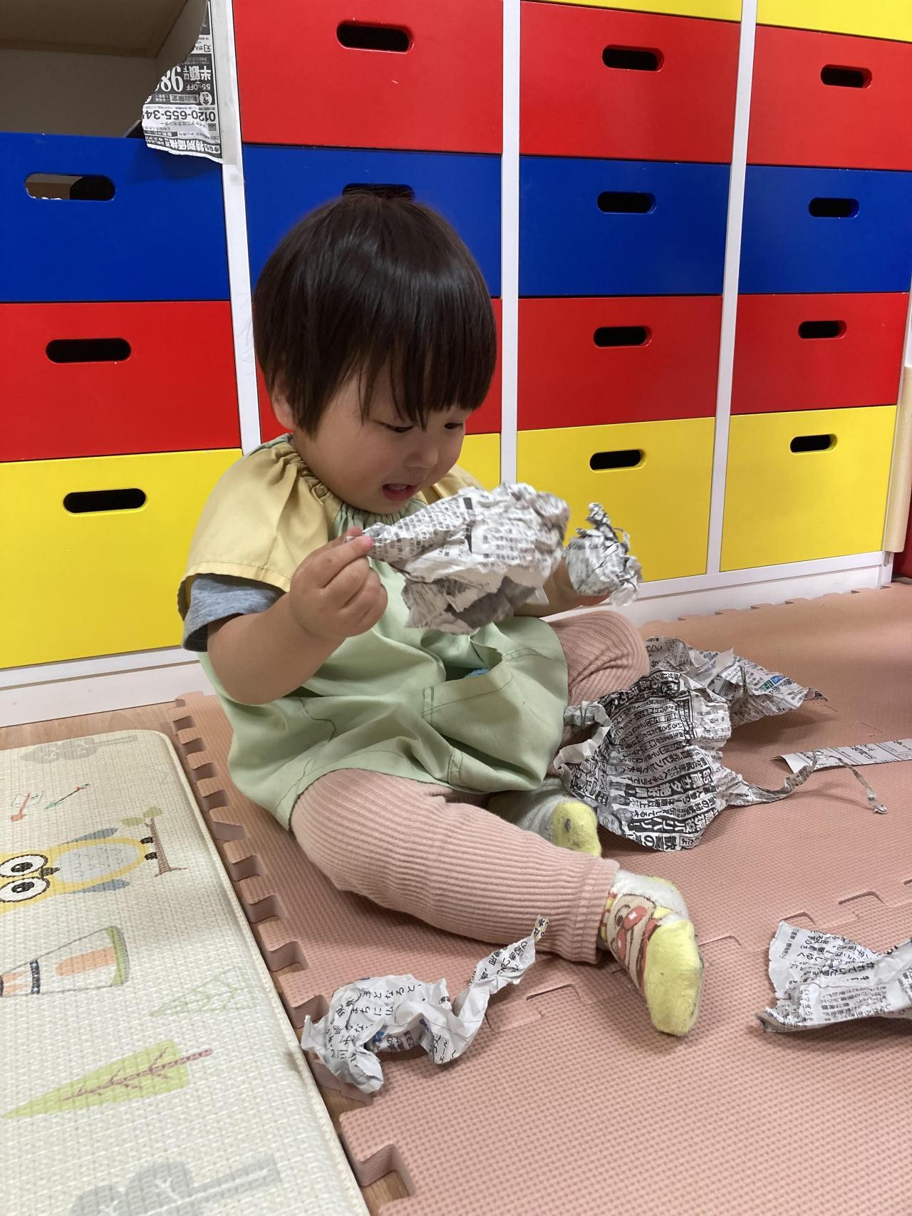 「ばあ!!」と吊してある新聞紙から顔を出したり、新聞紙を布団のようにして寝転んでいる子、新聞紙の中に丸めた新聞紙を入れておくと1枚ずつめくって遊んでいる子などとっても楽しんでいる姿が見られました😆