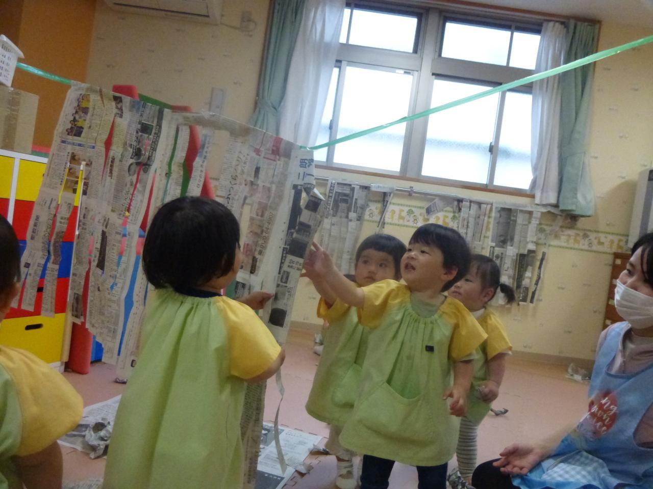 新聞遊びでは、吊してある新聞紙などたくさんの新聞紙に大はしゃぎなたんぽぽ組さん!