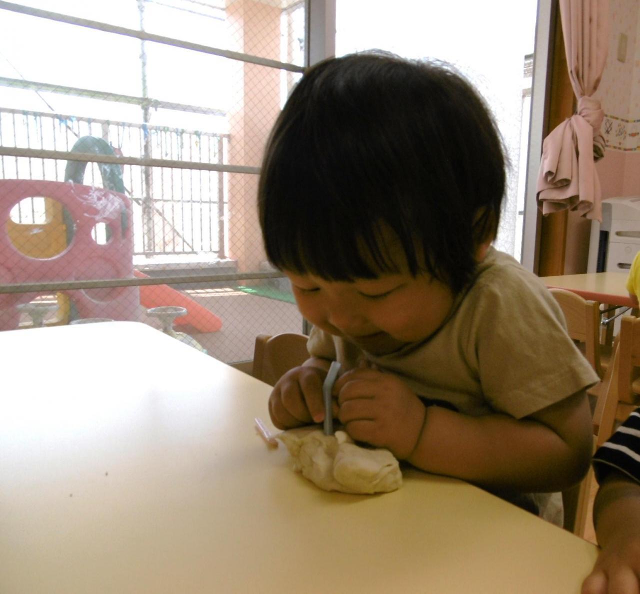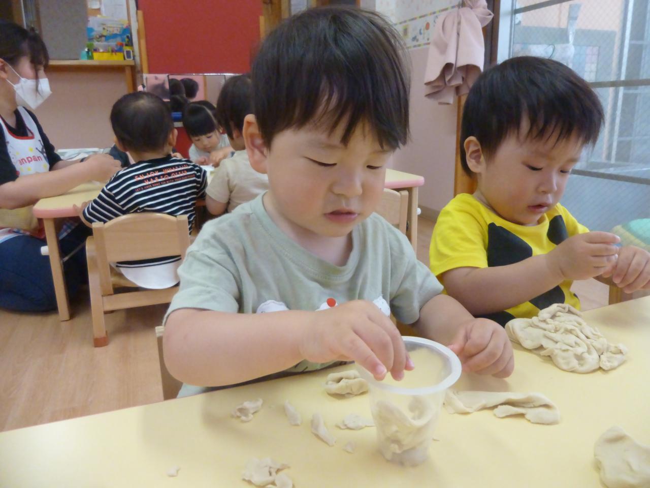 また、カップやストローを渡すと粘土にストローをさして丸い跡がつくことを楽しんだり、カップに粘土を入れ、ジュースを作ってストローをさして飲む真似をするなど楽しんでいる姿が見られました。😋
