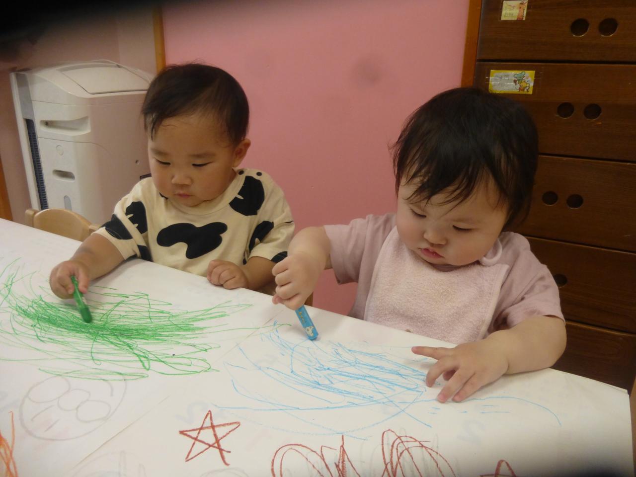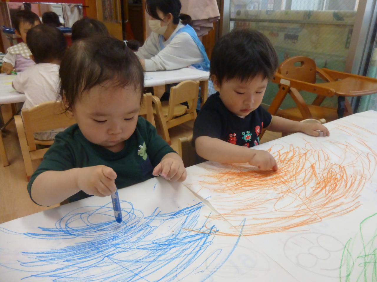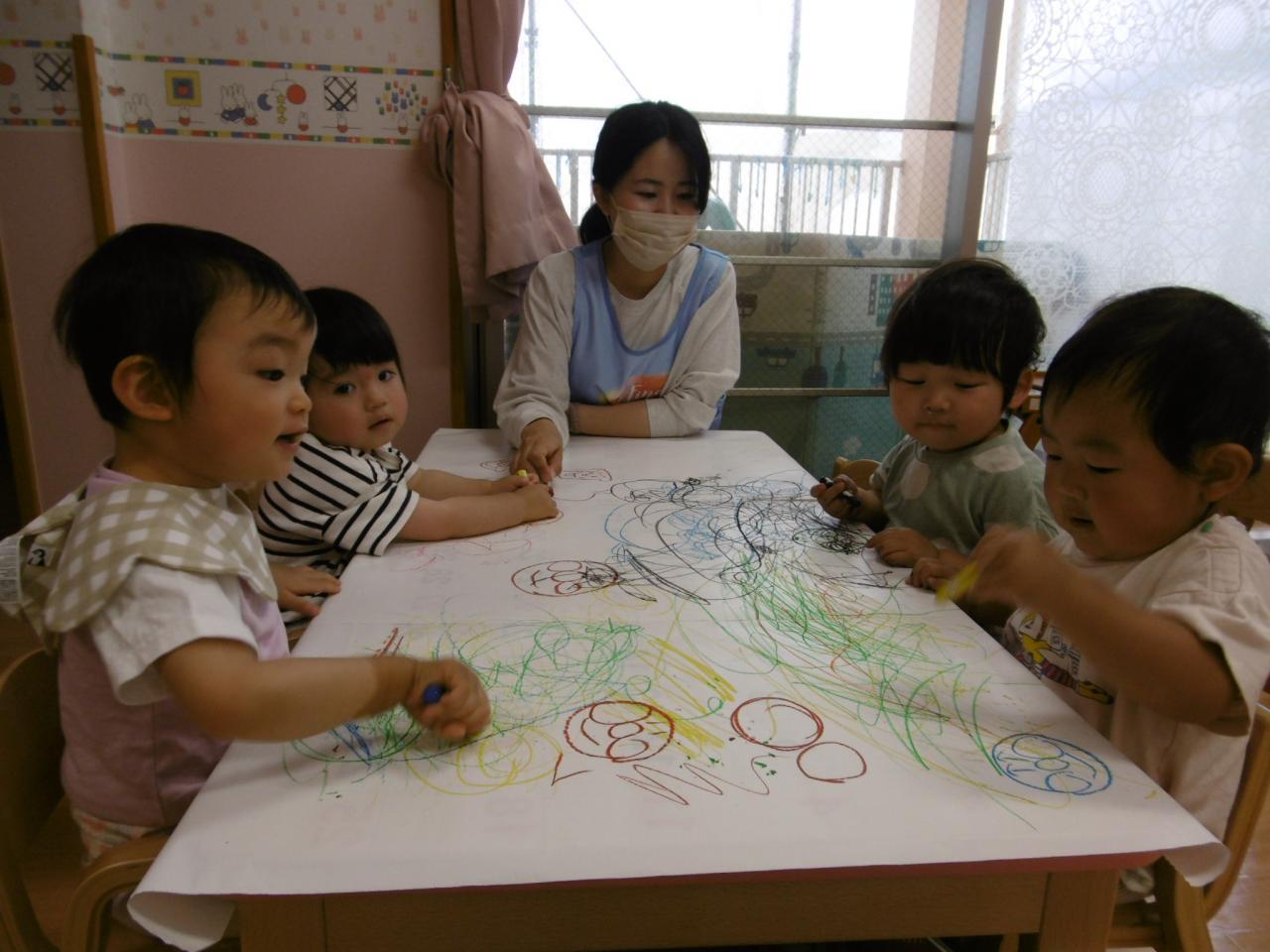 グルグルと描いたり腕を大きく動かしていっぱい線を描く子、保育士に描いてもらったアンパンマンの頬を塗っている子などそれぞれ好きな色を使って思い思いにお絵描きを楽しんでいる姿が見られました。