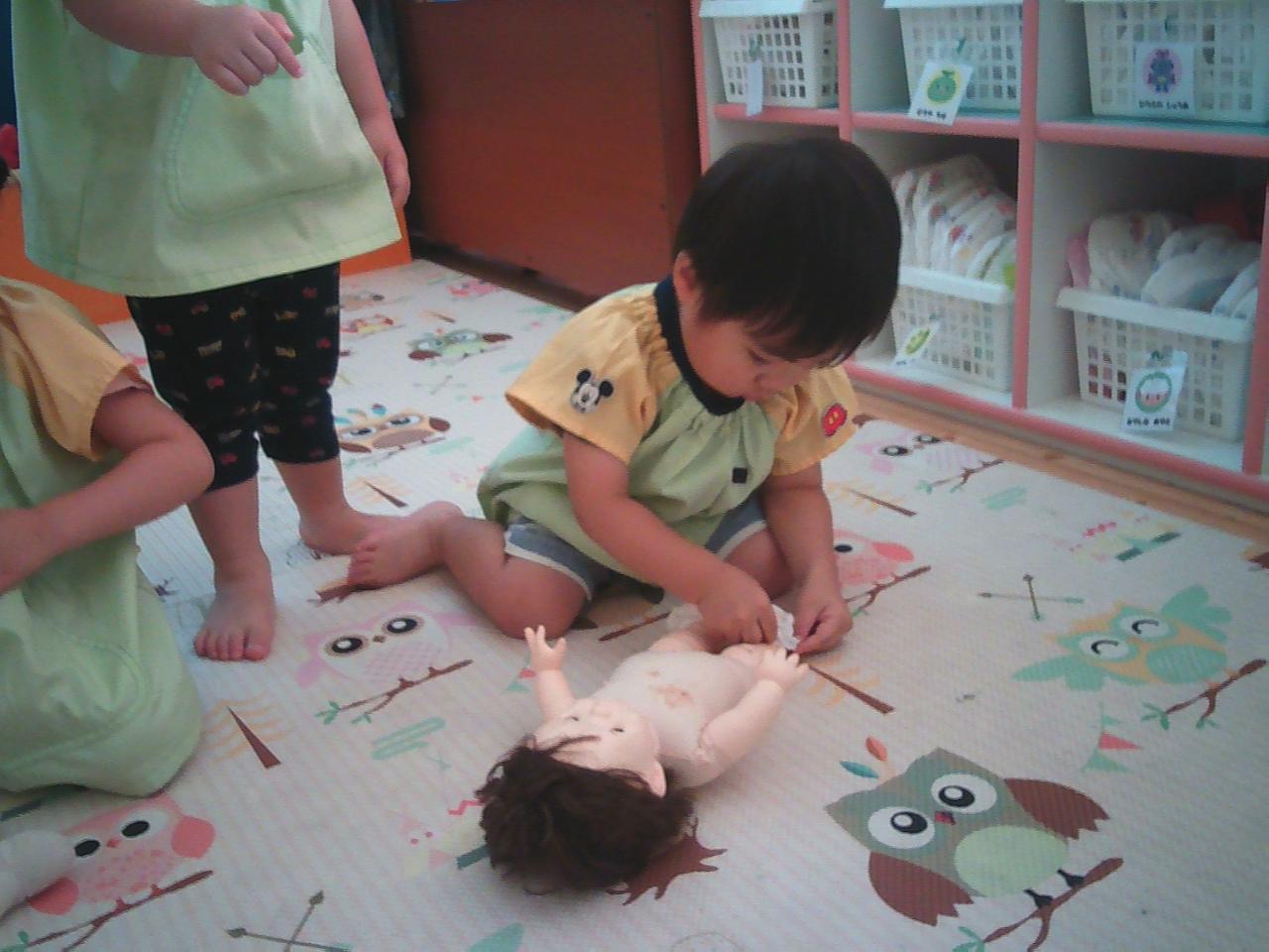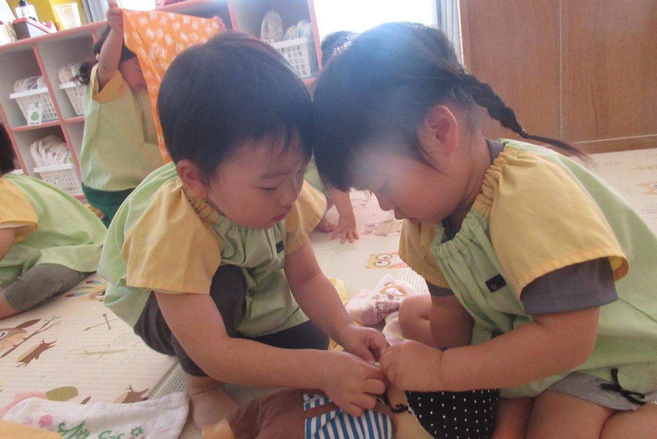 お人形の服や、お布団を一緒に洗おうと伝えると「頑張るぞー!!」と