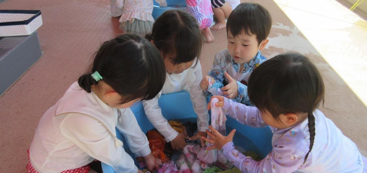 保育者が洗い方のお手本を見せると真似をして力強く洗ったり