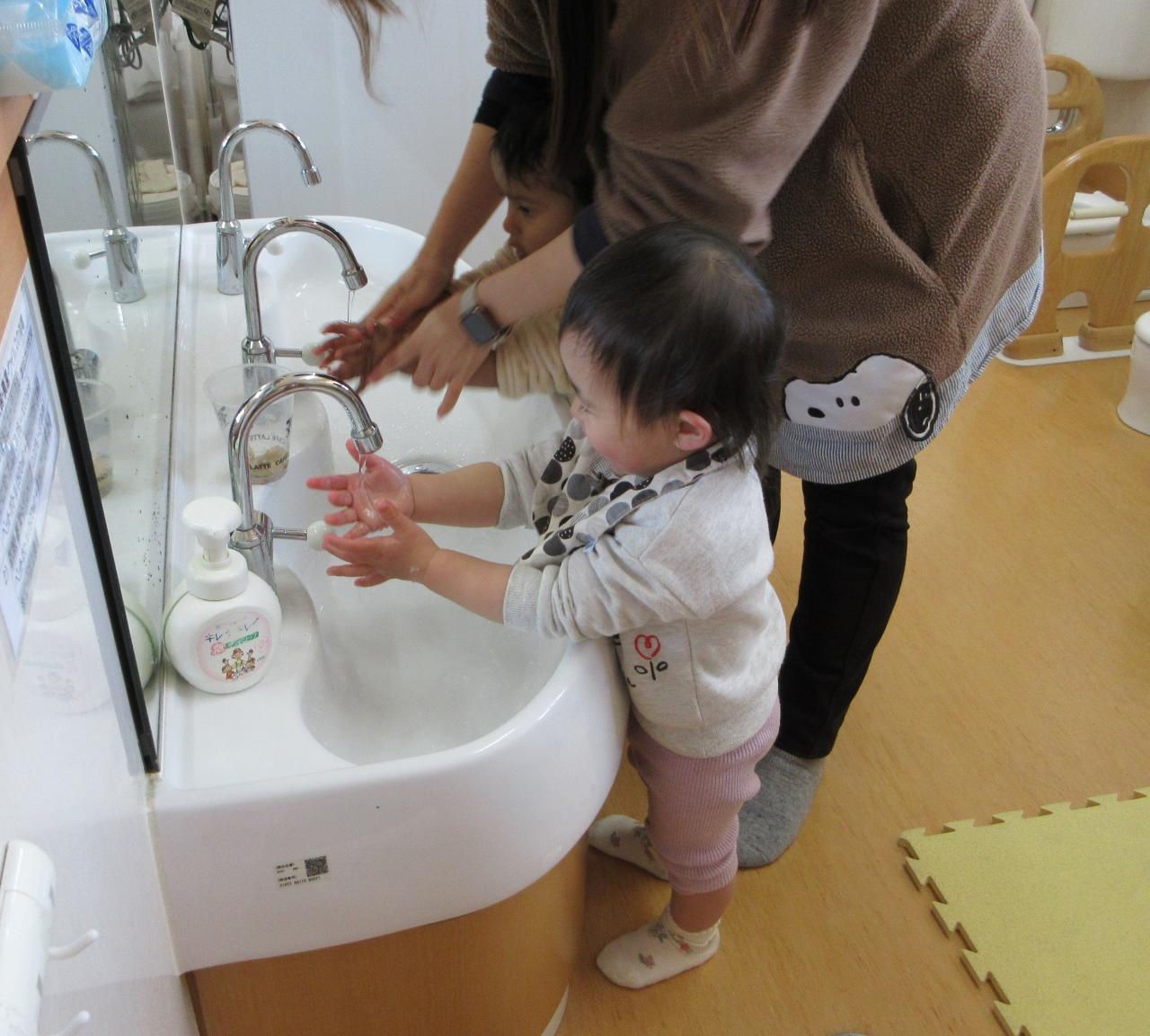 テラスで遊んだ後は手洗いも頑張っています❗腕まくりをするのも自分で出来るさくら組さん💕石けんでゴシゴシ一緒に手洗いを頑張っているところです!