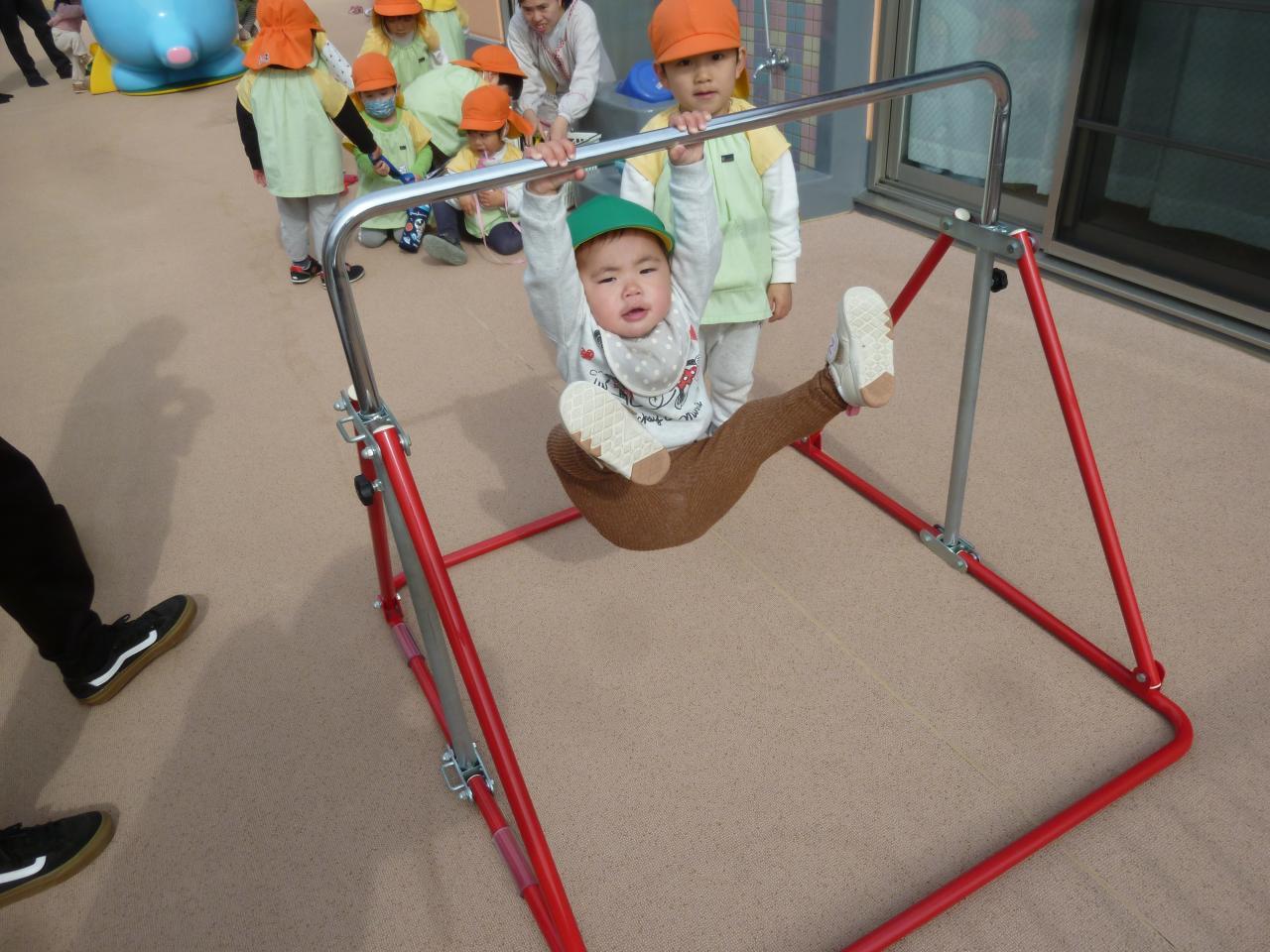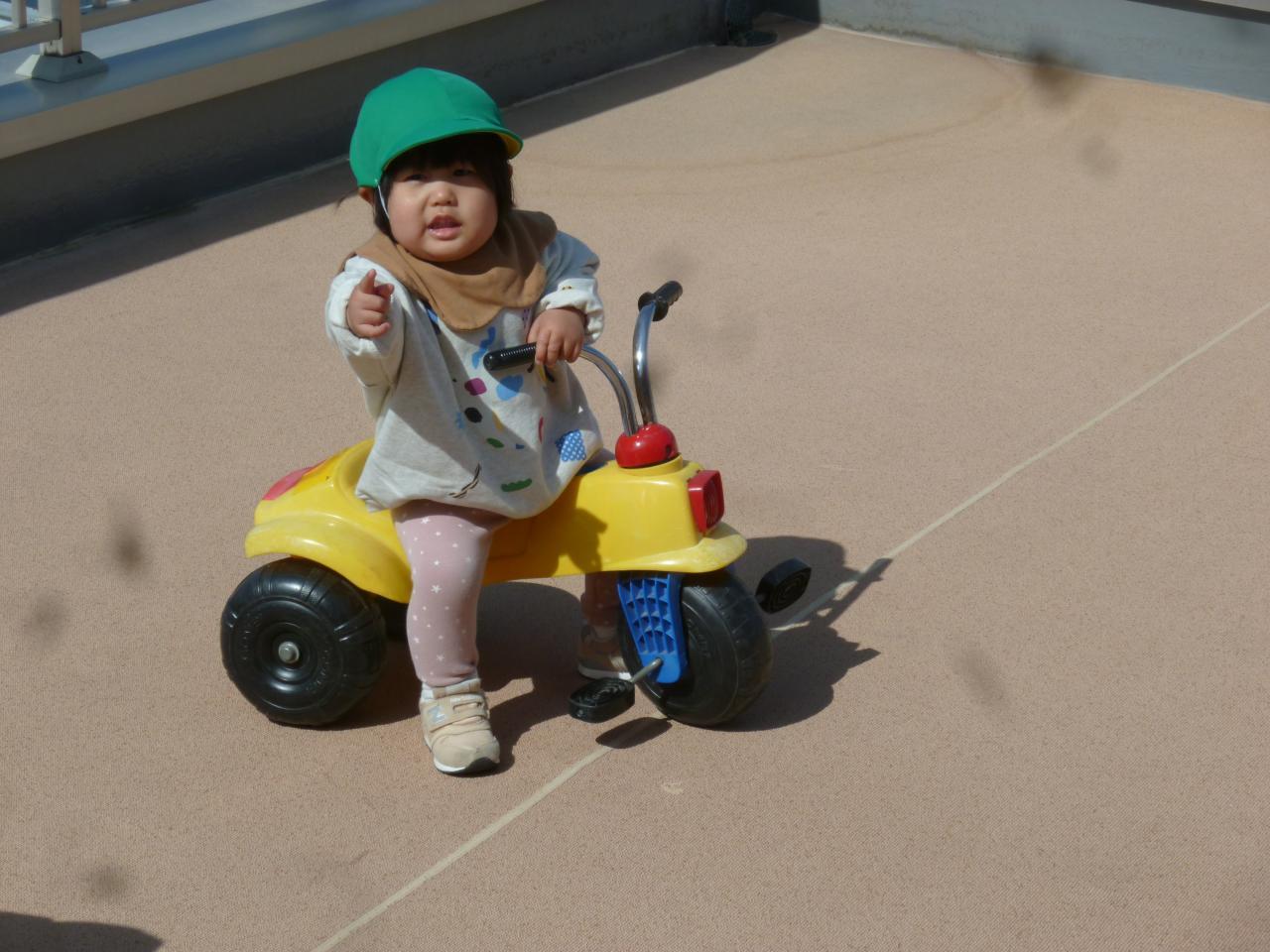 すべり台や三輪車、時に鉄棒やミニアスレチックなどテラスで色々な遊びを楽しんでいます😝