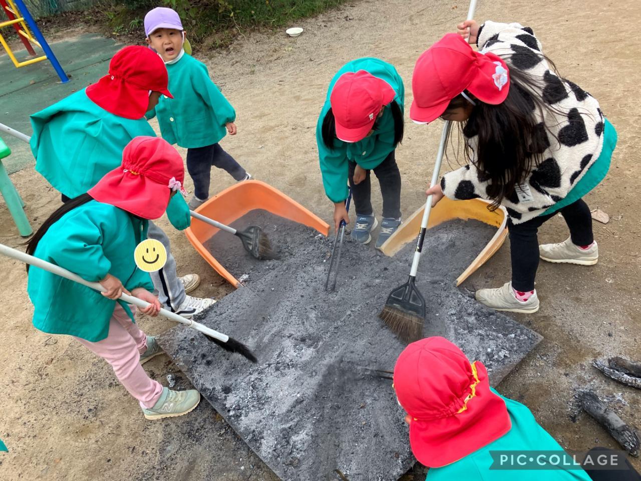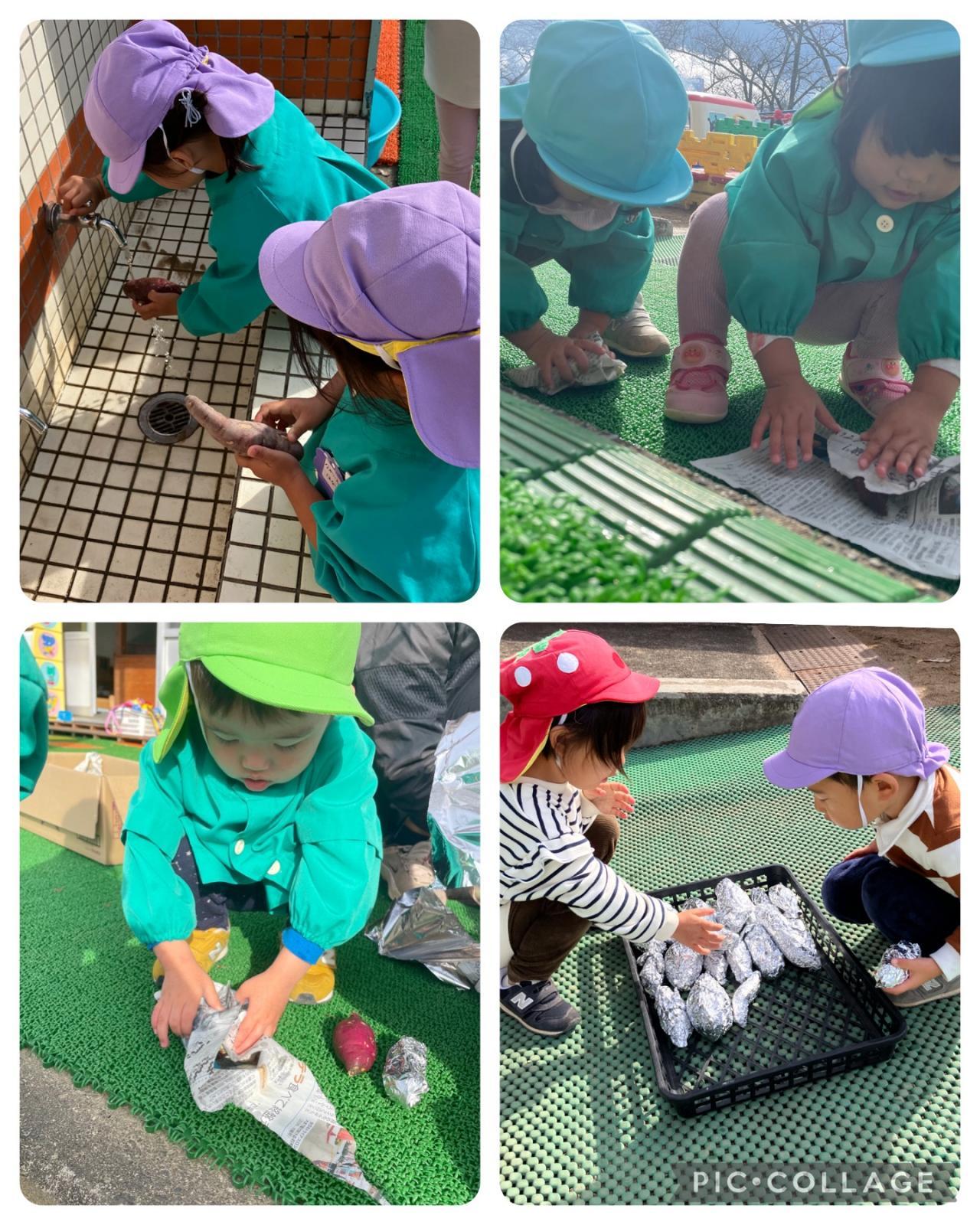 火ばさみを使ってお芋を1人ずつ入れていきました。「まだかな、まだかな〜」園庭で遊びながら楽しみに待つ子ども達でした!