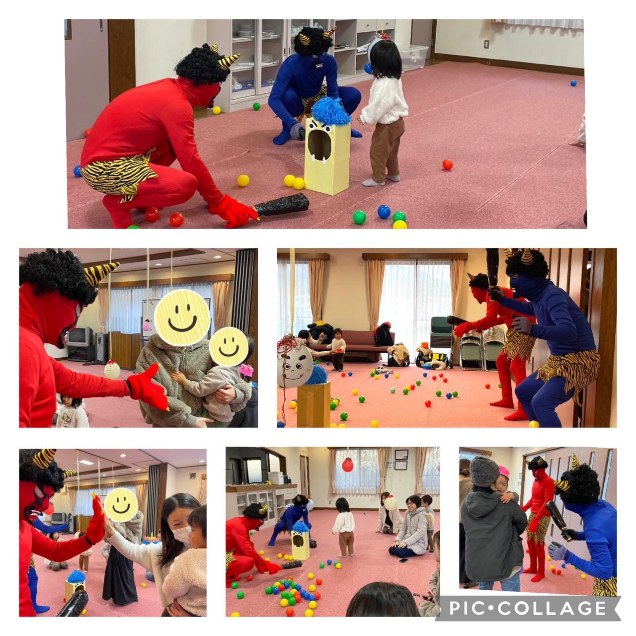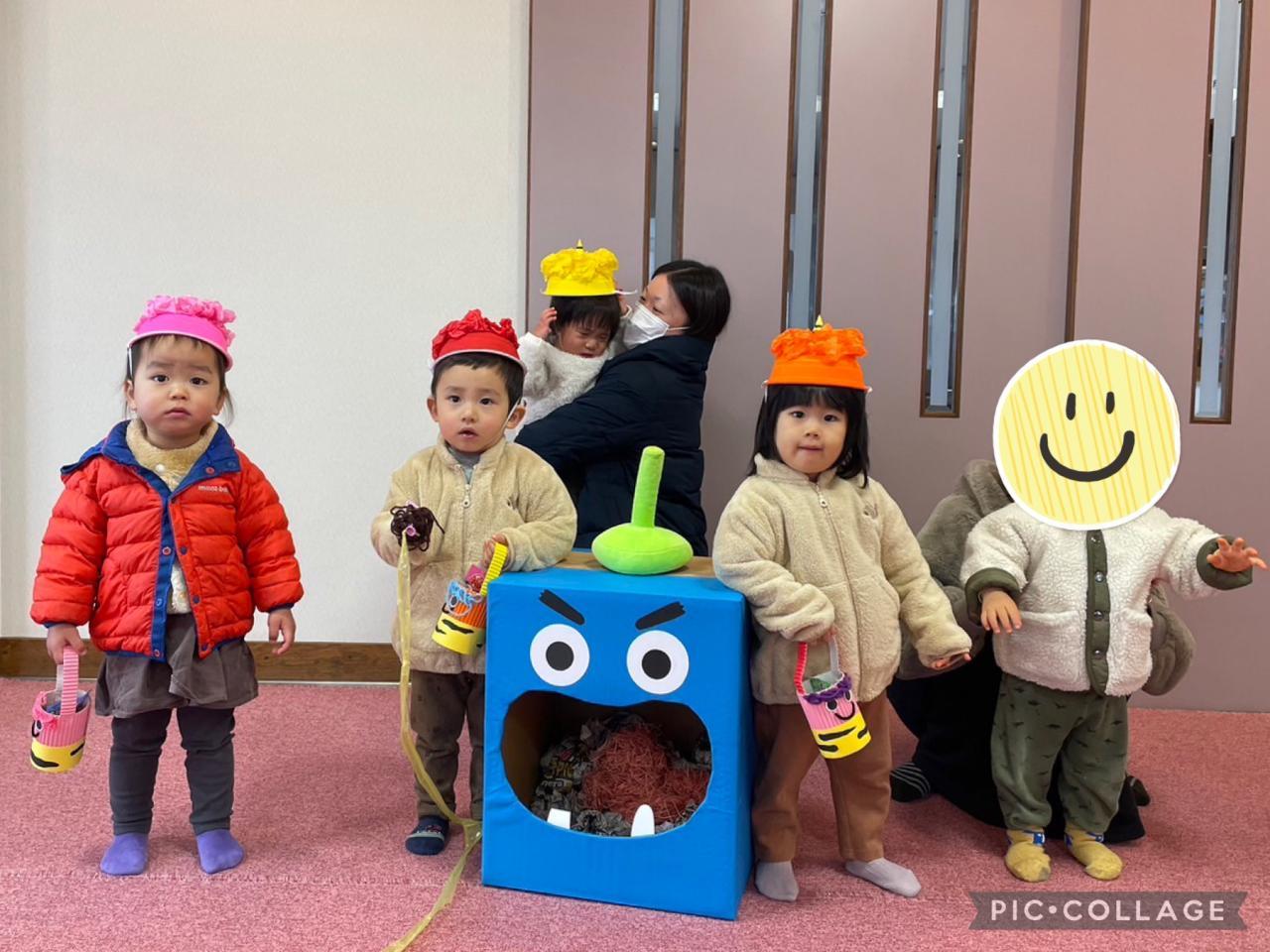 今では豆まきをしないというお家もあるようですが、今日はバンビ教室で豆まきあそびの鬼退治をしました。