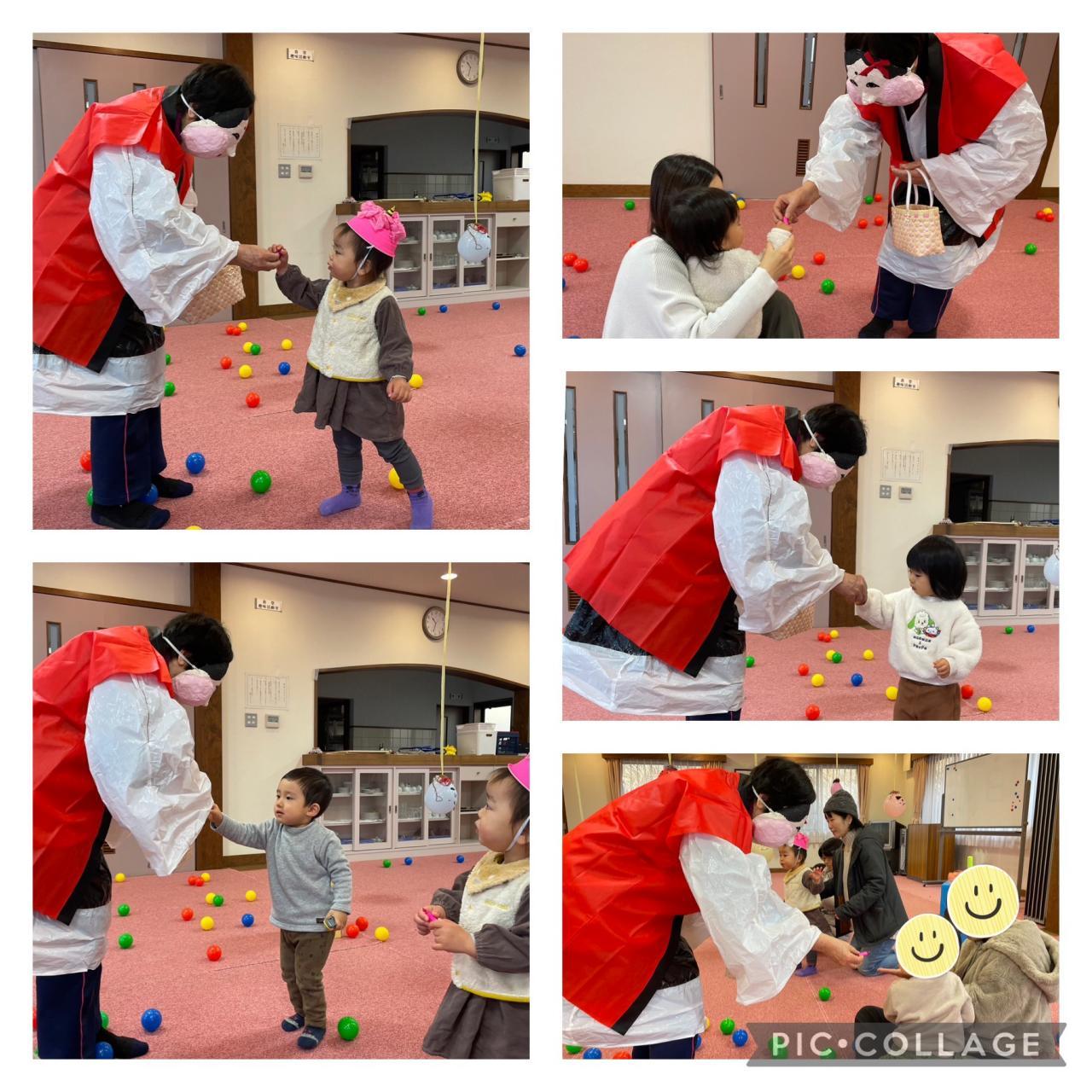 怖いけどちょっと優しい鬼さんが帰った後に、とっても優しい福の神さんがやって来て、良い子たちに元気で大きくなってねとおかしをもらいました。