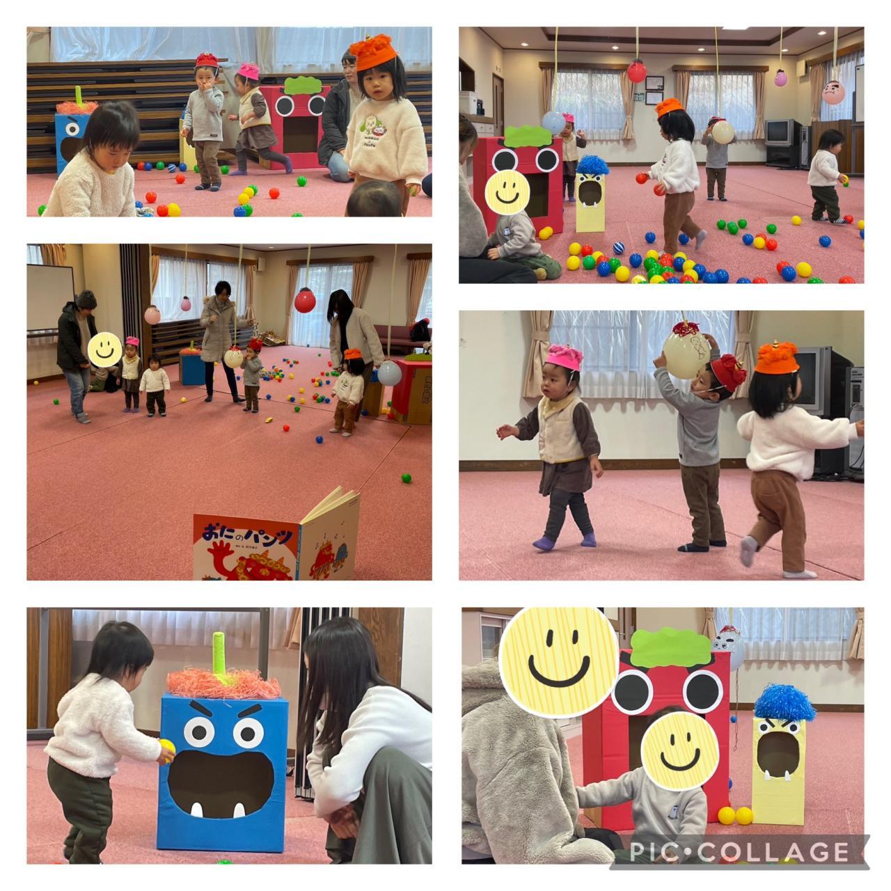 鬼の口にボールを投げ入れたり、天井からぶら下がっている風船鬼をパンチでやっつけて遊びました。