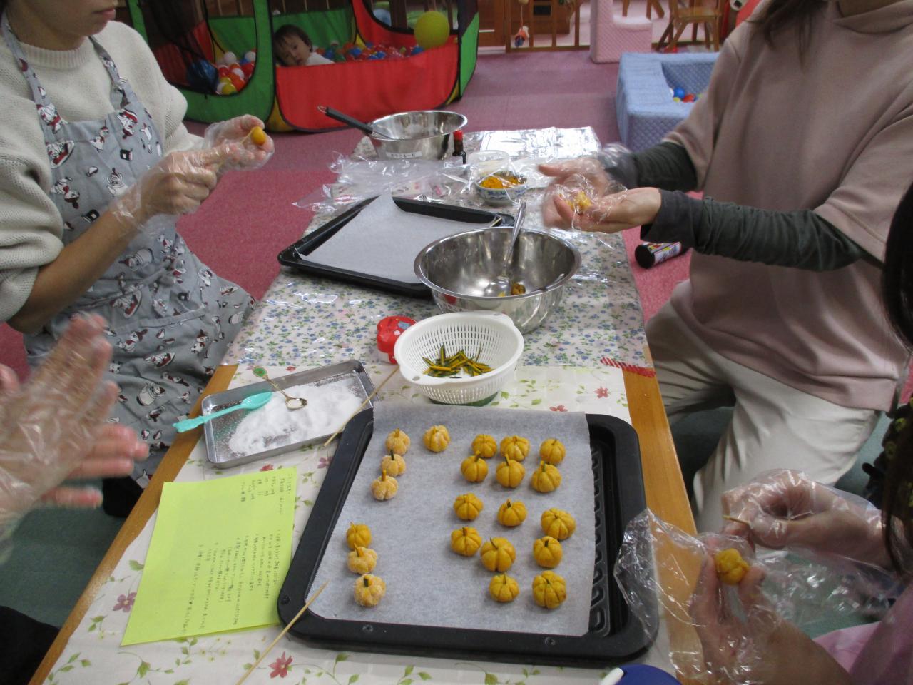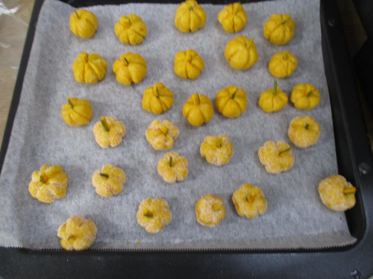 コロコロクッキーはカボチャと粉を練り小さく丸めます それから竹串で線を入れてかぼちゃっぽく
