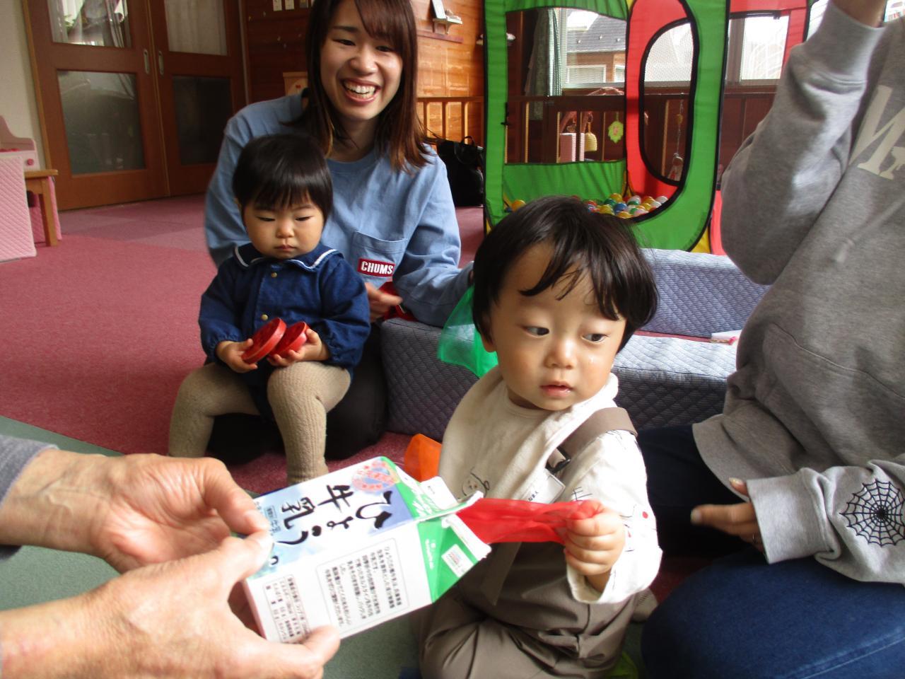 出来たてほやほやの牛乳パックのどんぐり入れを持って出発!