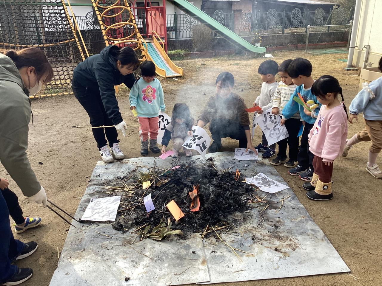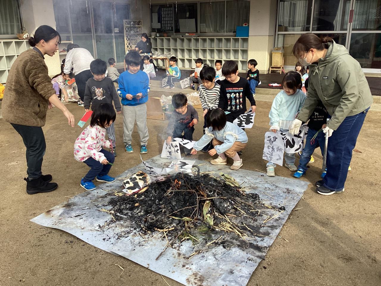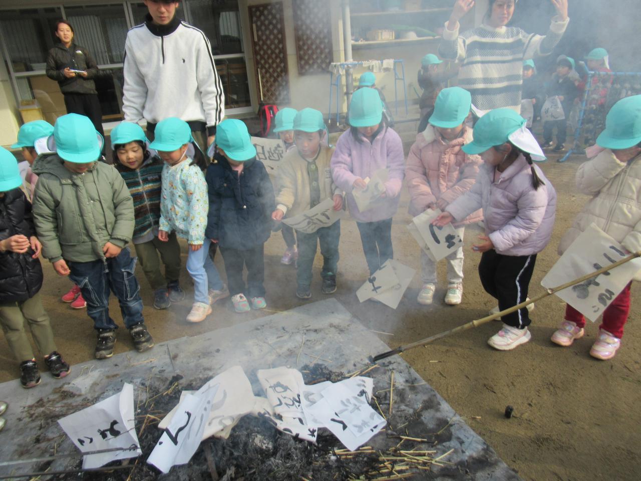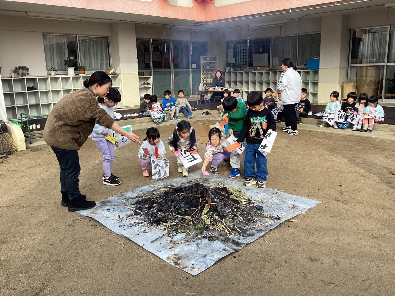 みんなが書いた書初めも一人ずつ燃やしました。燃えた灰がたくさん上がると字がうまくなると言った言い伝えもあり、みんなで高く上がるのを見届けました😳その後は、お餅や焼きみかんもいただき「美味しい~!🍊」と喜んで食べながら、今年一年の無病息災も祈りました。