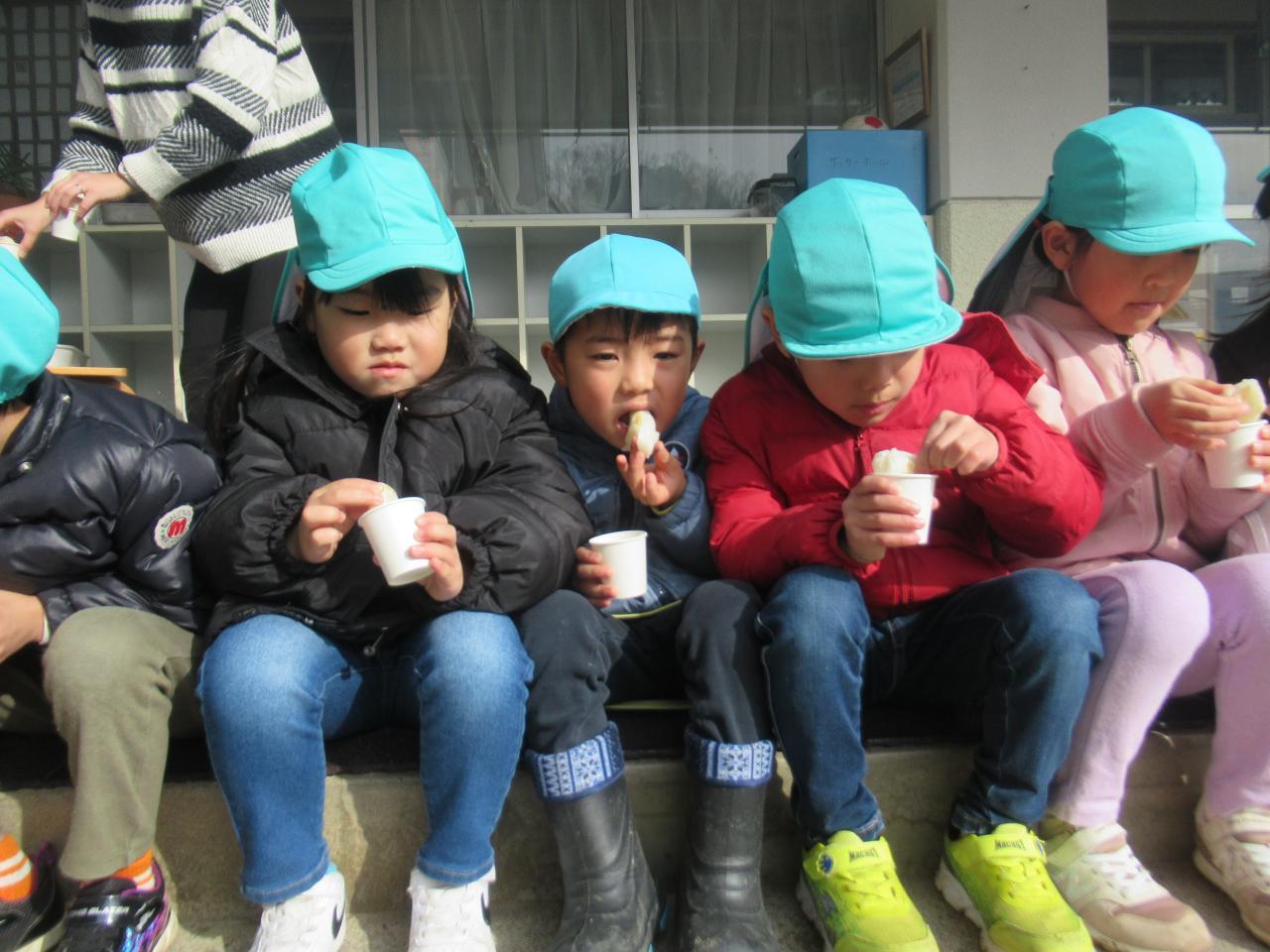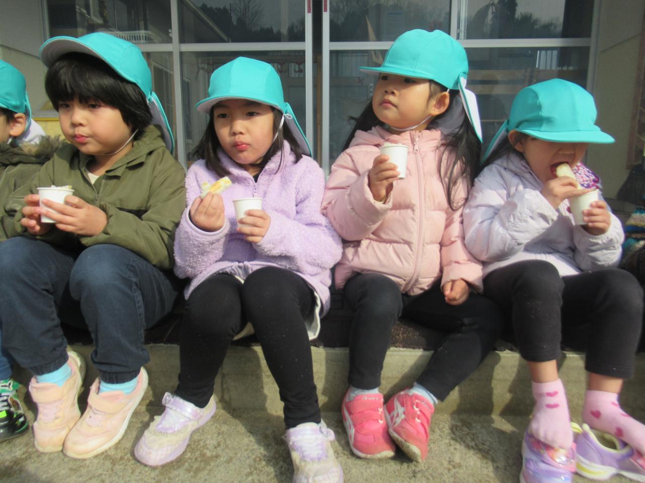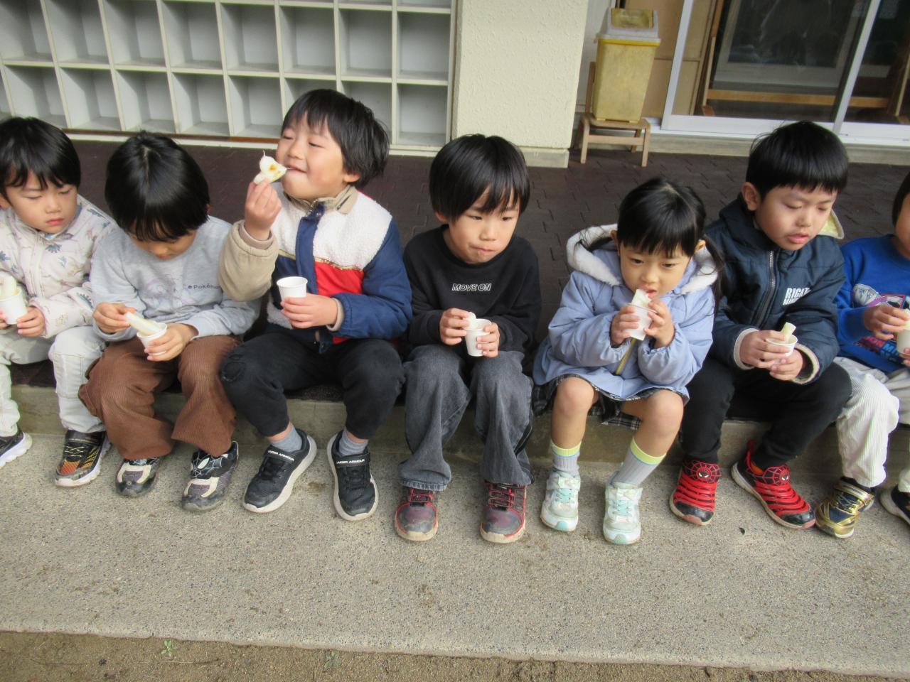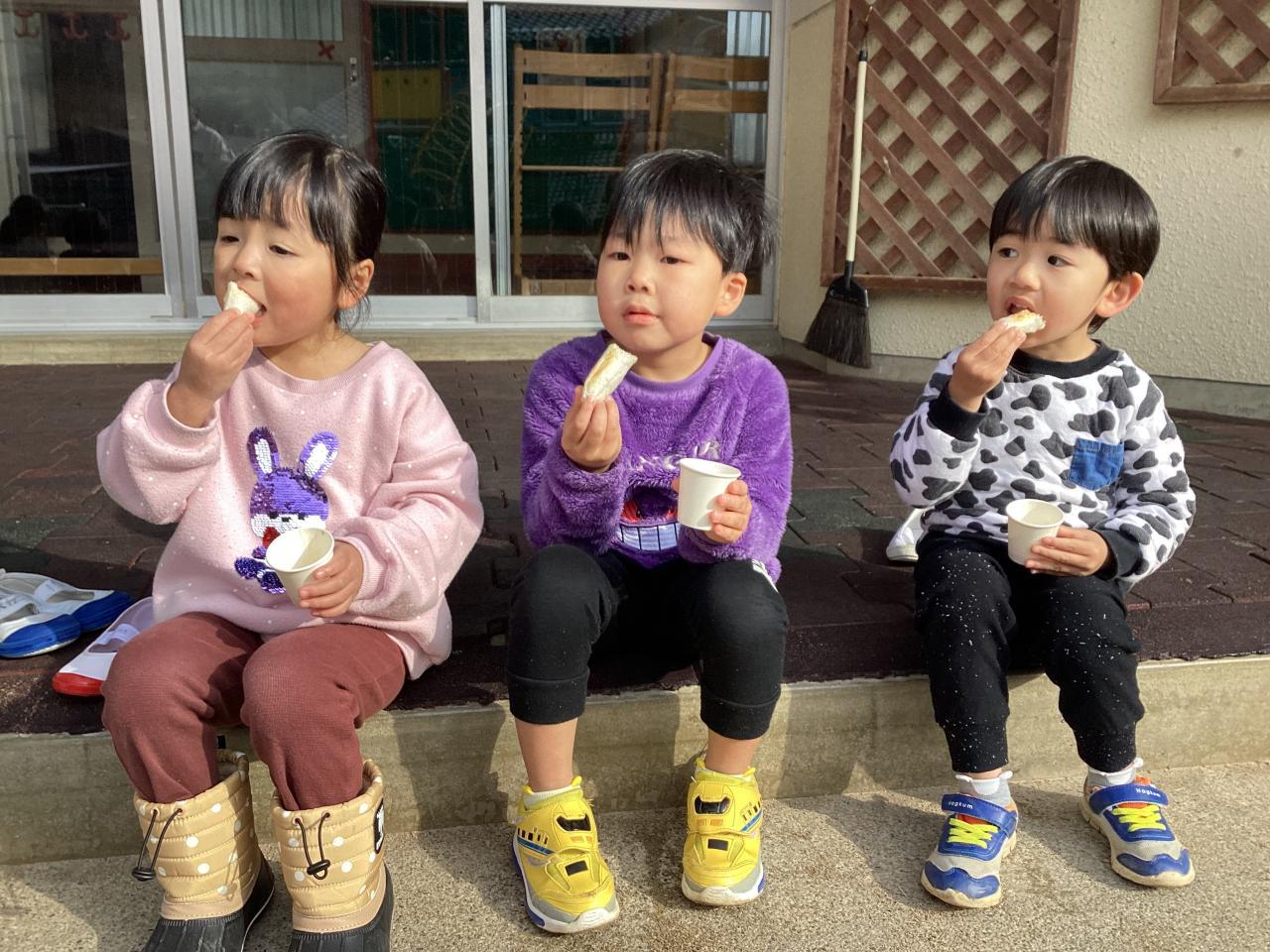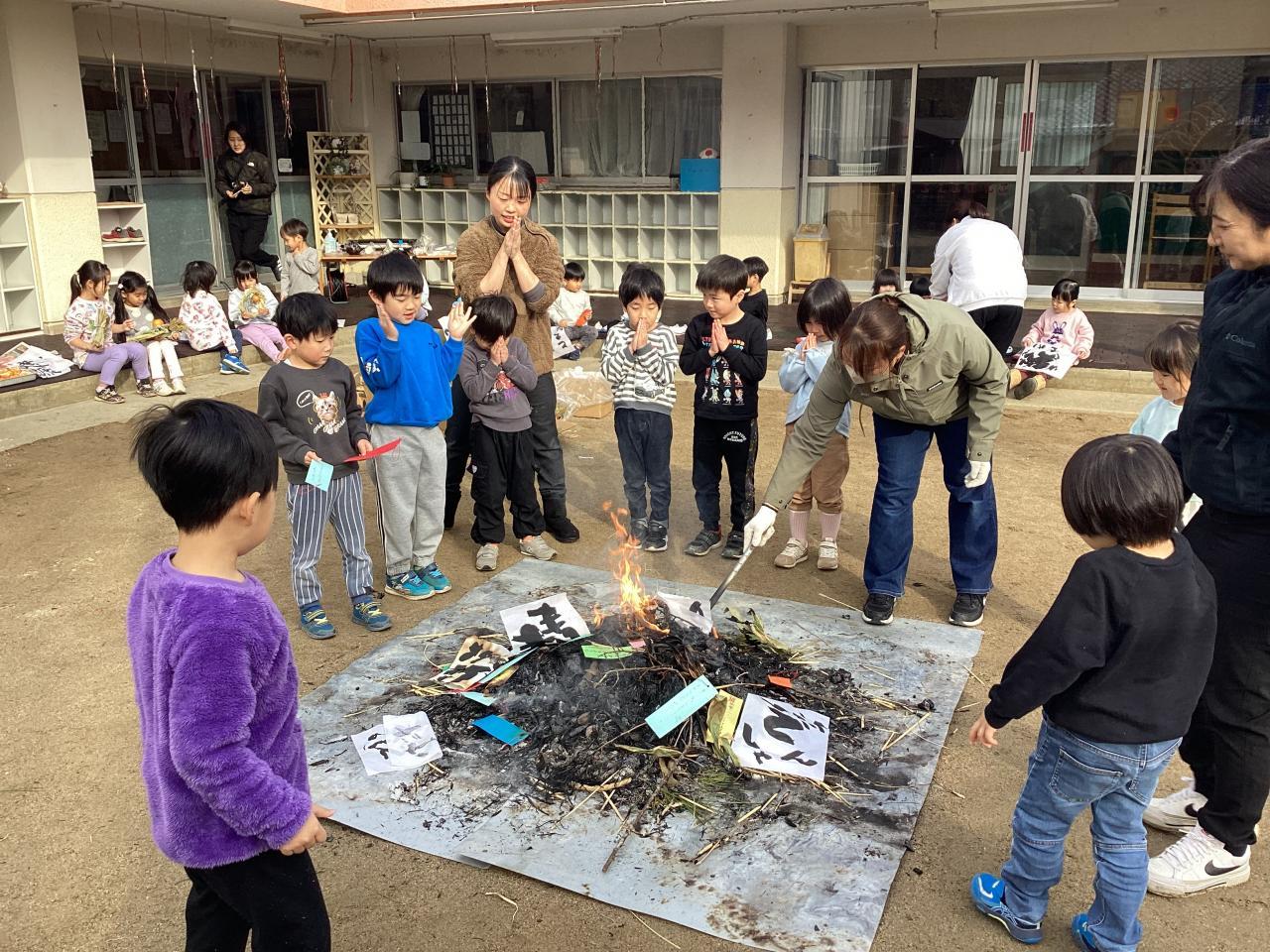 みんなが書いた書初めも一人ずつ燃やしました。燃えた灰がたくさん上がると字がうまくなると言った言い伝えもあり、みんなで高く上がるのを見届けました😳その後は、お餅や焼きみかんもいただき「美味しい~!🍊」と喜んで食べながら、今年一年の無病息災も祈りました。