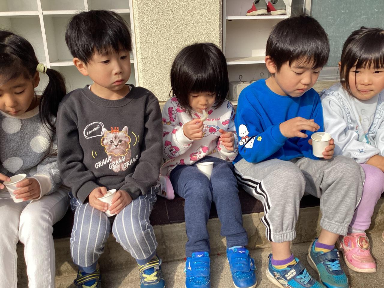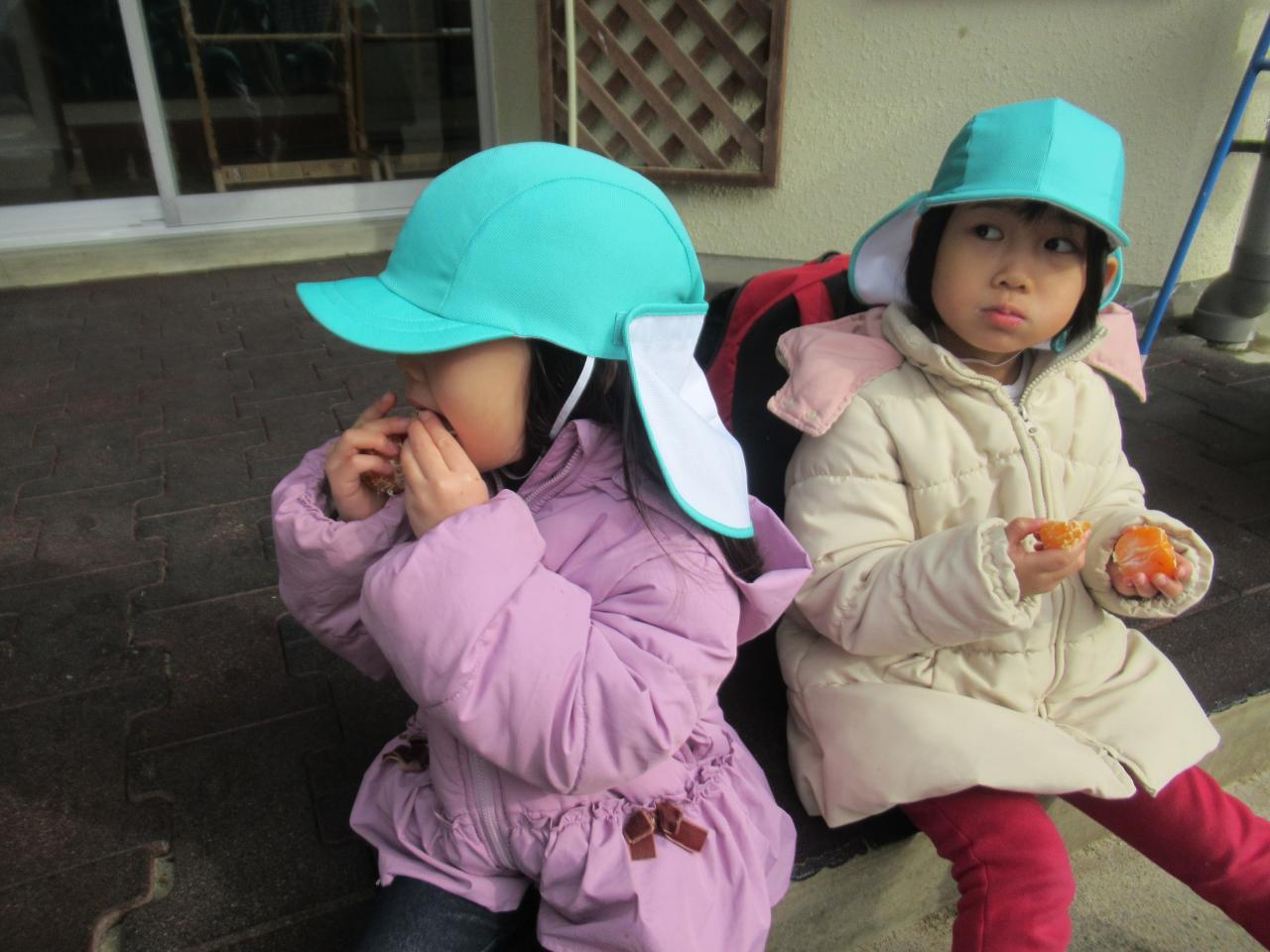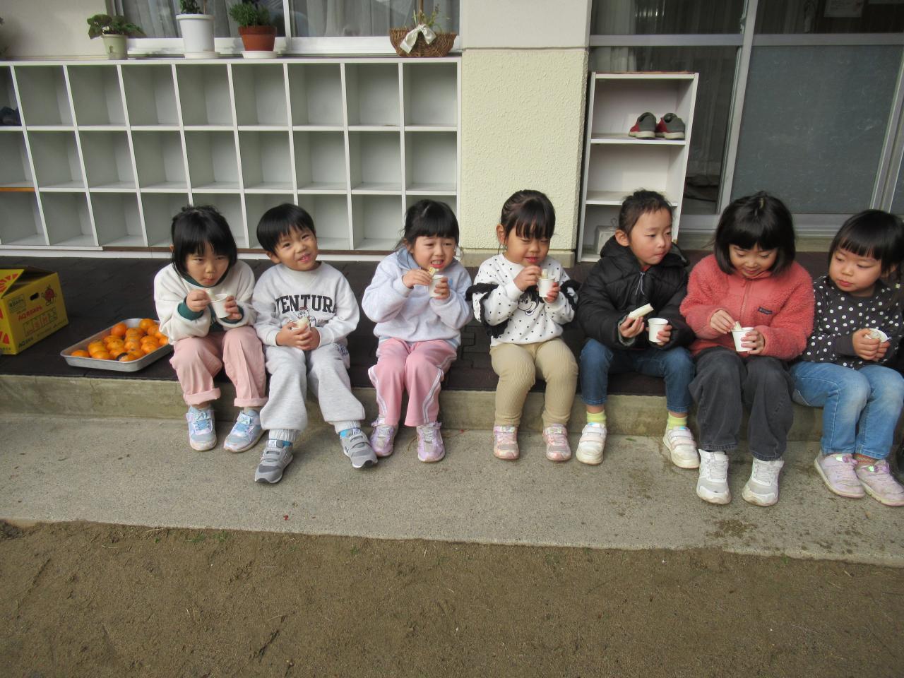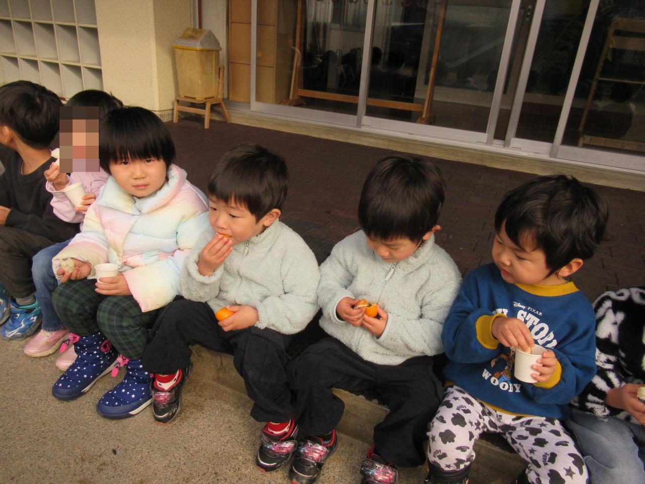 みんなが書いた書初めも一人ずつ燃やしました。燃えた灰がたくさん上がると字がうまくなると言った言い伝えもあり、みんなで高く上がるのを見届けました😳その後は、お餅や焼きみかんもいただき「美味しい~!🍊」と喜んで食べながら、今年一年の無病息災も祈りました。