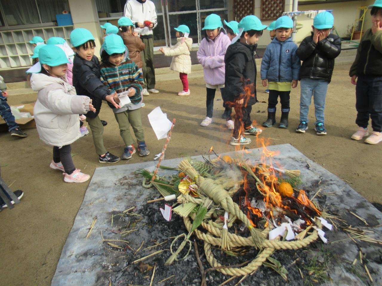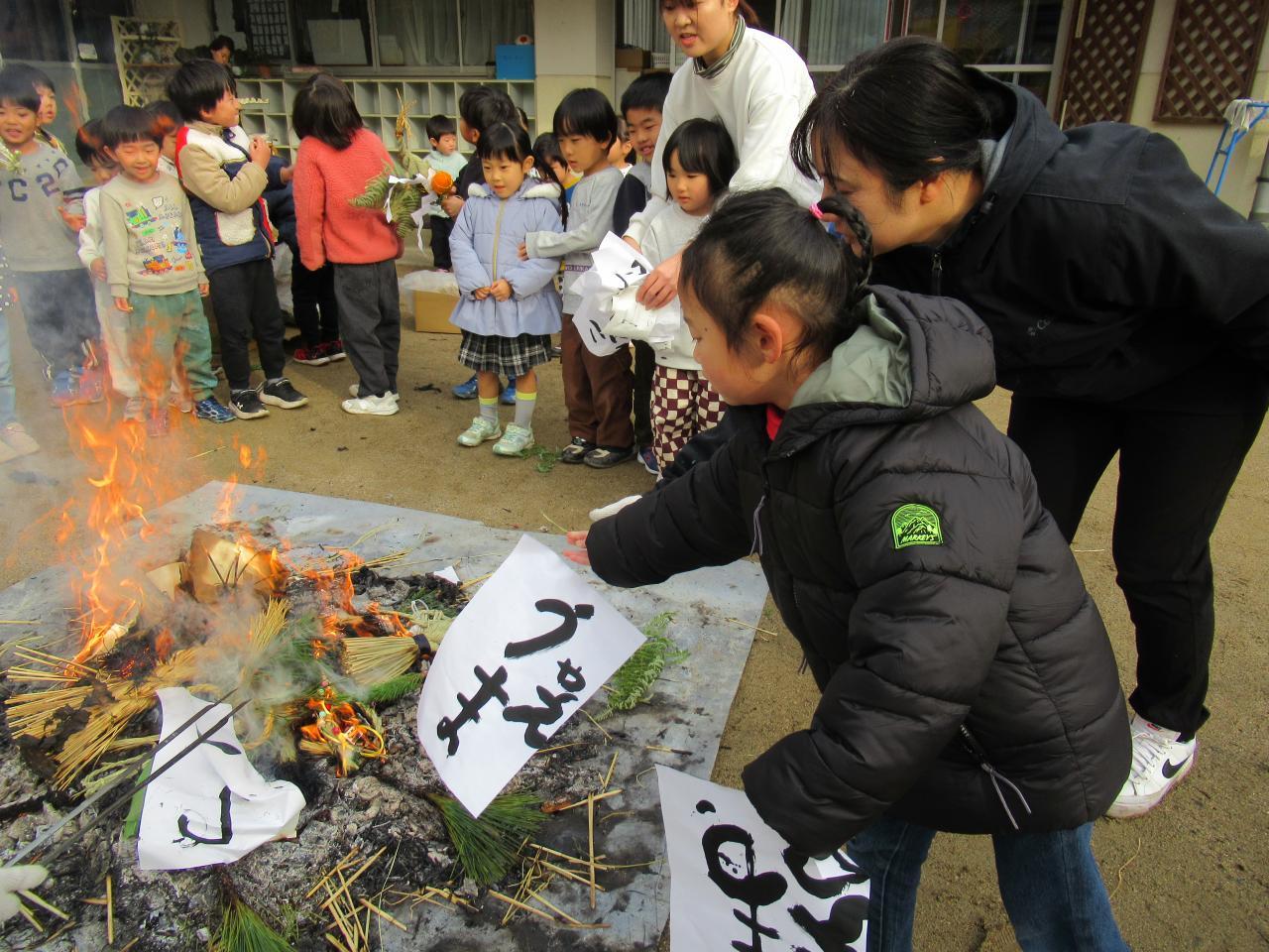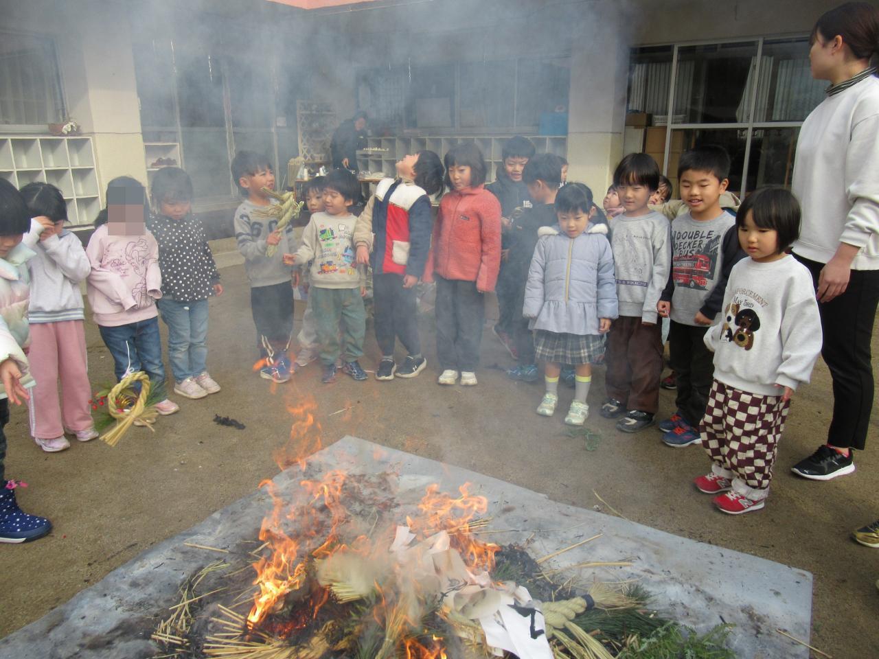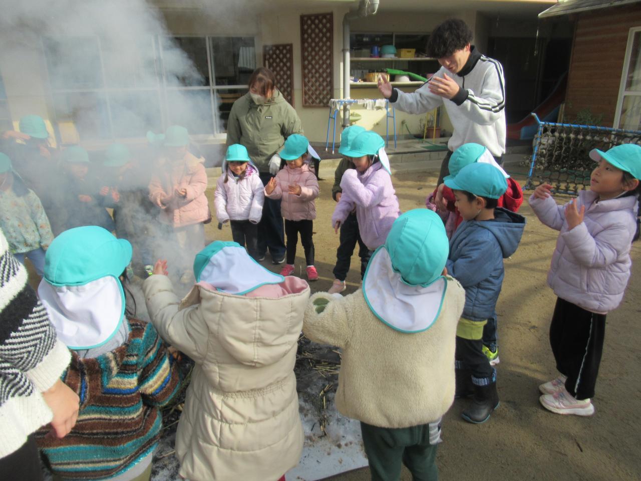 どんど焼きとは、年神様に一年間の災いを払い、豊作や無病息災を願う行事です。また、正月飾りを燃やすことで、お家や園に来てくれた年神様が煙にのって天に帰れますようにとった意味もあるそうです。