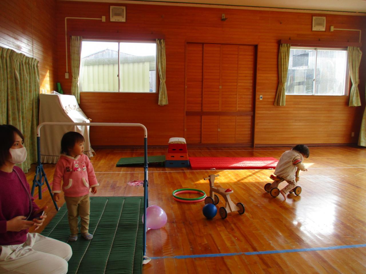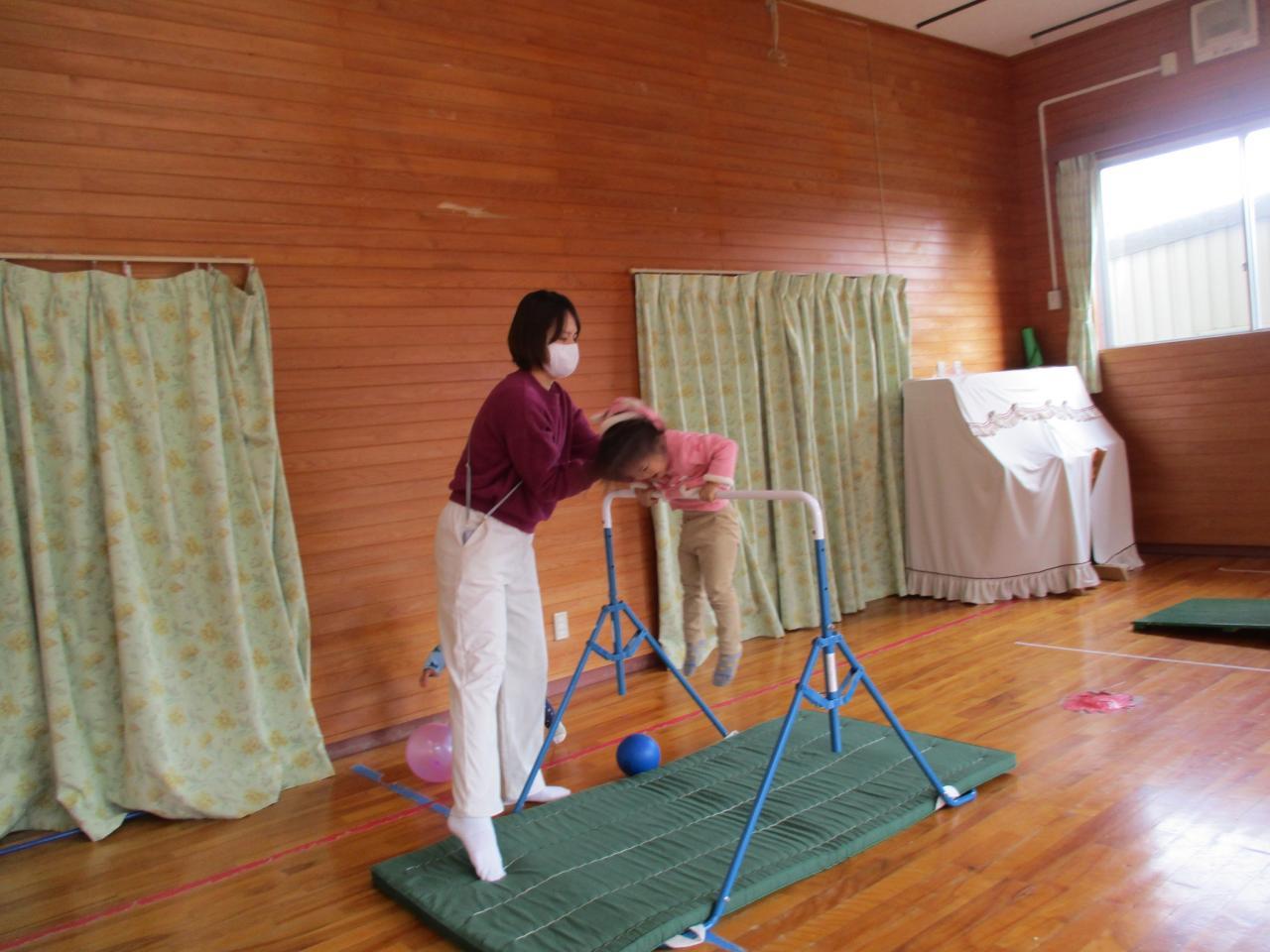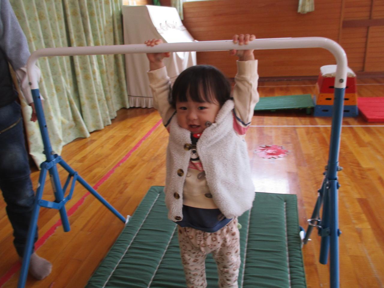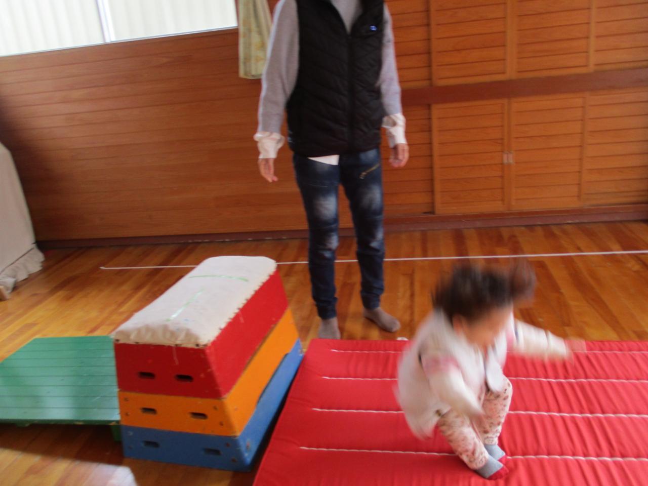 ホールでお母さんもいっしょに動いてもらいました ラジオ体操をしてから鉄棒・跳び箱・ロデイや