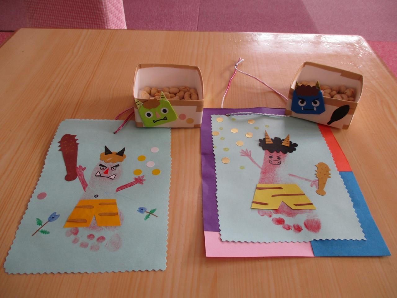 お母さんはマスを作ったり足型で鬼を作りました そのあと豆を外に向かっておには~そと ふくは~うちと