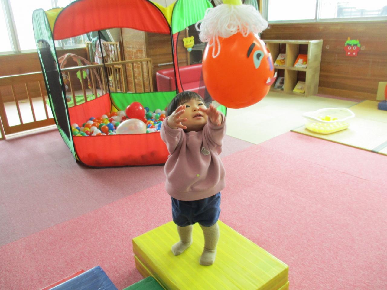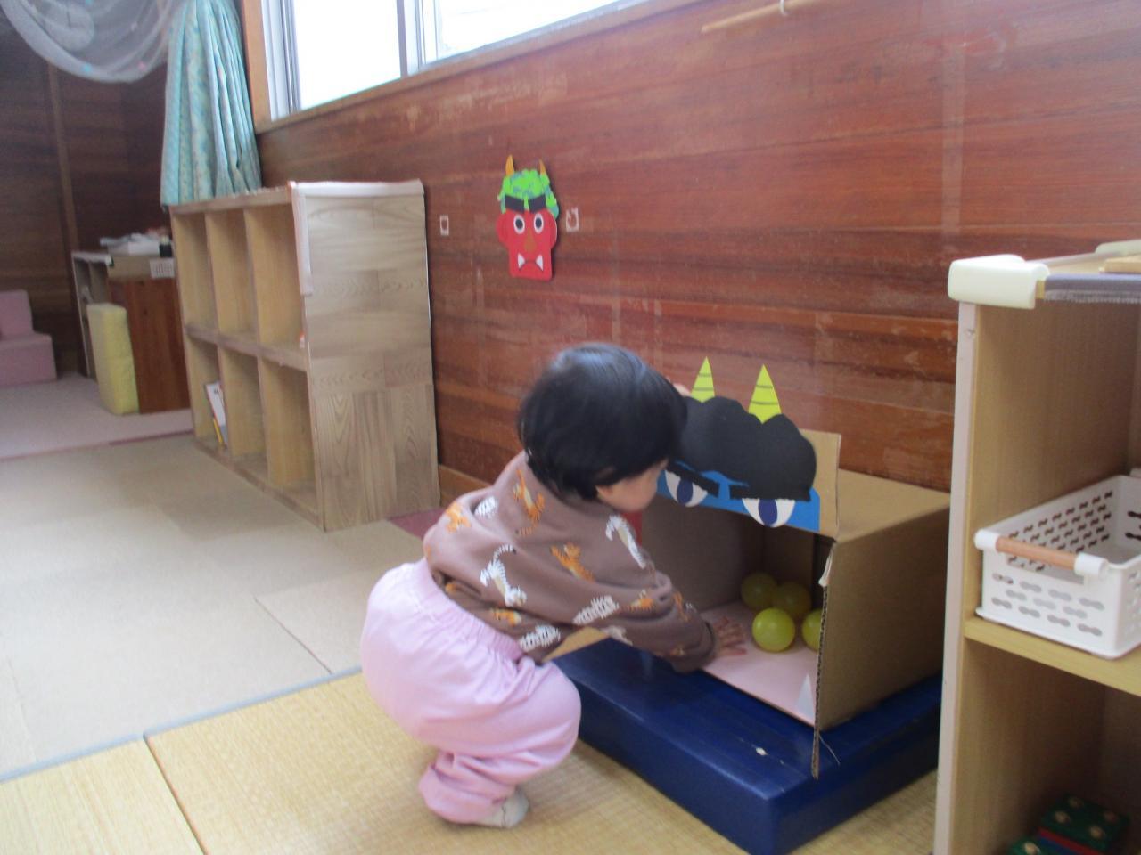 部屋に風船のおにや段ボールの鬼を準備し、風船おには手で段ボールおにはカラーボールでやっつけて遊ぶ