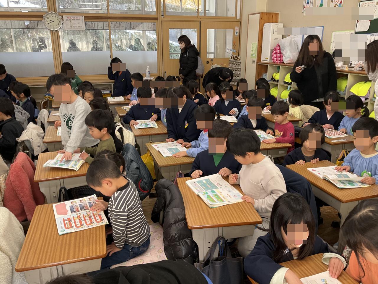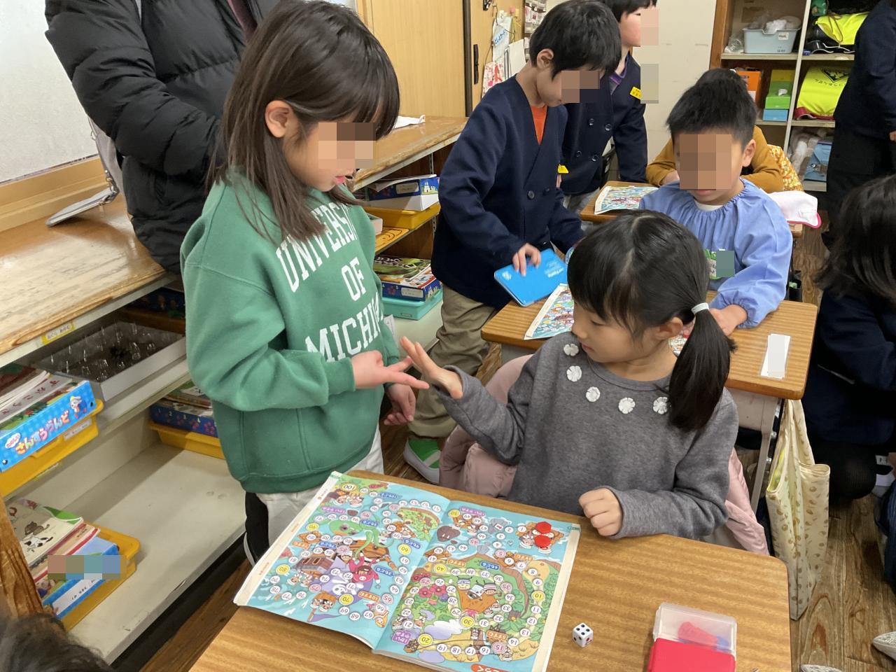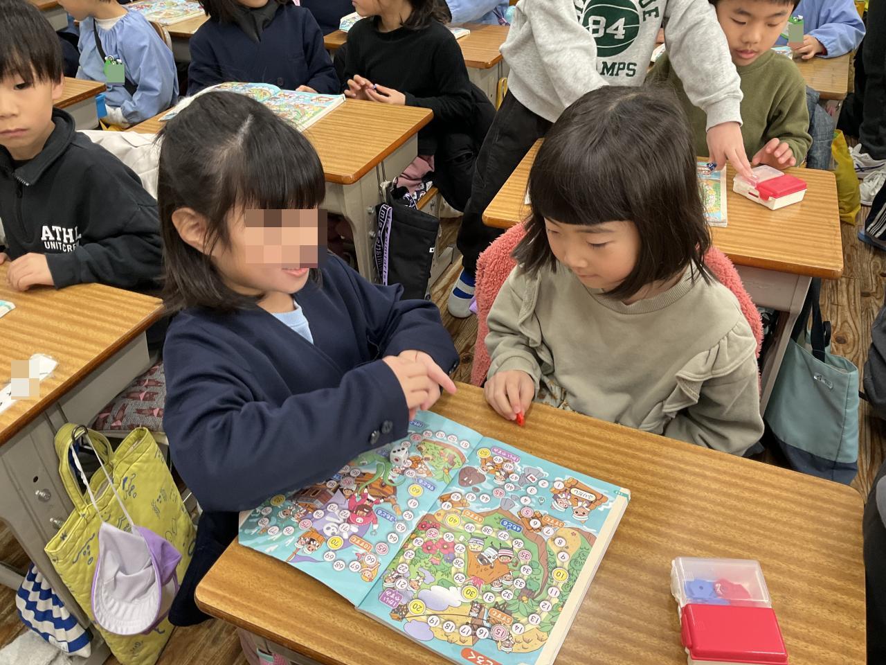 教室で教科書を見せてもらったり、すごろくをしたり、枚小のゆるキャラ”ひらっぴー”の塗り絵をしたりと楽しいひとときを過ごしました😌