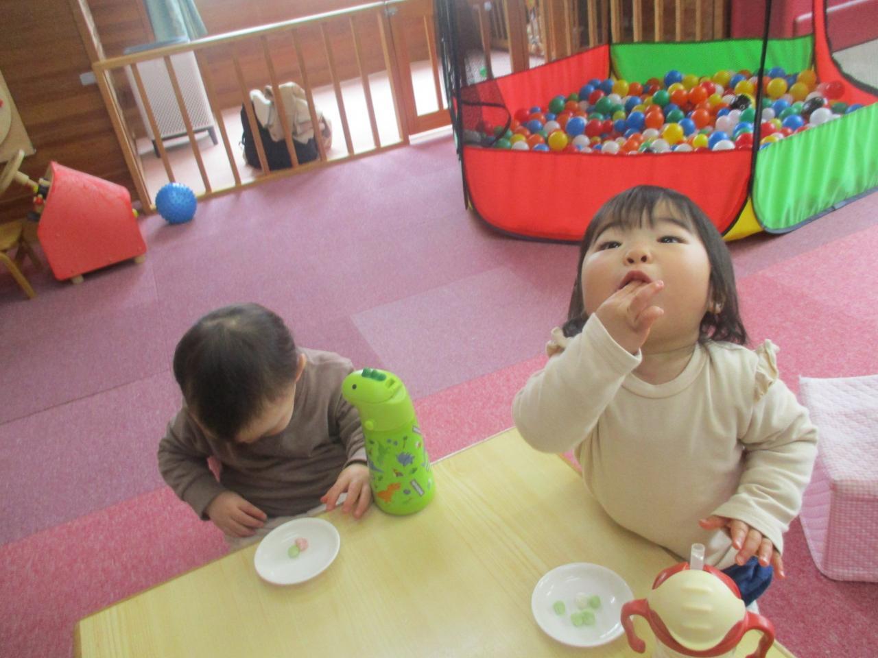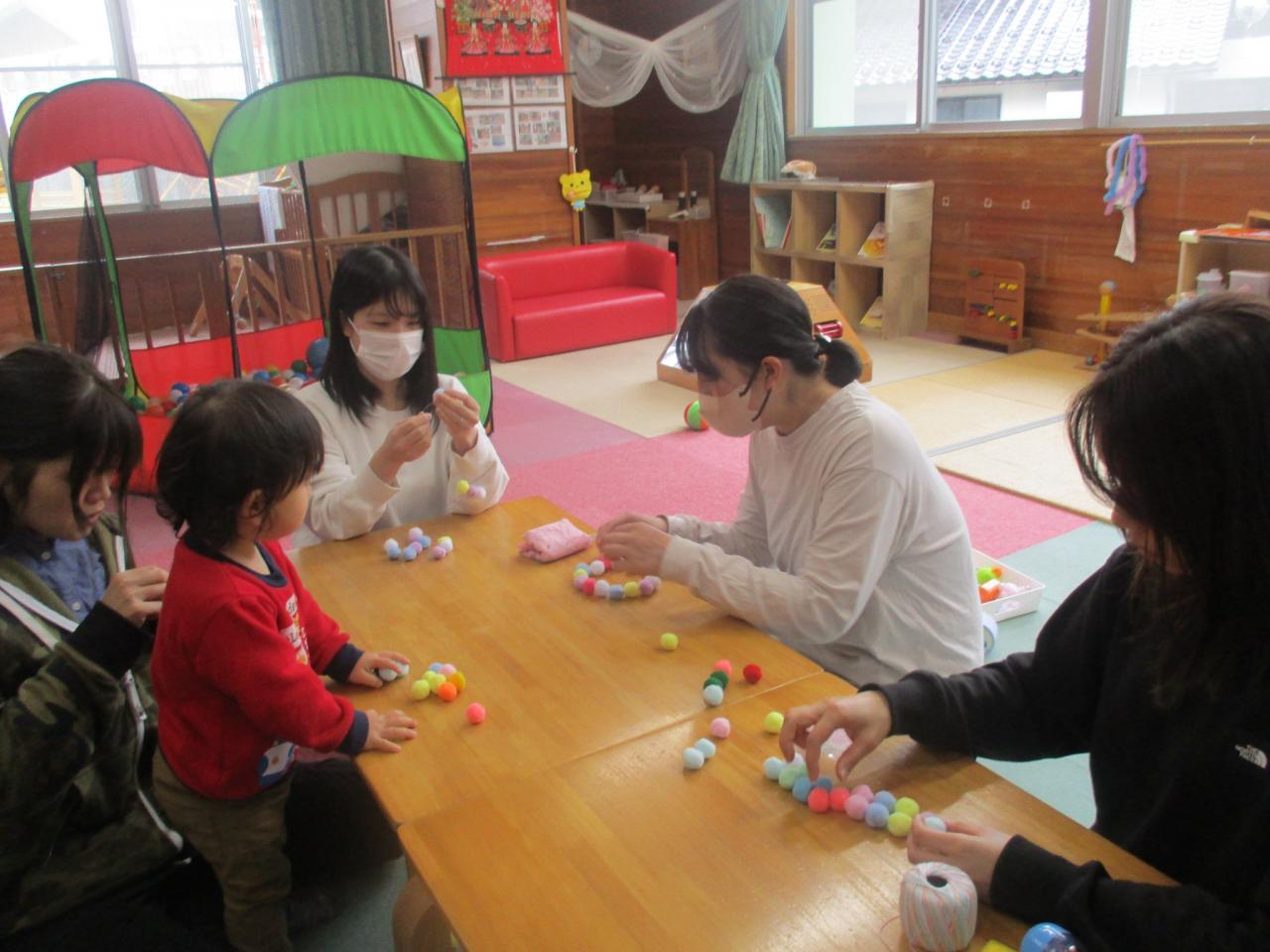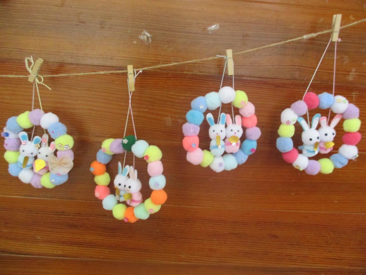 ポンポンを使ってリース作りをしました 真ん中にウサギのおひな様を作りぶらさげました